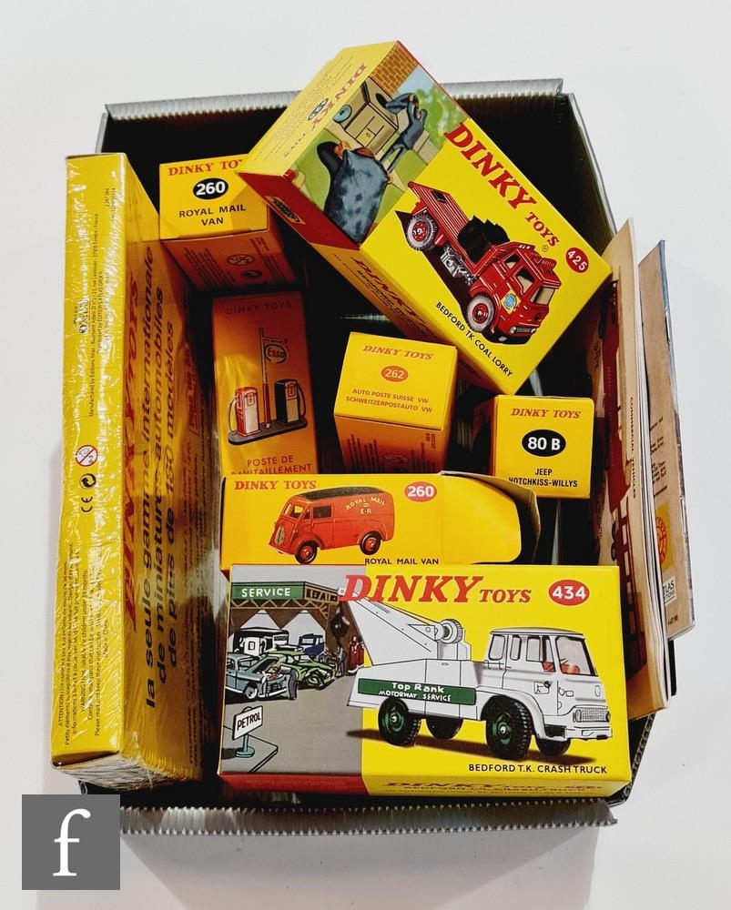 Nine Atlas Editions Dinky diecast models, to include 425 Bedford TK Coal Lorry, 434 Bedford TK Crash Truck, 262 Swiss Postal Volkswagen, 593 Road Signs, etc., with two reproduction catalogues. (11)