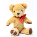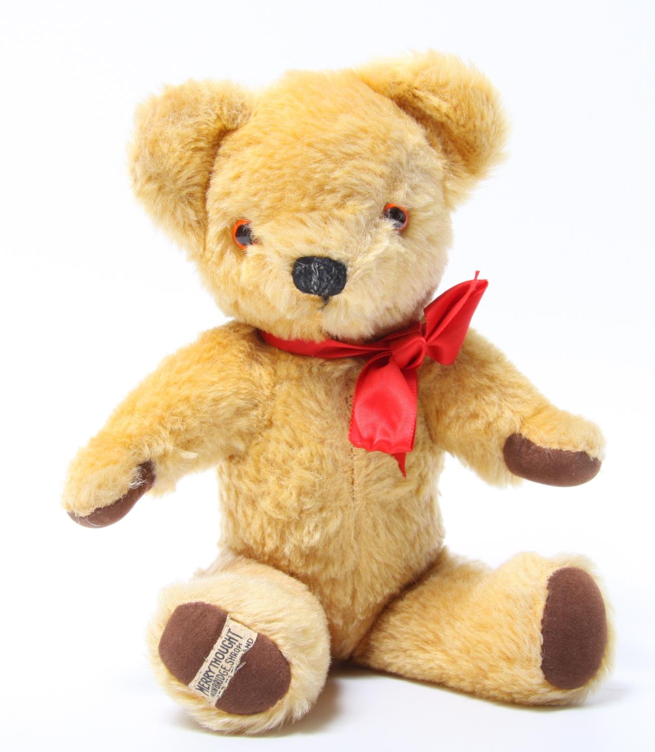 A Merrythought golden plush teddy bear, amber and black plastic eyes, vertically black stitched nose, brown velvet pads to hands and feet, Merrythought woven label to foot, 1970's 32cm tall