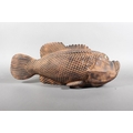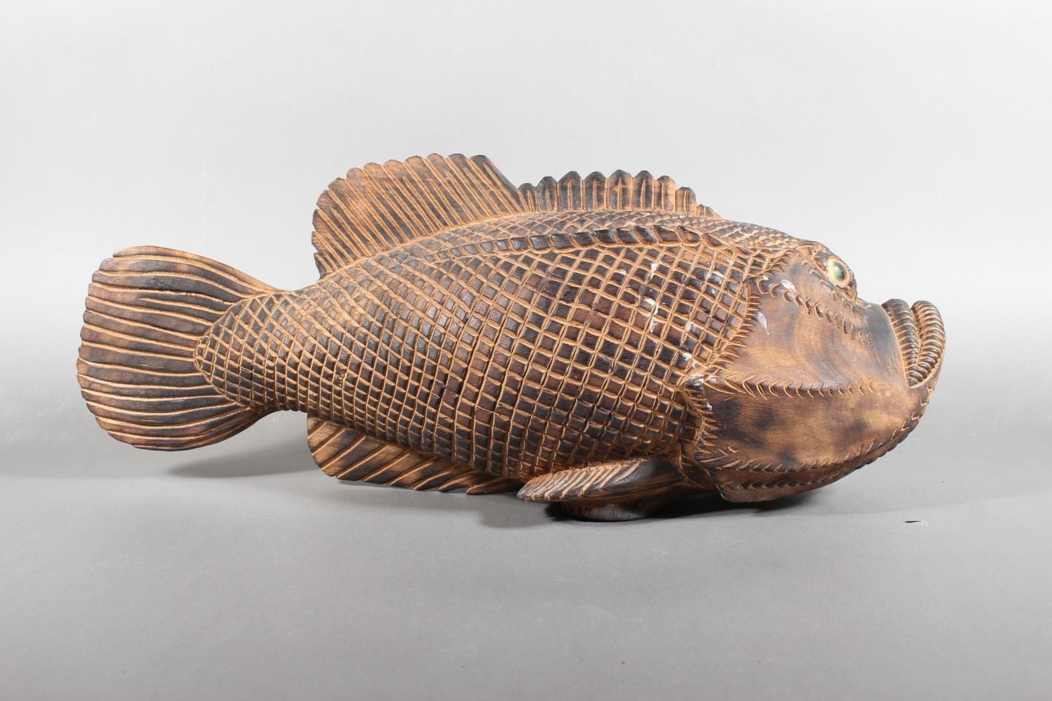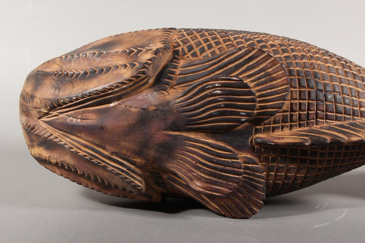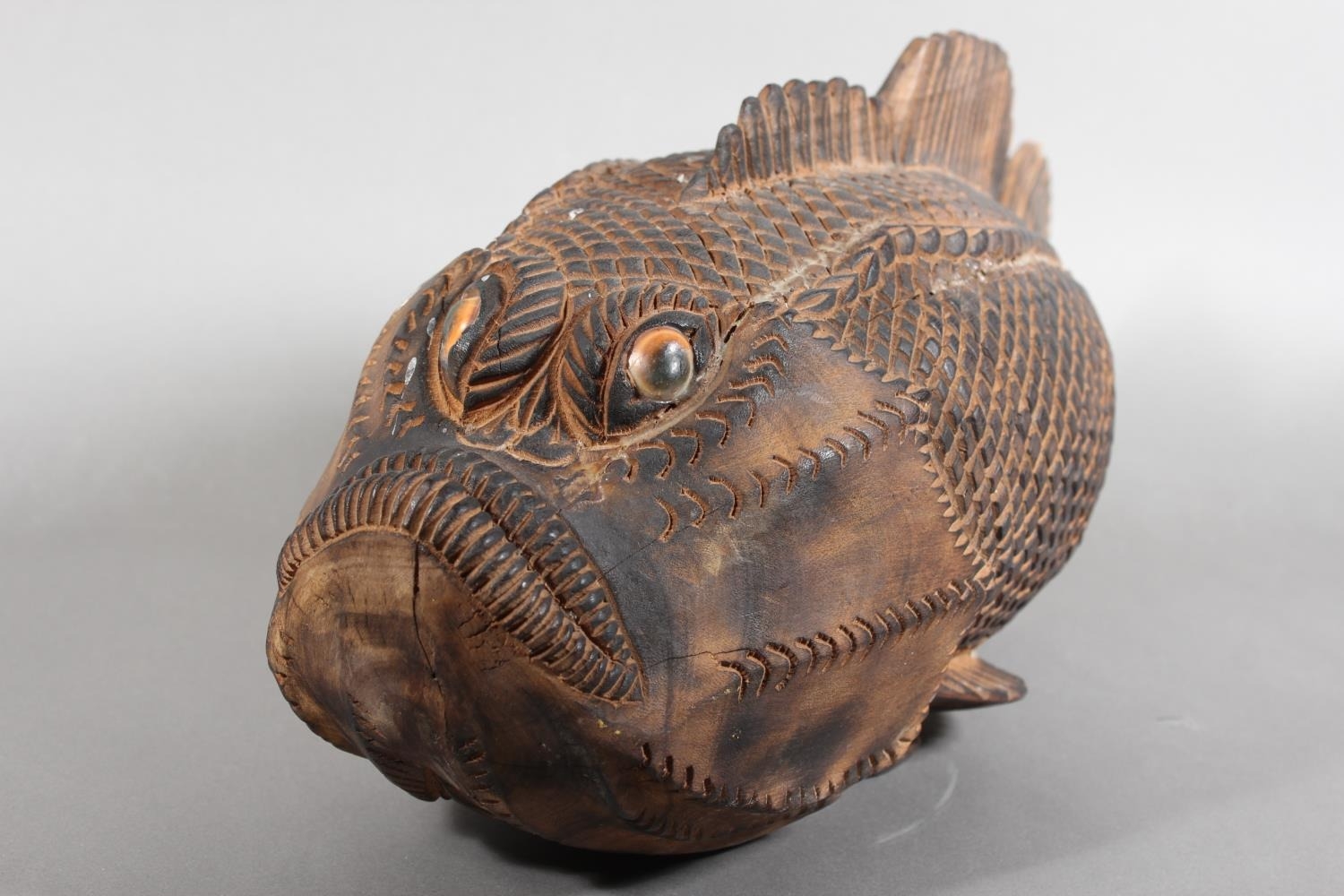 Heavily carved wooden fish model.