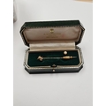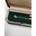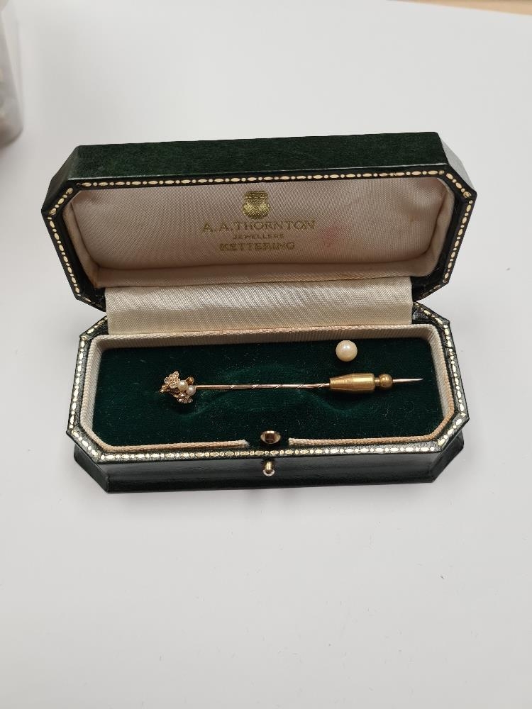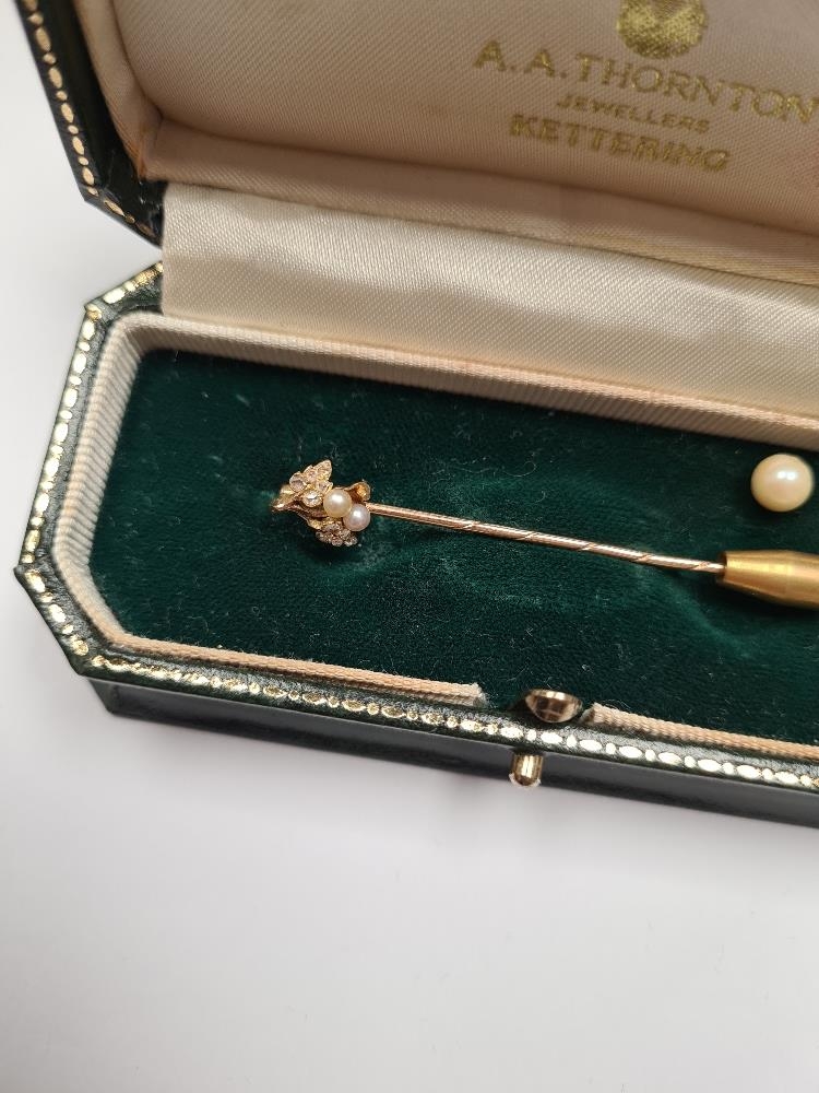 Unmarked yellow gold stick pin, with pearl and diamond detail to head, unmarked, in fitted case, approx 1.54g