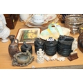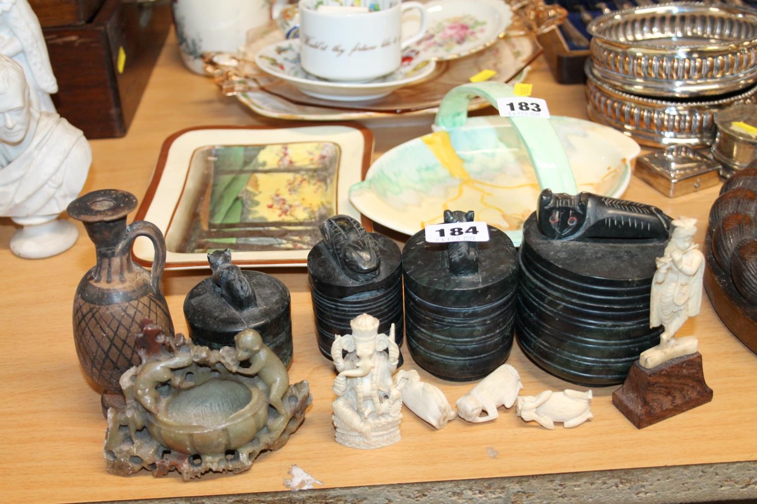 Ivory models to include three wise monkeys, hardstone pots and covers, etc.