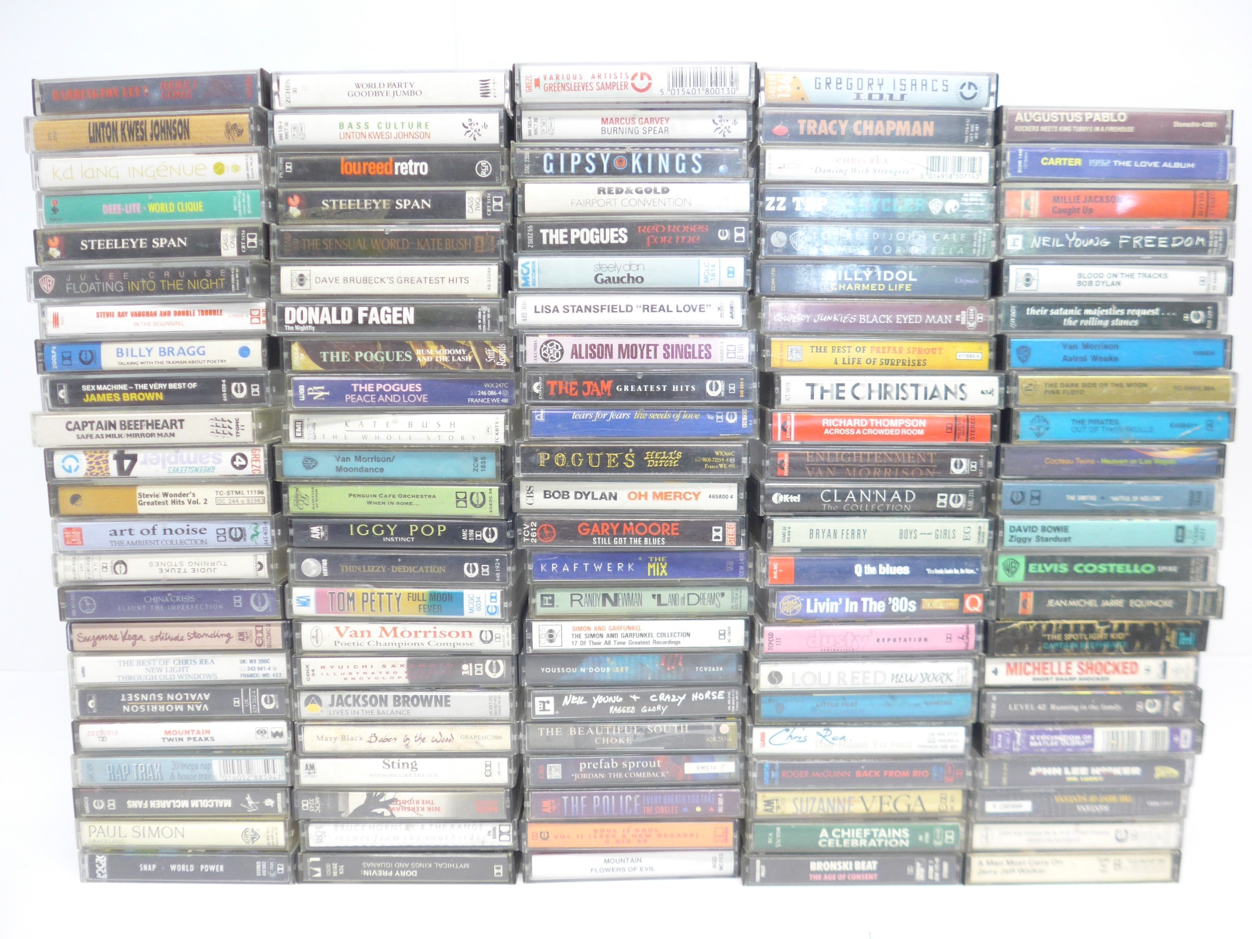 Rock / Pop / Prog / Reggae - A varied collection of over one-hundred cassettes, artists include Gregory Isaacs, Burning Spear, Augustus Pablo, Linton Kwesi Johnson, Pink Floyd, Lou Reed, Julee Cruise, Gipsy Kings, Deee-Lite, Billy Bragg, James Brown, Captain Beefheart, Stevie Wonder, Judie Tzuke, China Crisis, Suzanne Vega, Van Morrison, Mountain, Malcolm McLaren, Paul Simon, Snap, Carter The Unstoppable Sex Machine, Steeleye Span, Kate Bush, The Pogues, Penguin Cafe Orchestra, Iggy Pop, Thin Lizzy, Tom Petty, Ryuichi Sakamoto, Jackson Browne, Mary Black, Sting, Dory Previn, Fairport Convention, Steely Dan, Alison Moyet, The Jam, Tears For Fears, Bob Dylan, Gary Moore, Kraftwerk, Simon & Garfunkel, Neil Young, The Beautiful South, Prefab Sprout, The Police, Soul II Soul, Tracy Chapman, ZZ Top, Billy Idol, Cowboy Junkies, Richard Thompson, Dusty Springfield, Little Feat, Bronski Beat, Millie Jackson, The Rolling Stones, The Pirates, Cocteau Twins, , The Smiths, David Bowie, Elvis Costello, Level 42, The Beatles, Santana, etc (114)