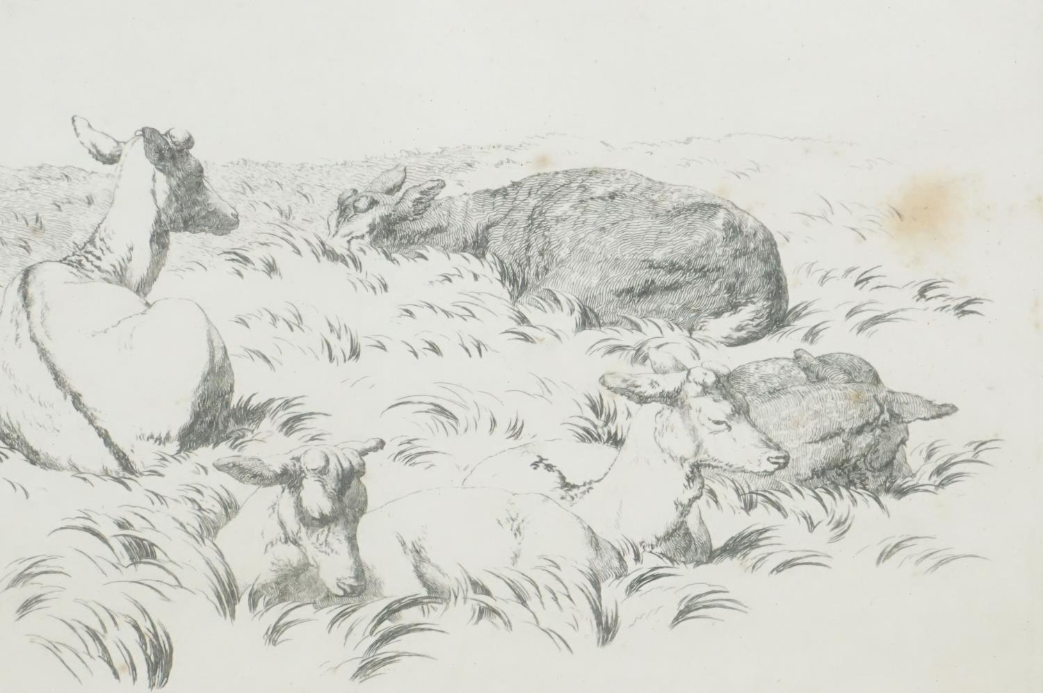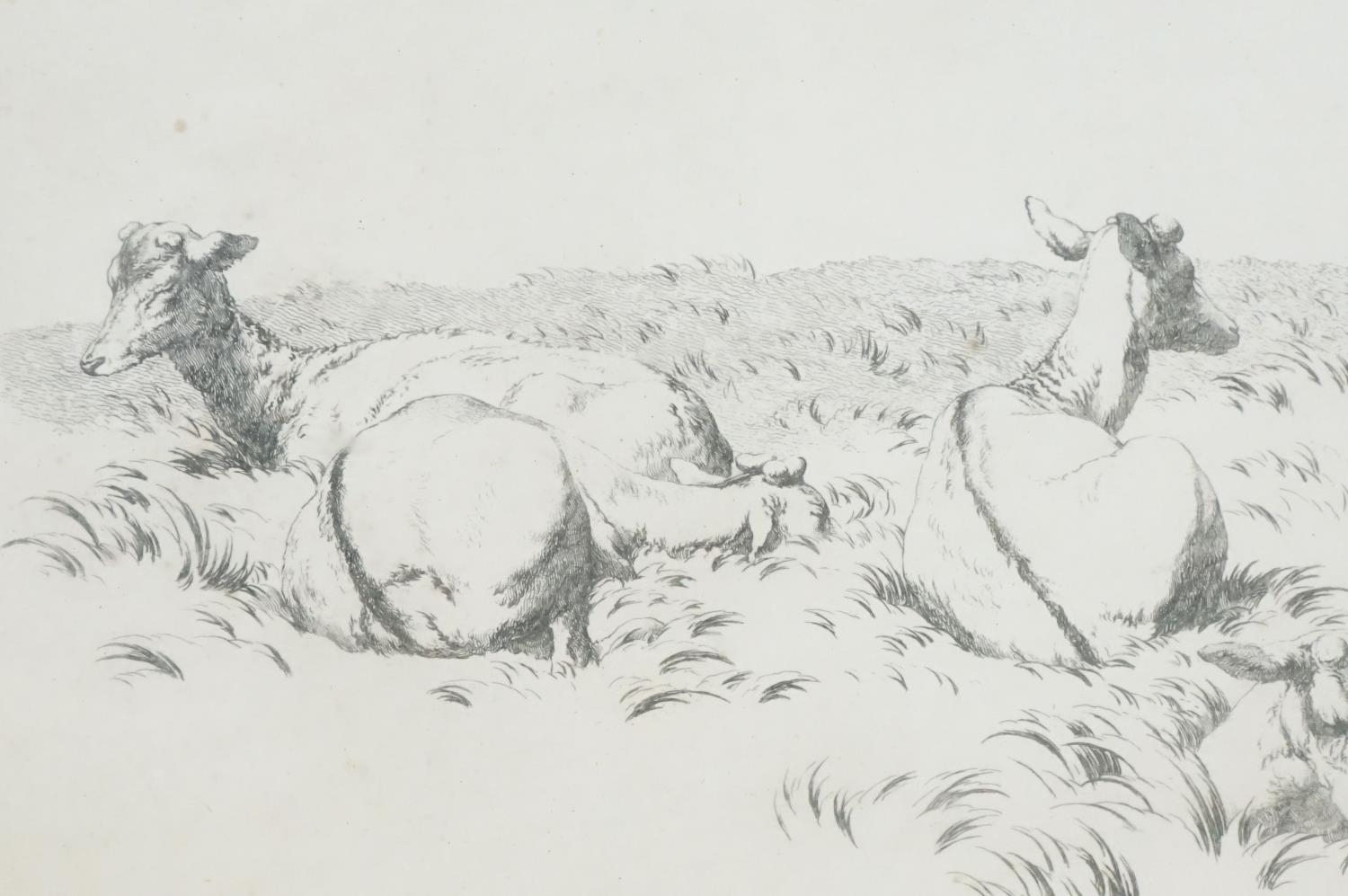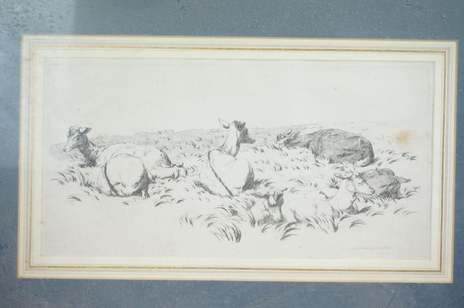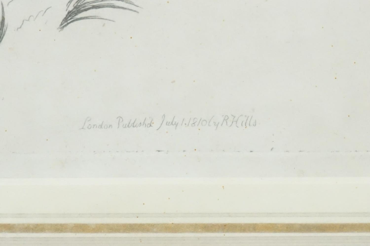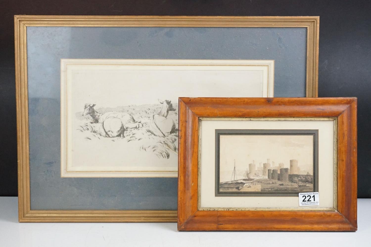 English School, castle with figures and ships in the foreground, watercolour, 10.5 x 17.5cm and R.Hills, deer resting in grass, etching, ' London Publish'd July 1 1810 by R Hills ', 18.5 x 36cm, both framed and glazed