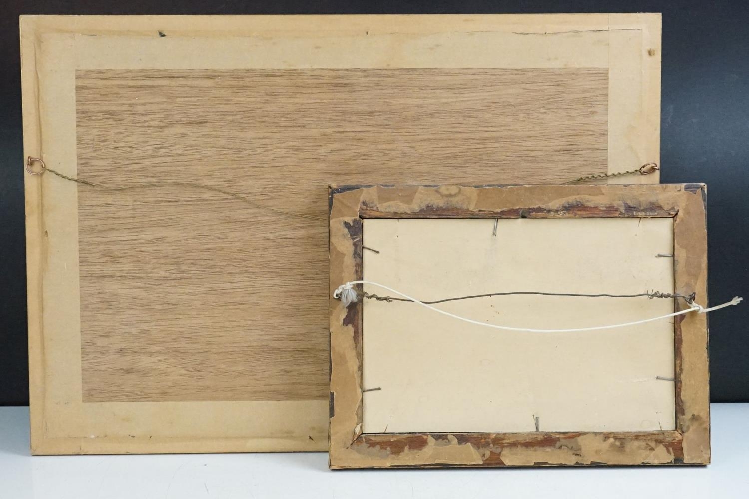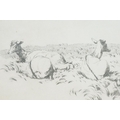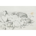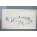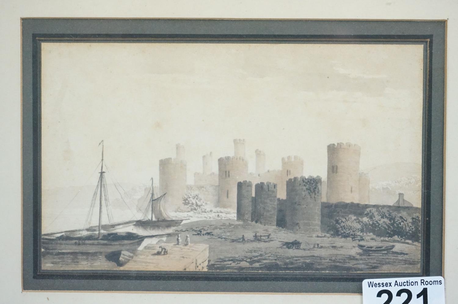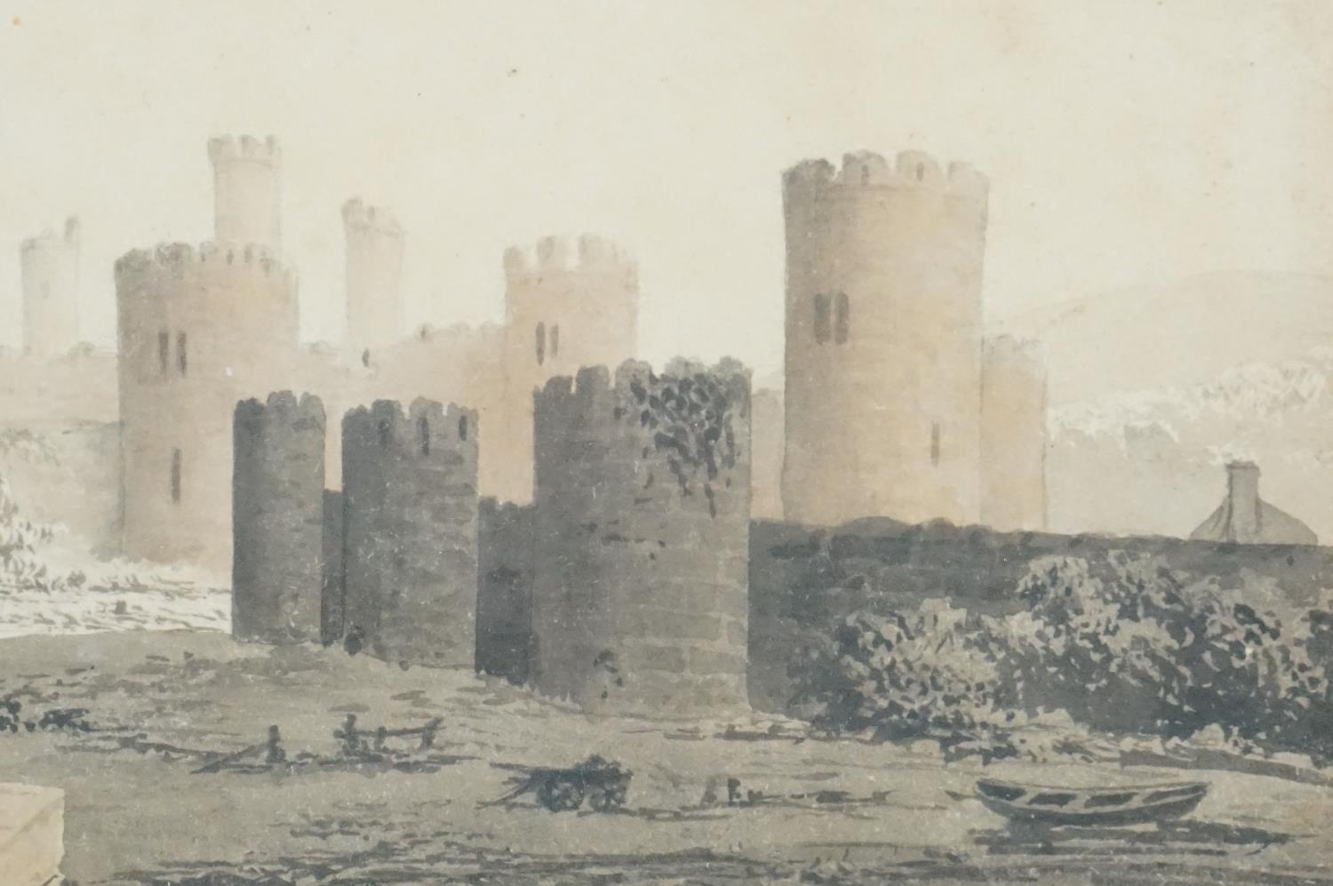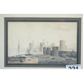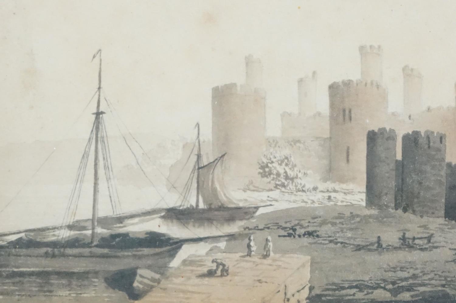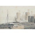 English School, castle with figures and ships in the foreground, watercolour, 10.5 x 17.5cm and R.Hills, deer resting in grass, etching, ' London Publish'd July 1 1810 by R Hills ', 18.5 x 36cm, both framed and glazed