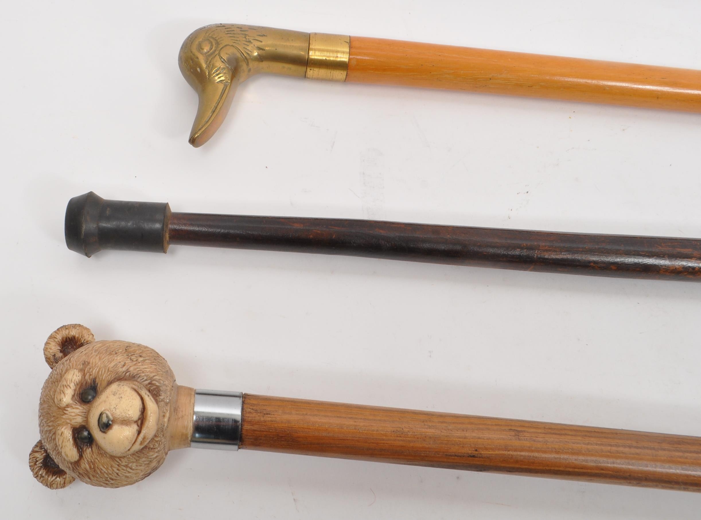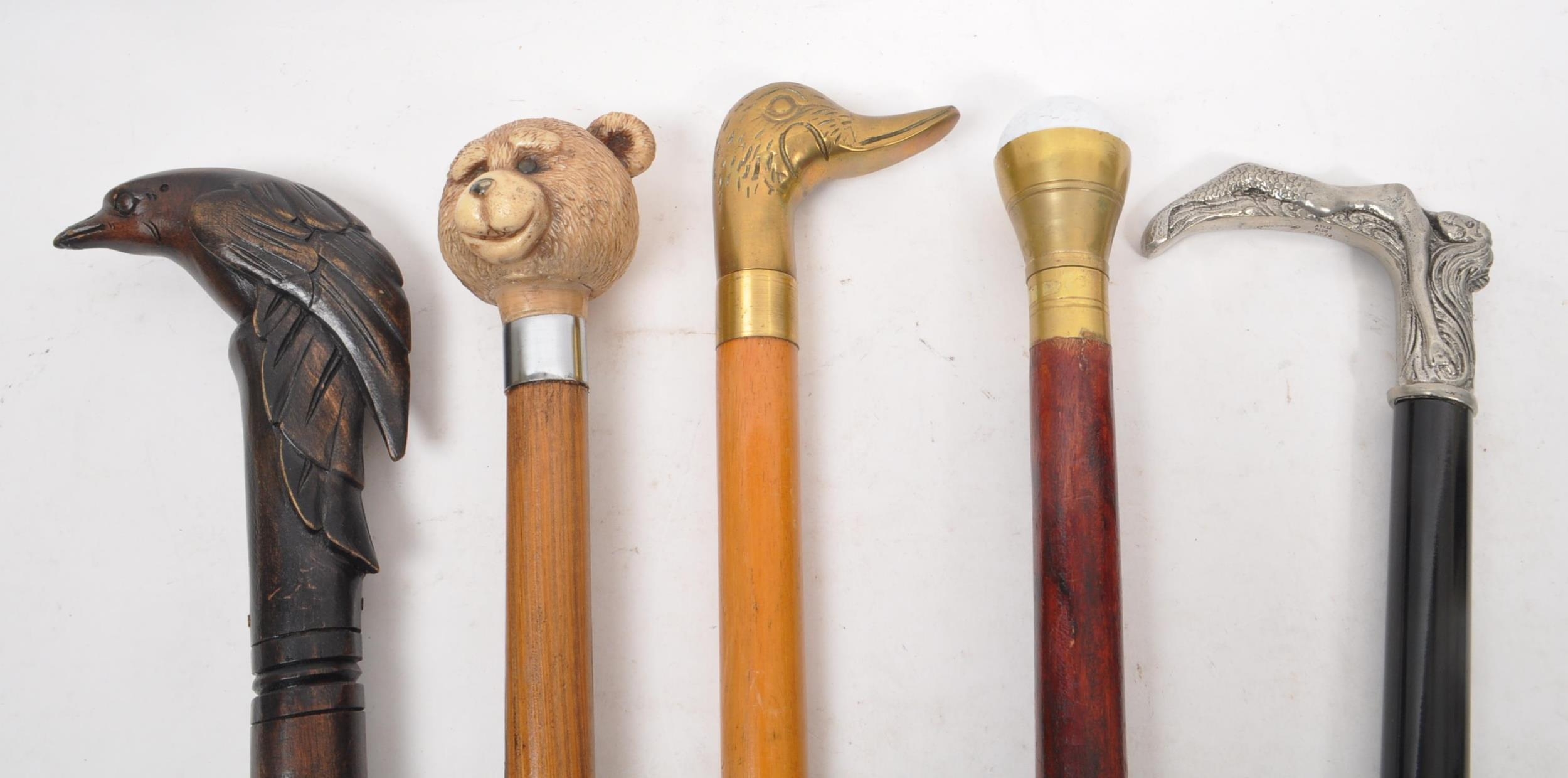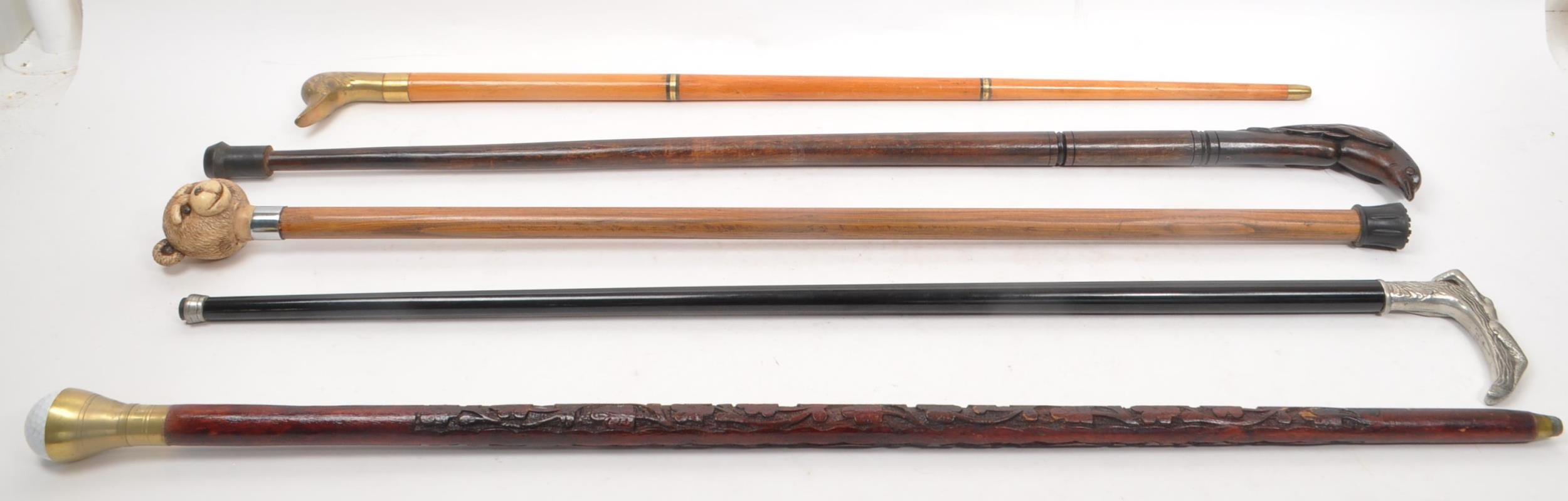 A collection of five mid 20th century walking sticks. The collection to include an Italian Cavagnini pewter topped walking stick, with handle in the form of a mermaid, alongside an example with a brass ducks head, one with a resin teddy bear head topper, a carved falcon example, and one with a Donnay Titanium golf ball mounted to top.