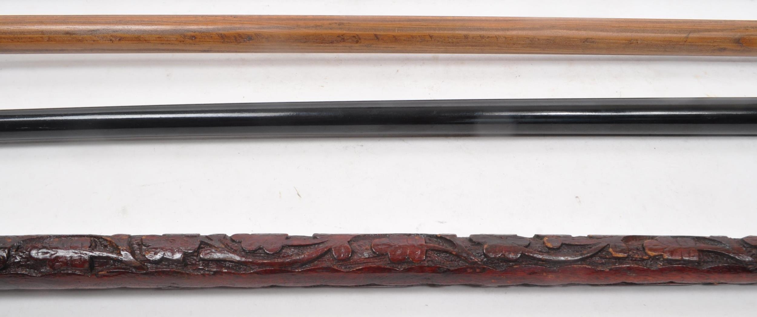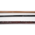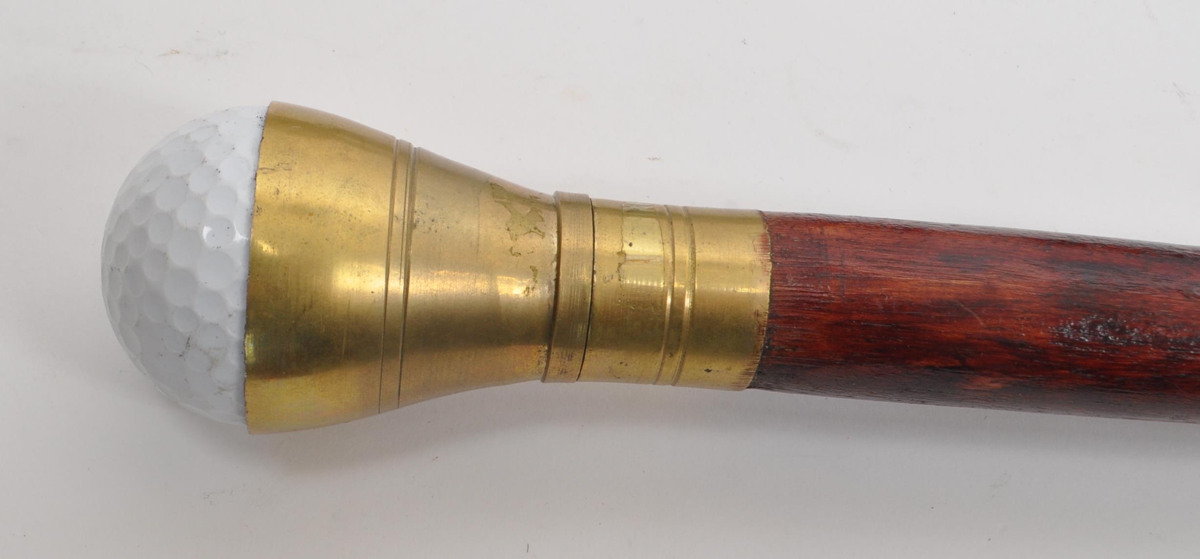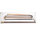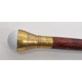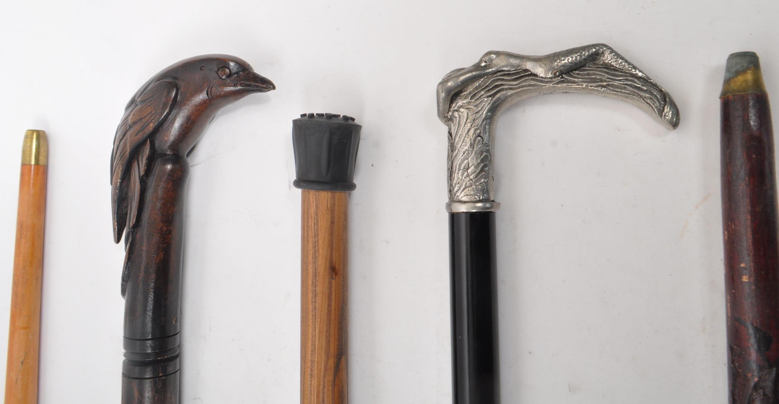 A collection of five mid 20th century walking sticks. The collection to include an Italian Cavagnini pewter topped walking stick, with handle in the form of a mermaid, alongside an example with a brass ducks head, one with a resin teddy bear head topper, a carved falcon example, and one with a Donnay Titanium golf ball mounted to top.