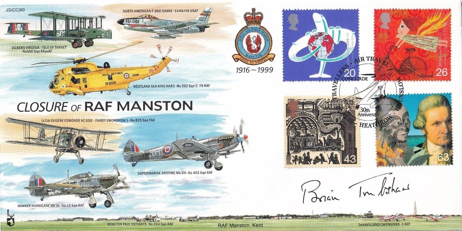 JS(CC)60d Closure of RAF Manston. 02 02 99 Heathrow Concorde Special on full set of 4 Millennium Series The Travellers Stamps Closure of RAF Manston First day cover. Personally Signed by Brian Trubshaw. Concorde Test Pilot. Ernest Brian Trubshaw, CBE, MVO (29 January 1924 - 24 March 2001) was a leading test pilot, and the first British pilot to fly Concorde, in April 1969. Good condition. All autographs come with a Certificate of Authenticity. We combine postage on multiple winning lots and can ship worldwide. UK postage from £5.99, EU from £7.99, Rest of World from £9.99