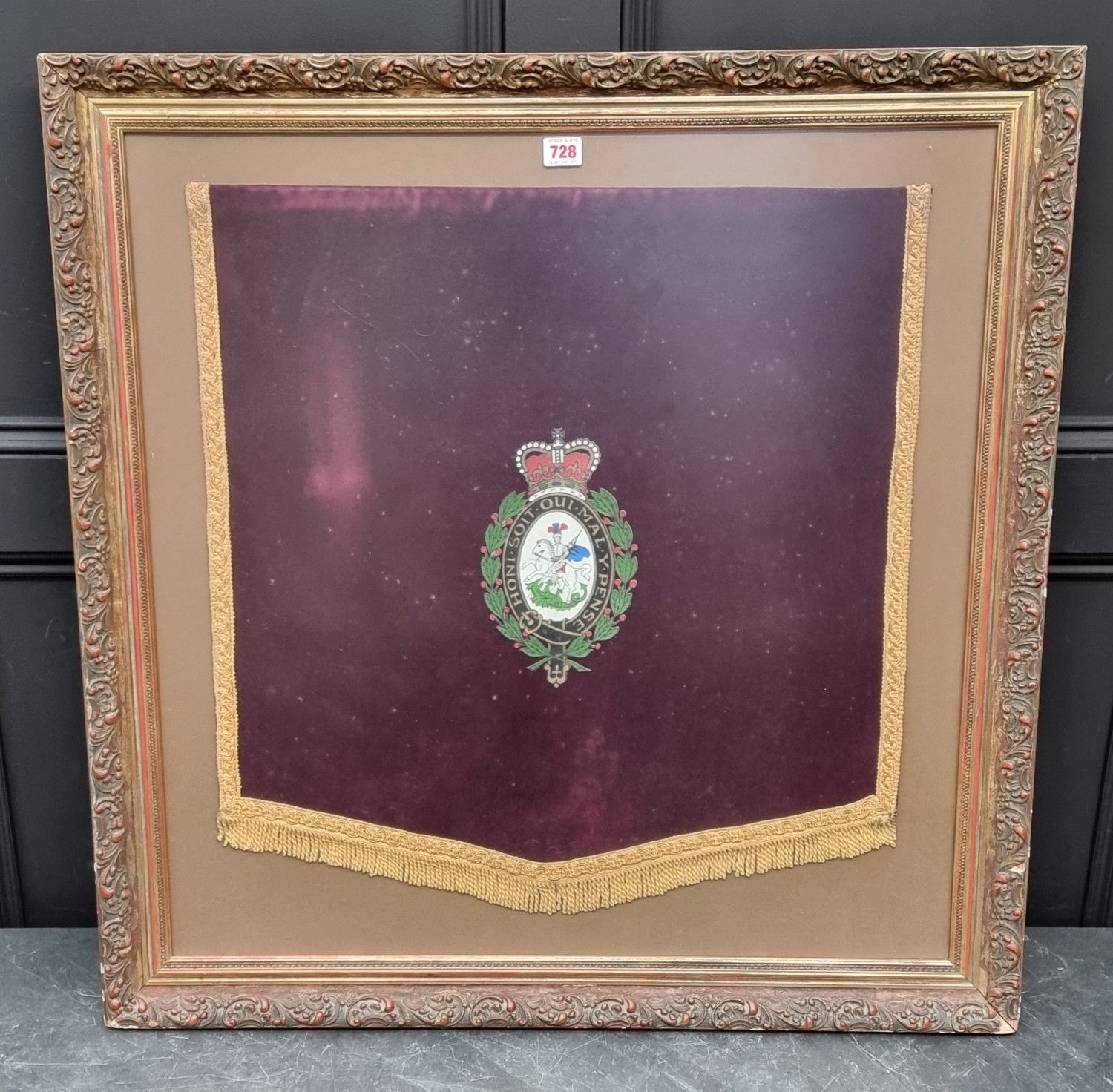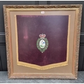 A painted fabric The Royal Regiment of Fusiliers fanfare trumpet banner, 64 x 61cm, framed and glazed.