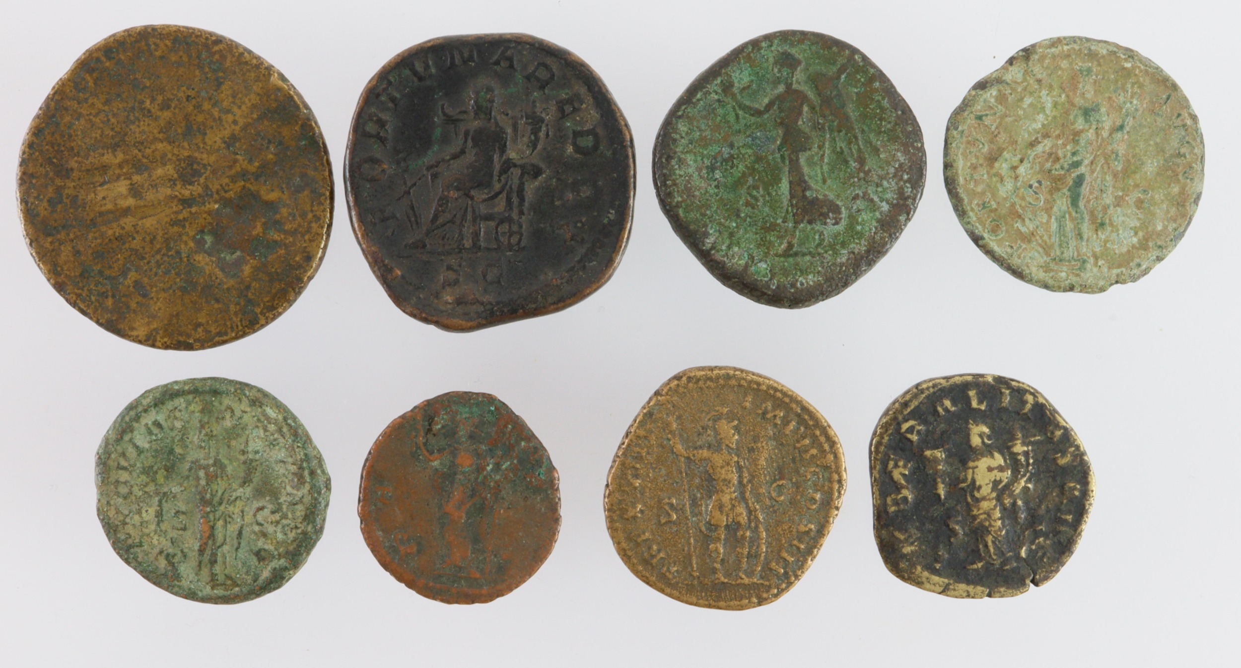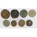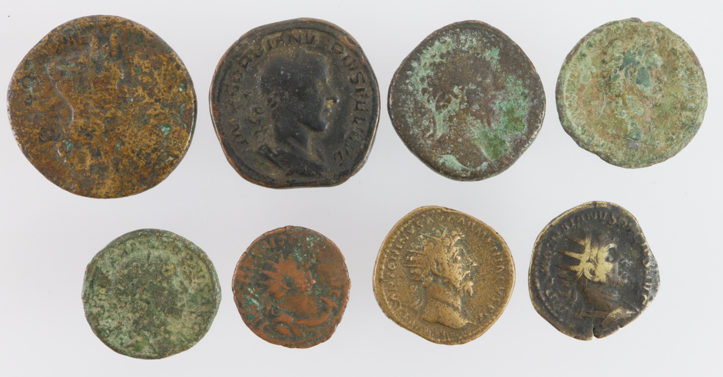 Roman bronze coins (8) including a low grade Sestertius of Matidia; Dupondii of Marcus Aurelius and Trajan Decius (scarce); an AE Ant of Carausius, etc.