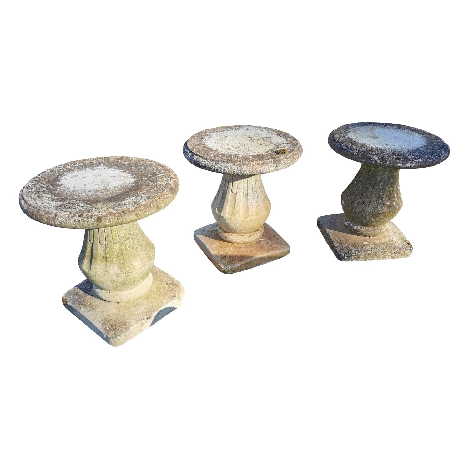 Set of three early 20th C. composition garden stools {42 cm H x 40 cm Dia.}.