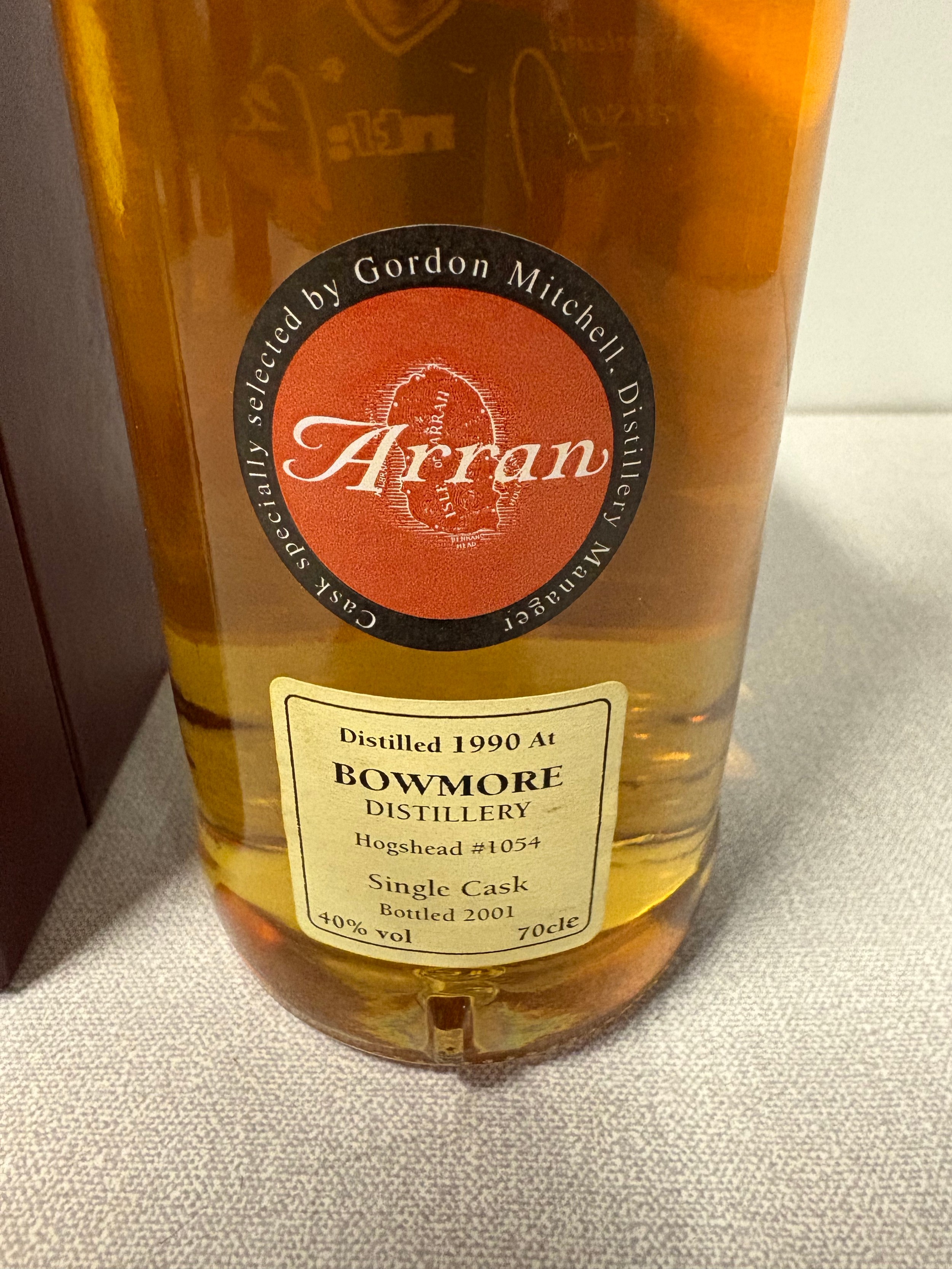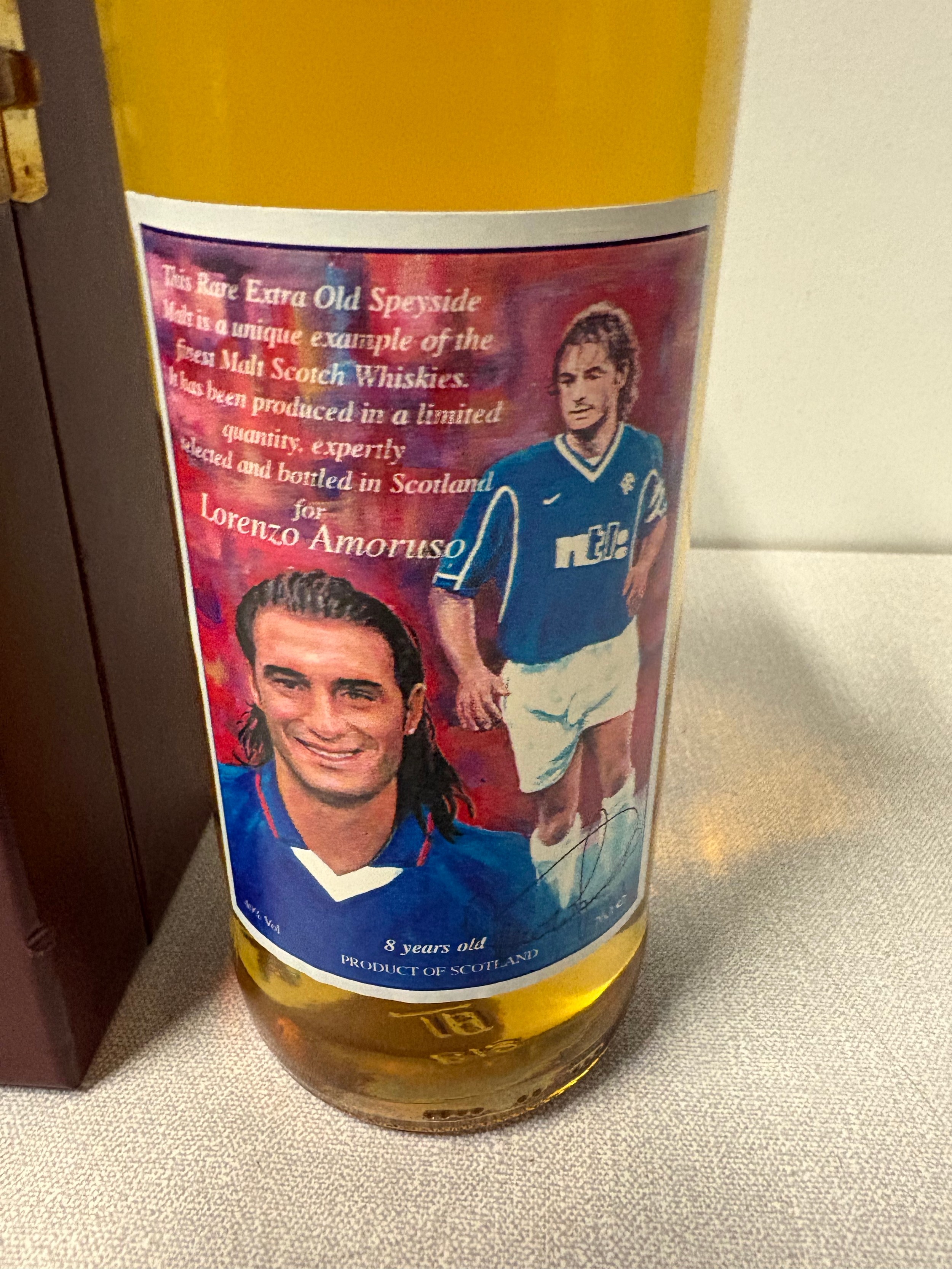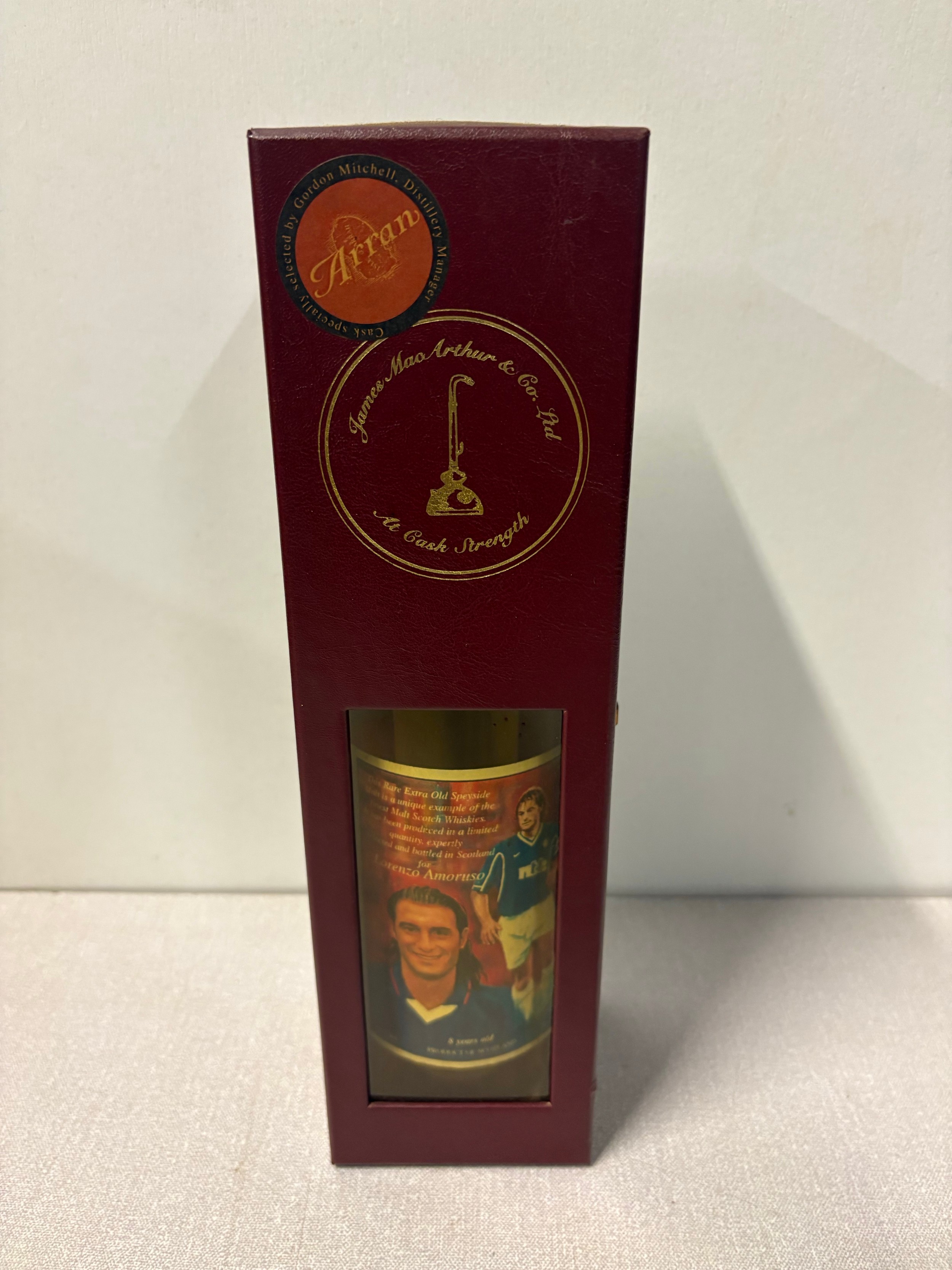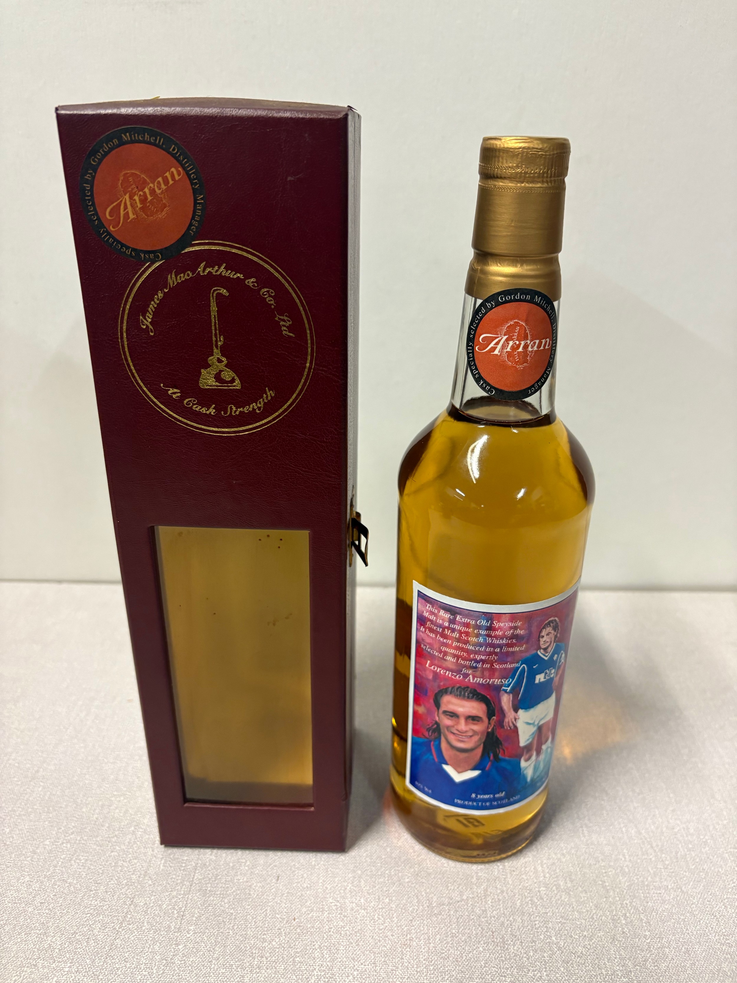 A limited edition bottle of arran single malt scotch whisky featuring former rangers fc player Lorenzo Amoruso , distilled in 1990 at Bowmore distillery within presentation box