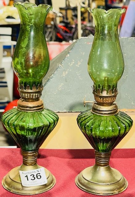 Pair Of Vintage Green Glass Oil Lamps - Approx 10"