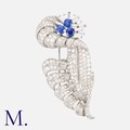 A Fine French Sapphire And Diamond Floral Spray Brooch in 18k white gold, the floral form set throughout with round cut diamonds, featuring three round cut sapphires each of approximately 1.00cts, within a baguette cut diamond border. All diamonds totalling approximately 8.00cts. French Marks for 18 carat gold, makers mark indistinct.