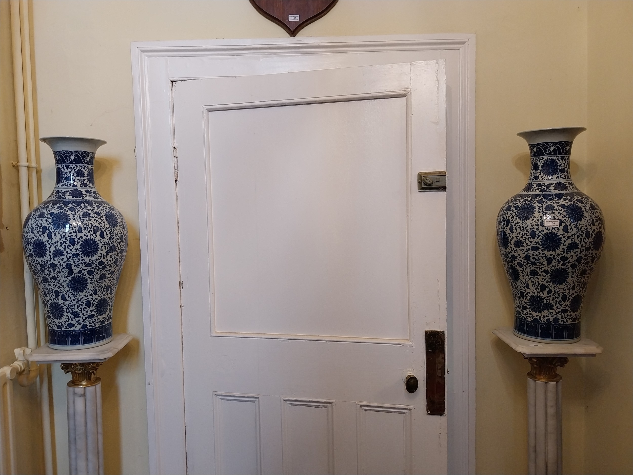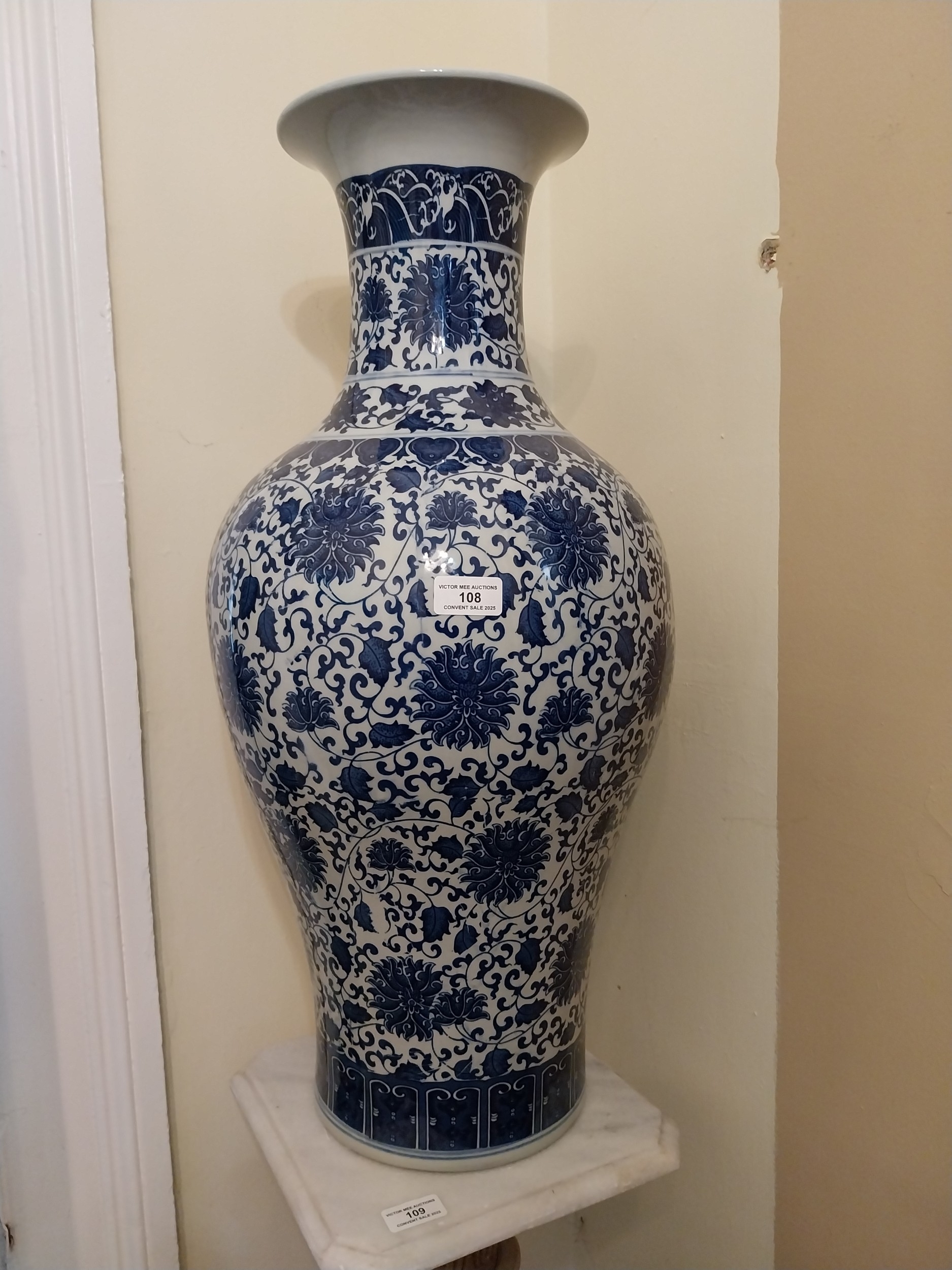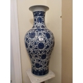 Pair of Oriental blue and white ceramic vases. { 68cm H X 31cm Dia }.