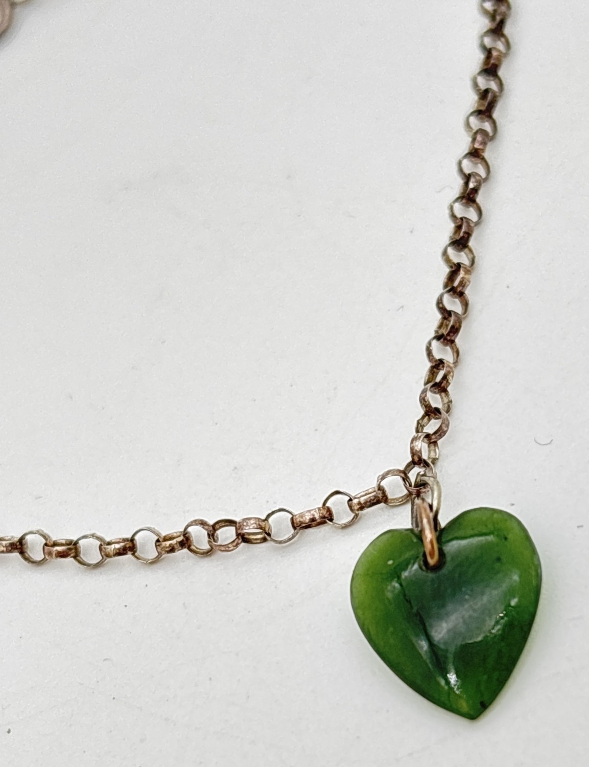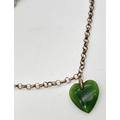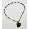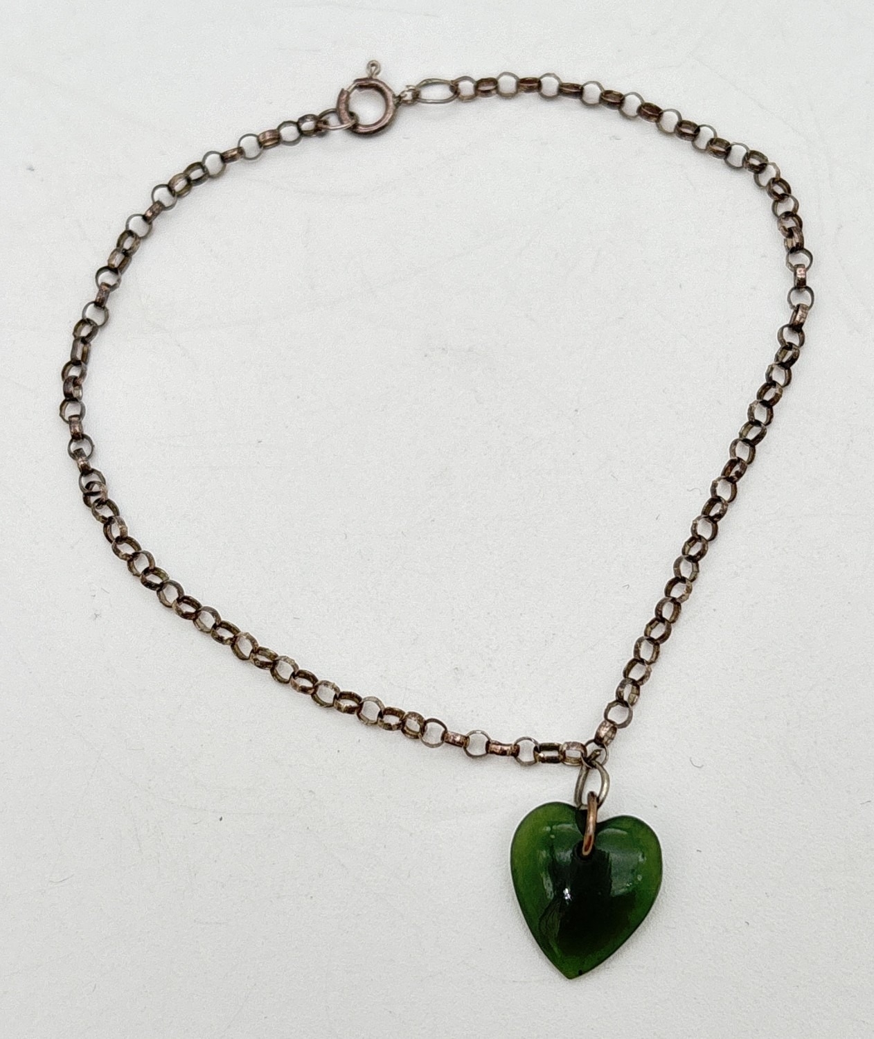 A vintage silver 7" belcher chain bracelet with green jade heart shaped charm. 925 stamped on spring ring clasp.