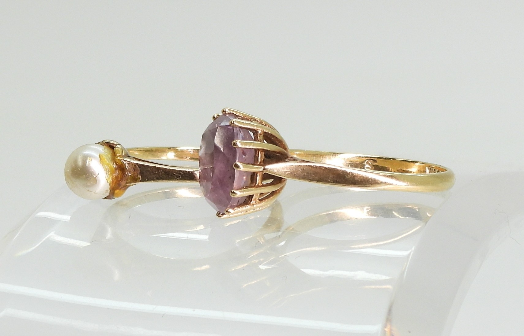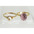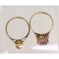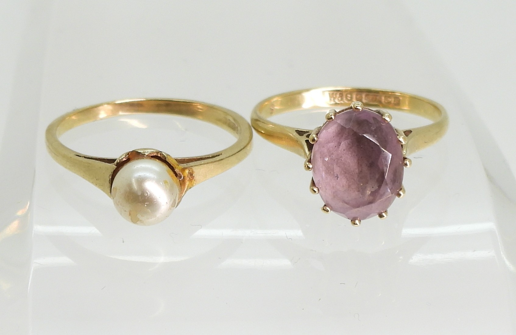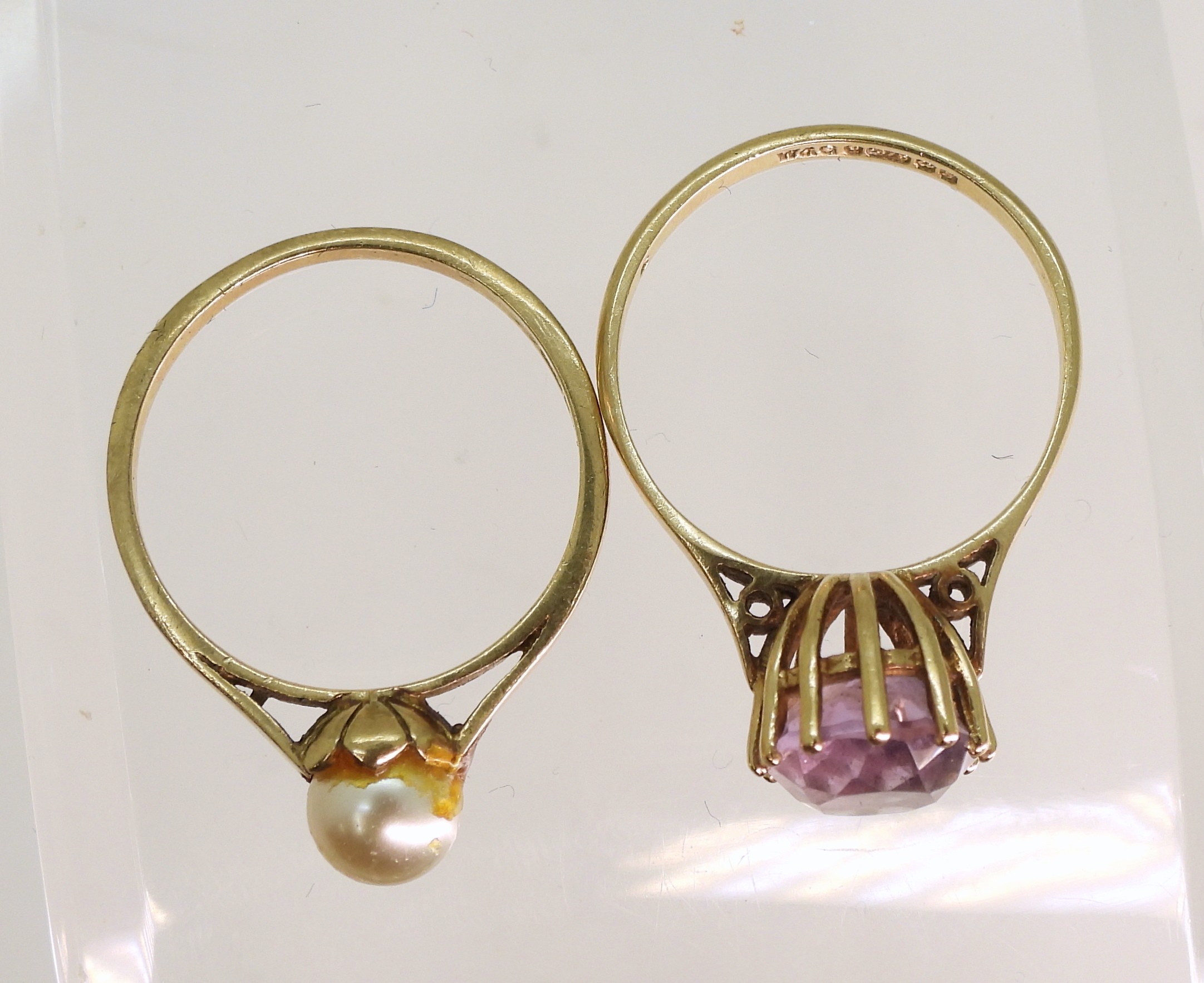 A 9ct amethyst ring, size N, and a 9ct gold faux pearl ring, size N, weight combined 4.1gms
