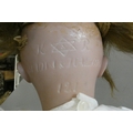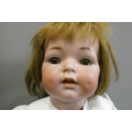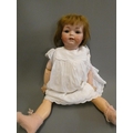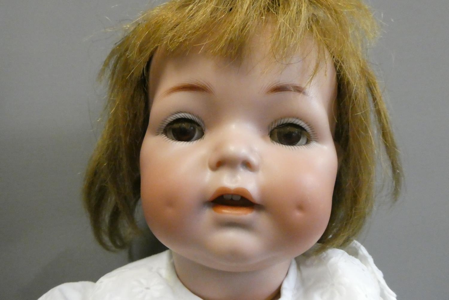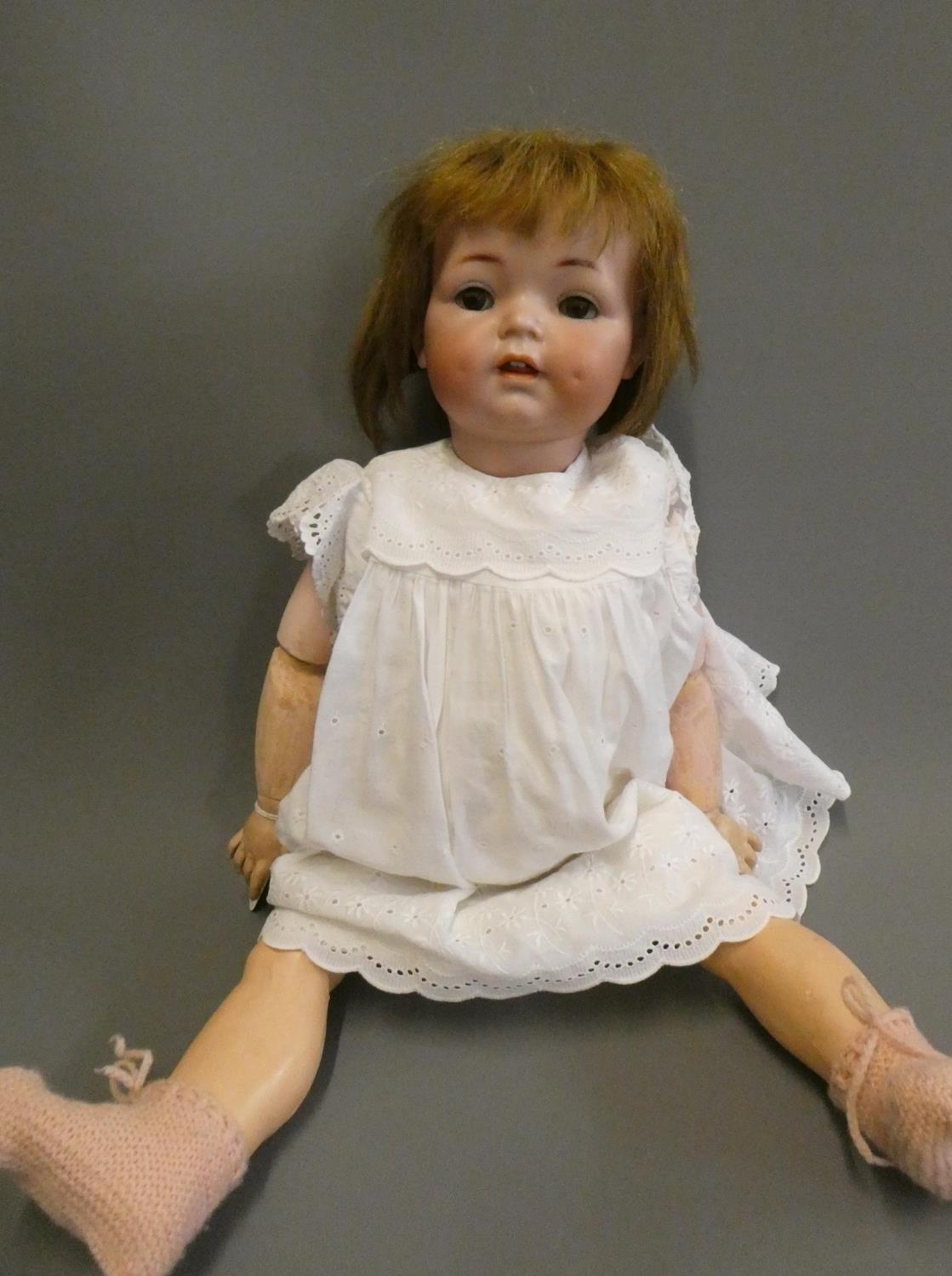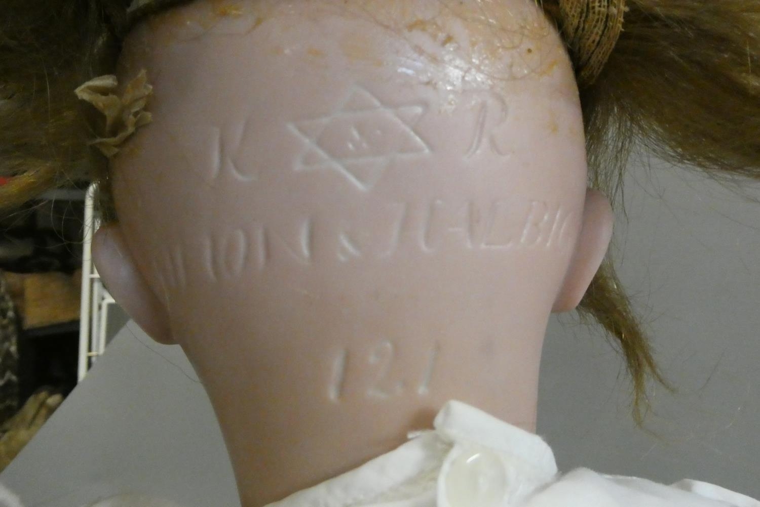 A Simon & Halbig K & R bisque socket head doll, with brown glass sleeping eyes, open mouth, applied top teeth, wood and composition body with slant hips, and white dress, numbered 121 50, 22" long