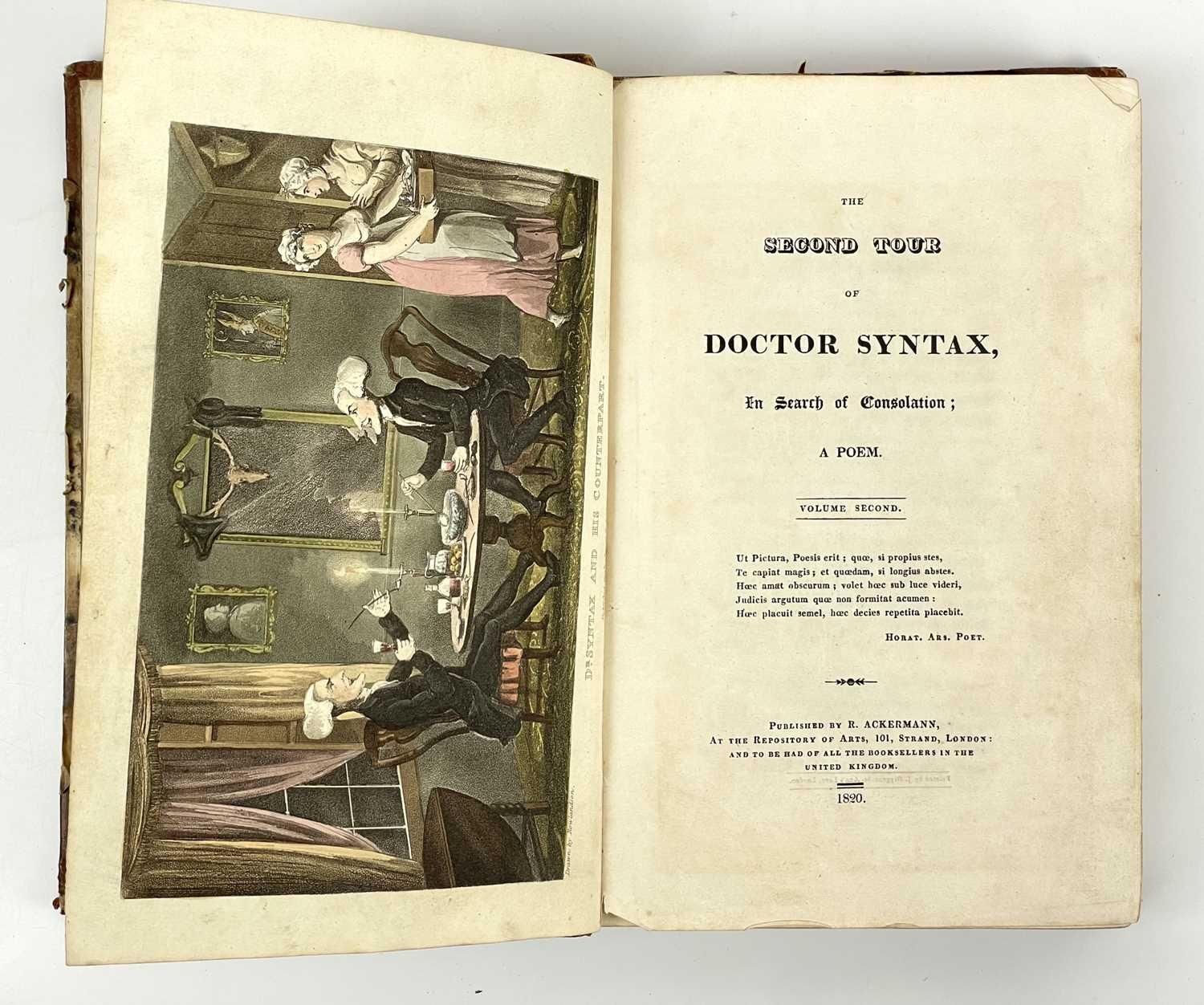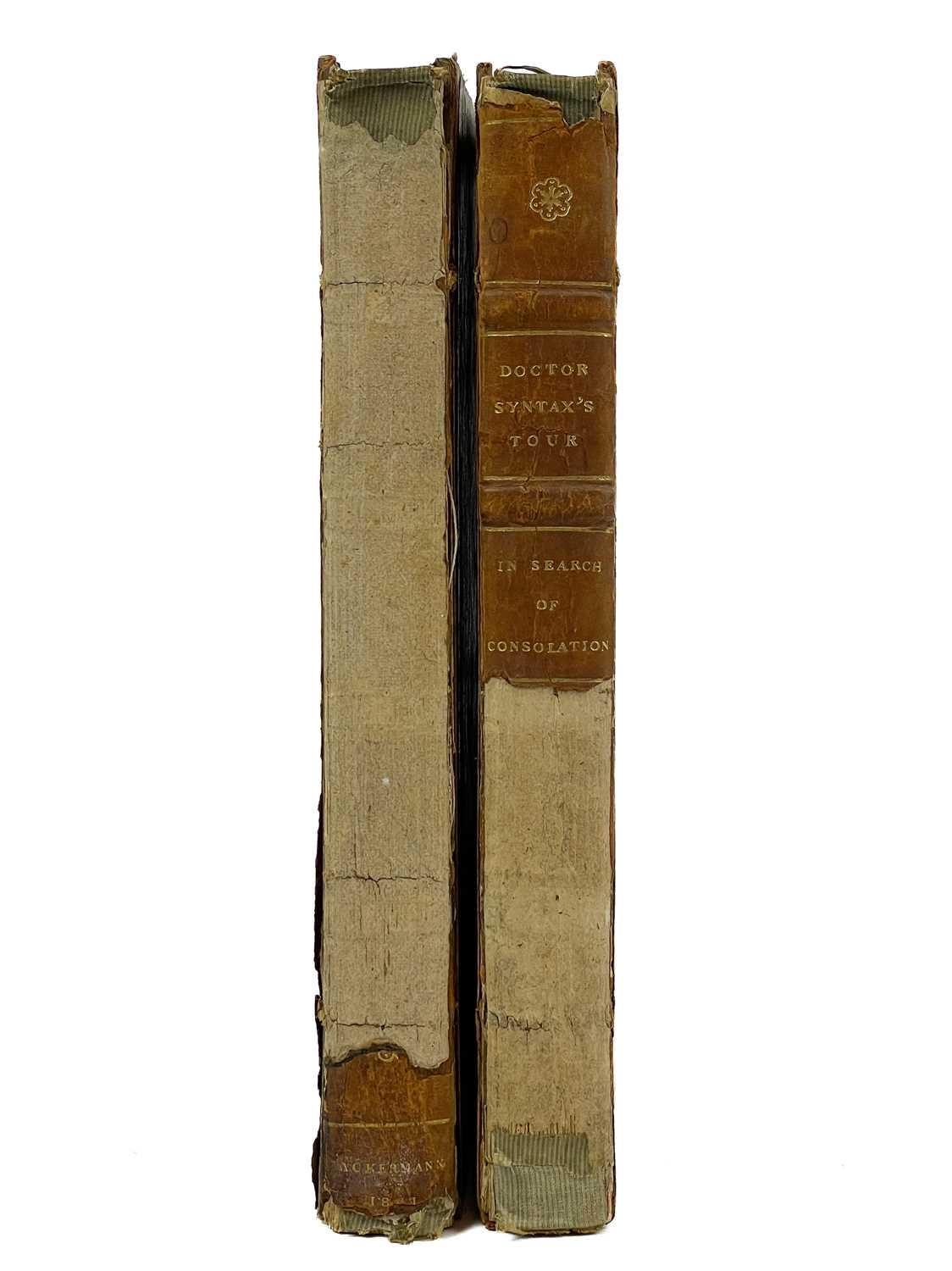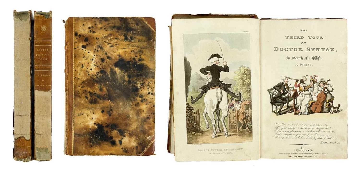 William COMBE & Thomas ROWLANDSON The Second Tour of Doctor Syntax, in Search of Consolation London: published by R Ackermann at the Repository of Arts, 1820; 24 hand-coloured illustrated plates by Rowlandson. Contemp. boards backed in calf with calf corner tips, rubbed, gilt lettering to the spine, heavily damaged, though boards intact. Together with The Third Tour of Doctor Syntax, loose boards and end endpapers, but fantastic textblock and illustrations.