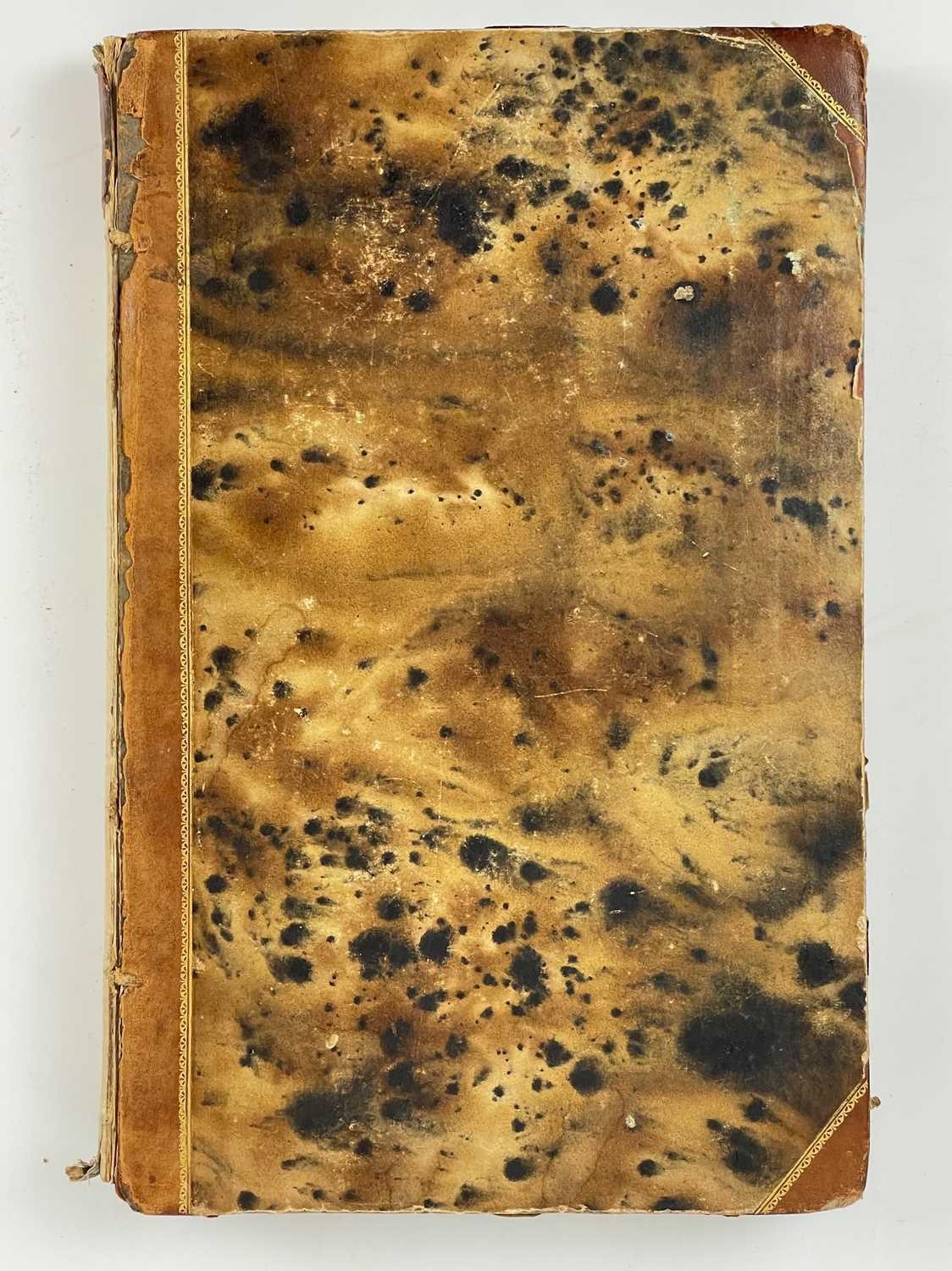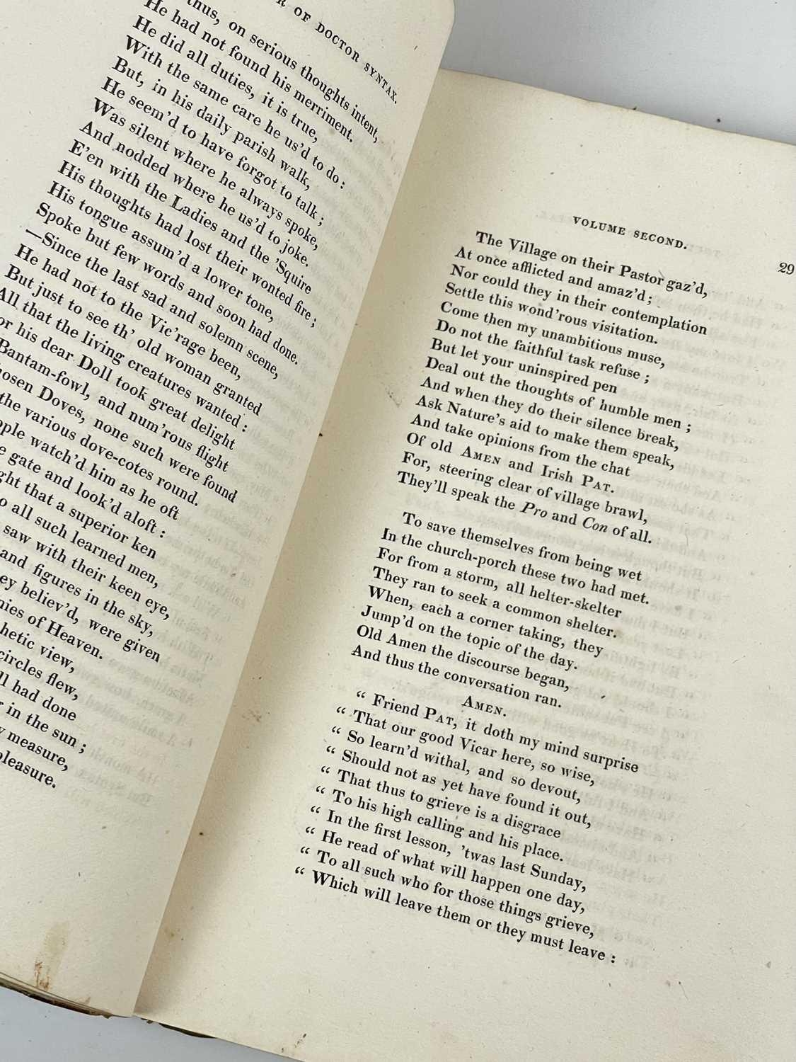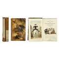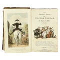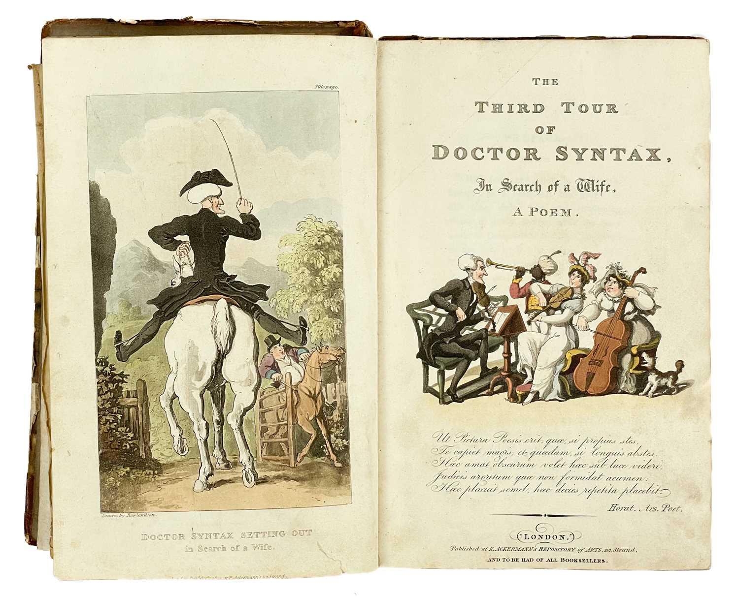 William COMBE & Thomas ROWLANDSON The Second Tour of Doctor Syntax, in Search of Consolation London: published by R Ackermann at the Repository of Arts, 1820; 24 hand-coloured illustrated plates by Rowlandson. Contemp. boards backed in calf with calf corner tips, rubbed, gilt lettering to the spine, heavily damaged, though boards intact. Together with The Third Tour of Doctor Syntax, loose boards and end endpapers, but fantastic textblock and illustrations.