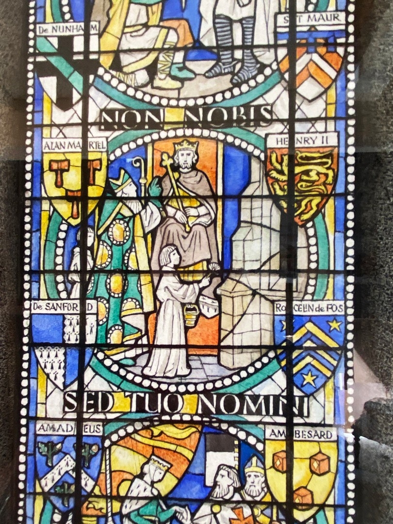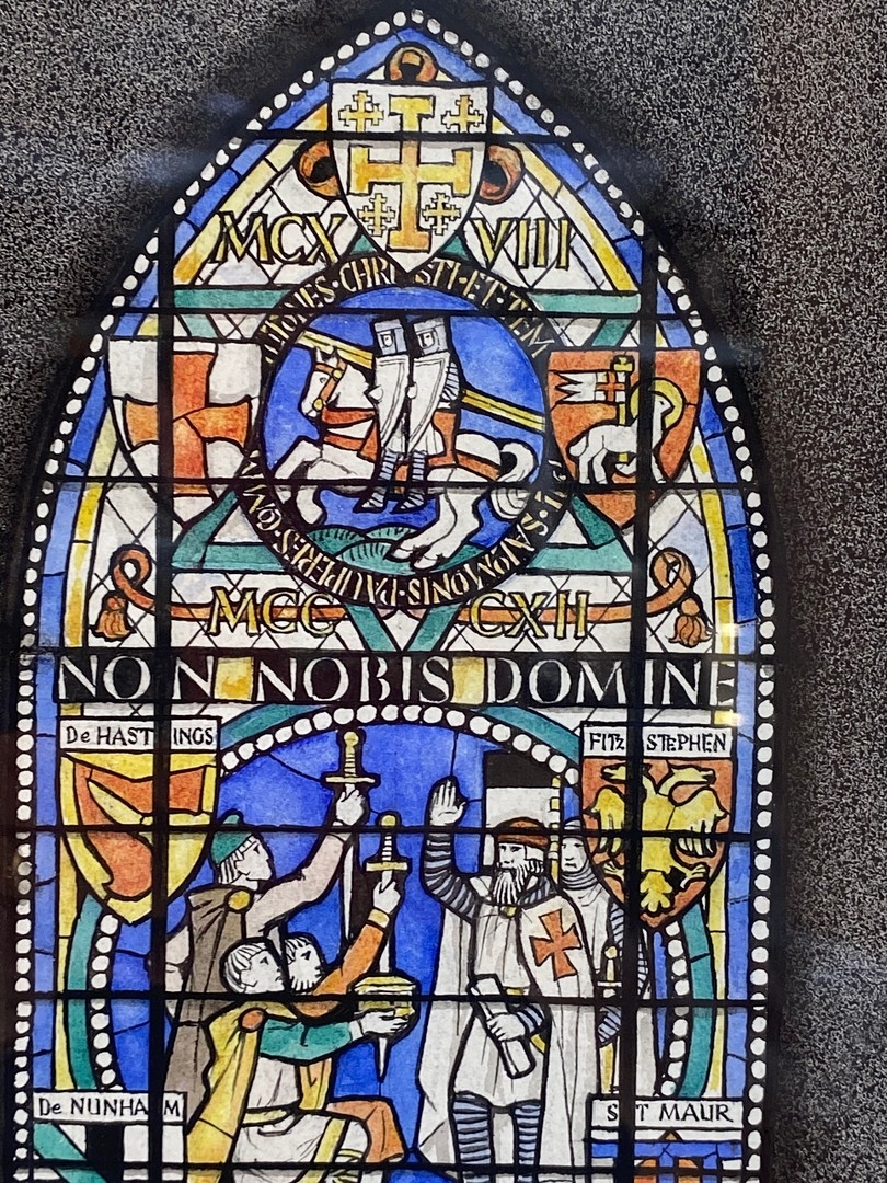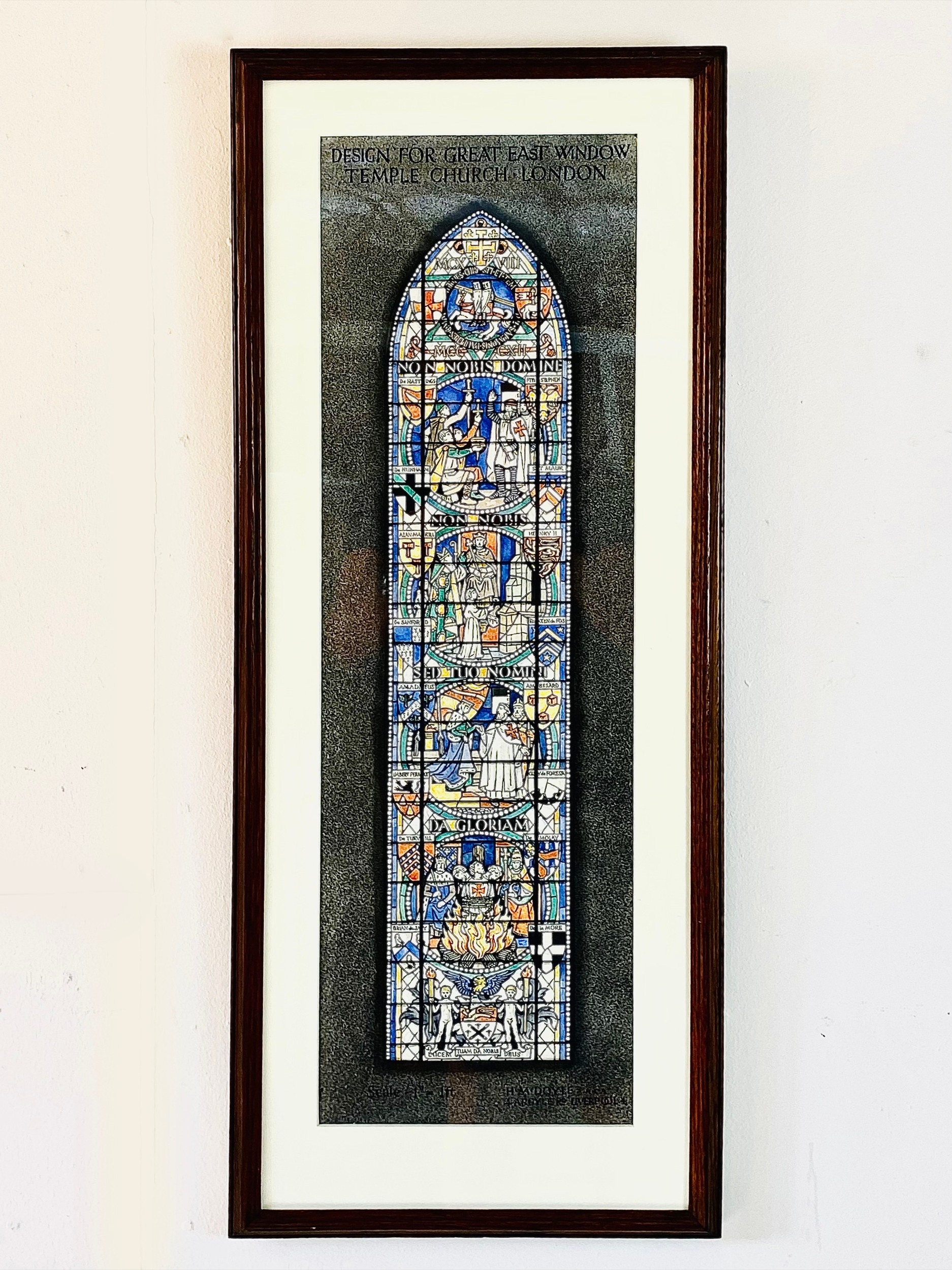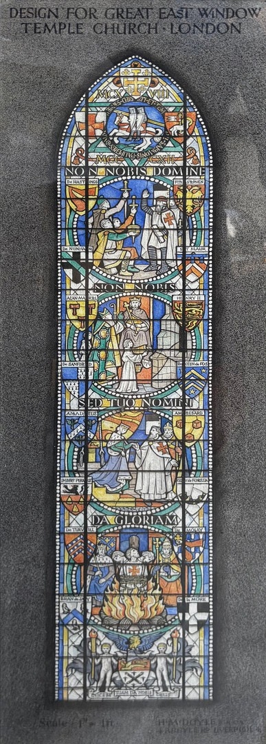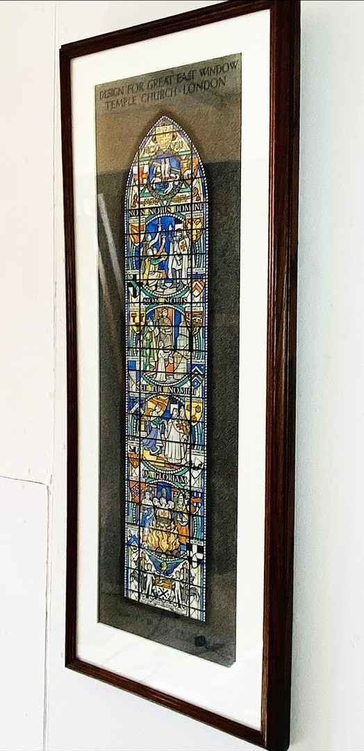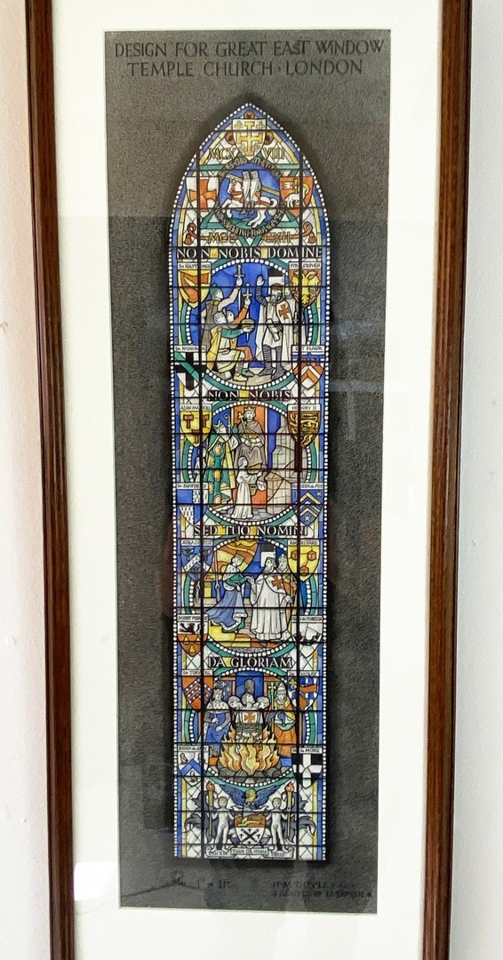 WATERCOLOUR OF A DESIGN FOR GREAT EAST WINDOW TEMPLE CHURCH BY HARCOURT MEDHURST DOYLE. framed and glazed, 55cm H x 25cm W.