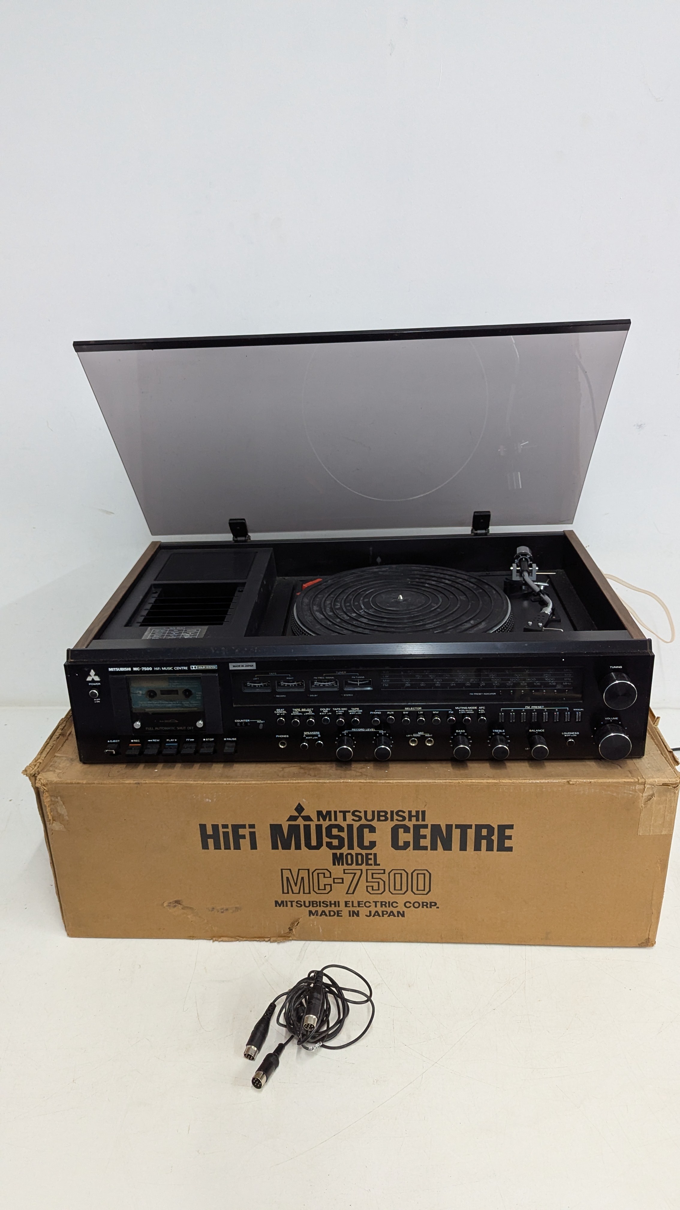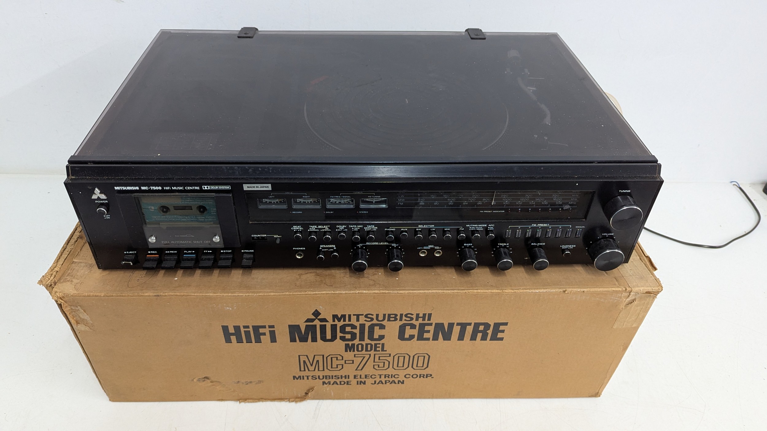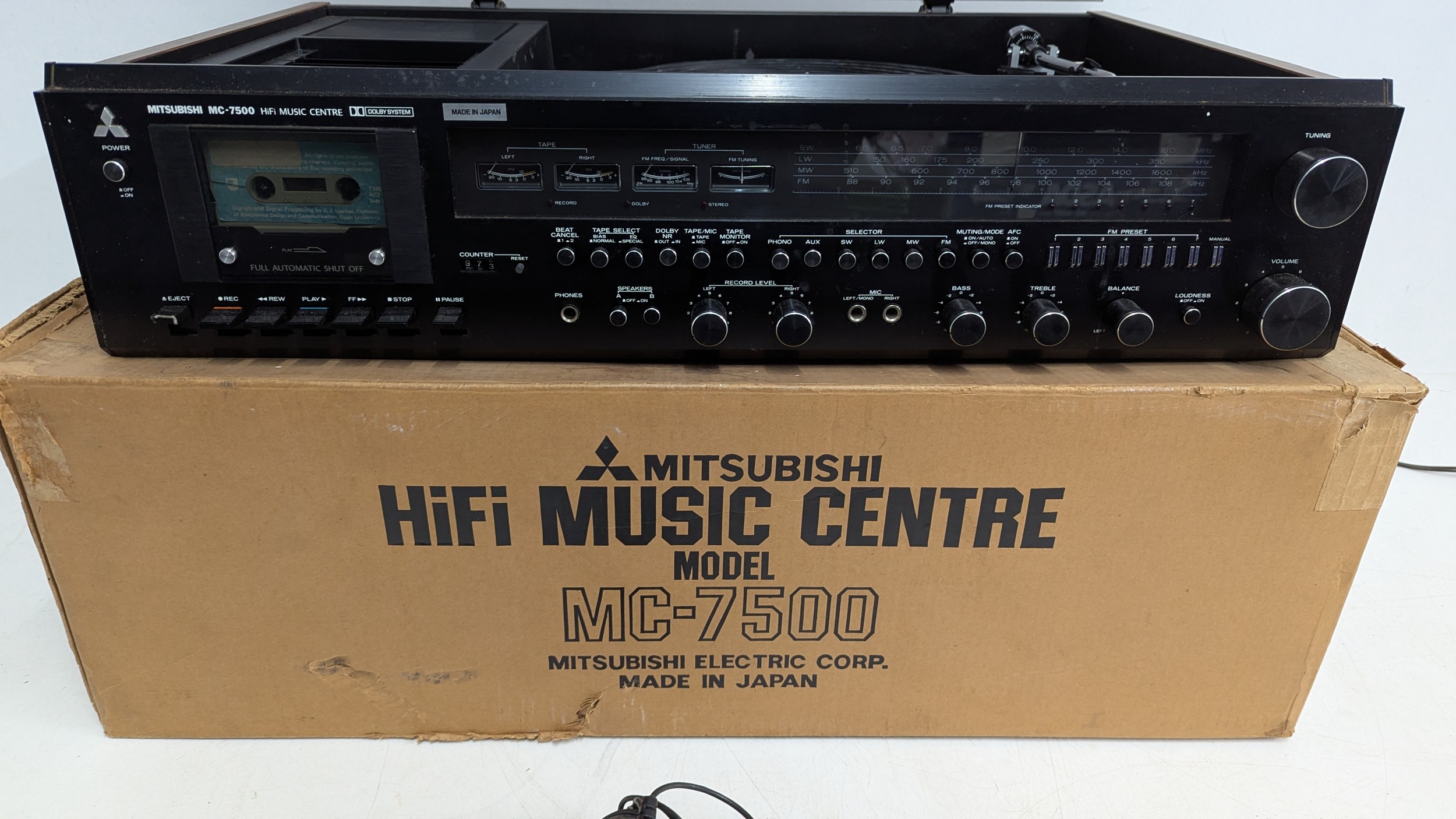 A 1970s Japanese-made stereo music system incorporating record deck, cassette deck and AM/FM tuner, with matching Mitsubishi SS 075 three-way loudspeakers, frequency response 50–18,000 Hz, 40W music power, complete with connecting cables and original box.