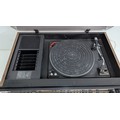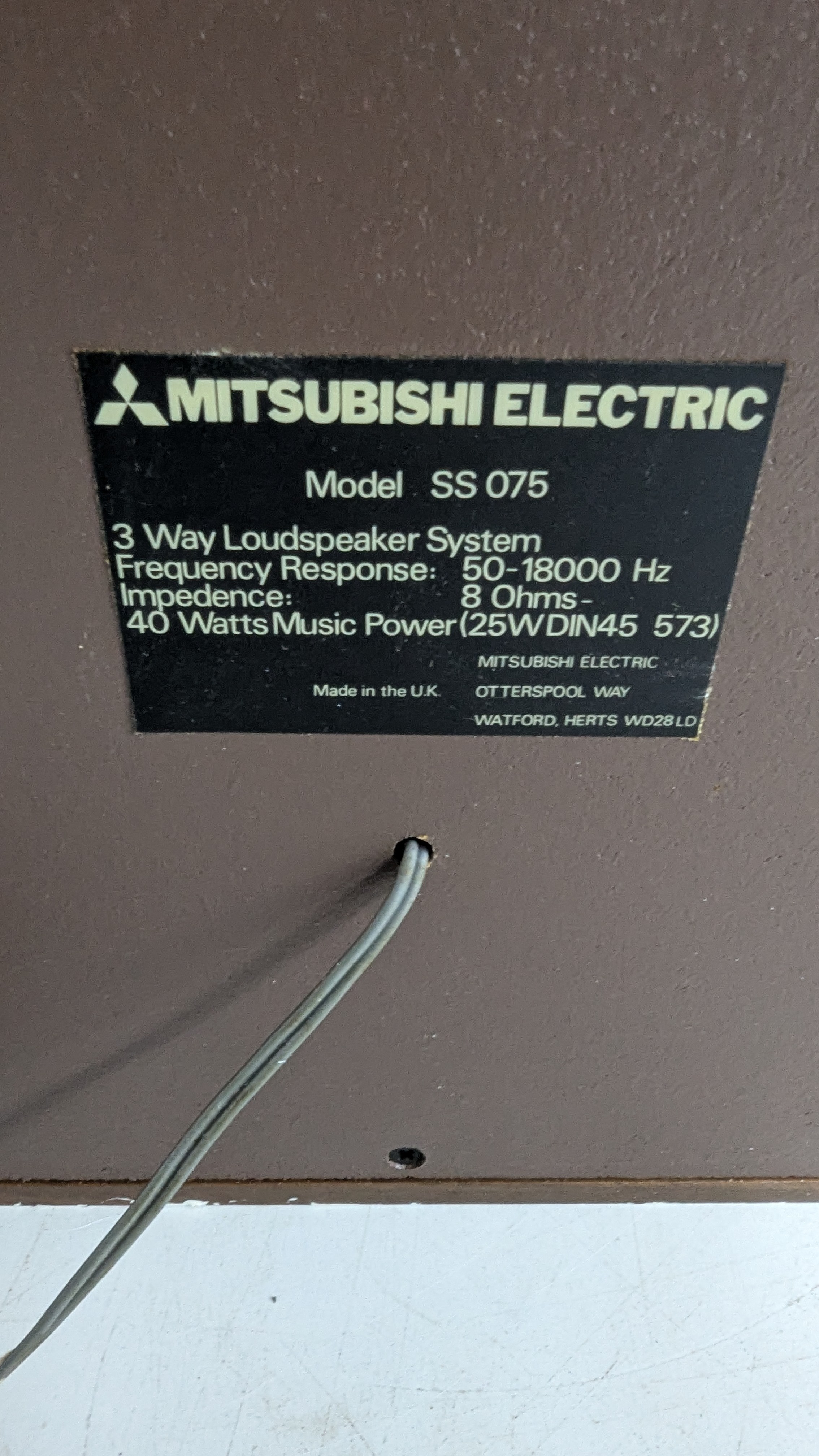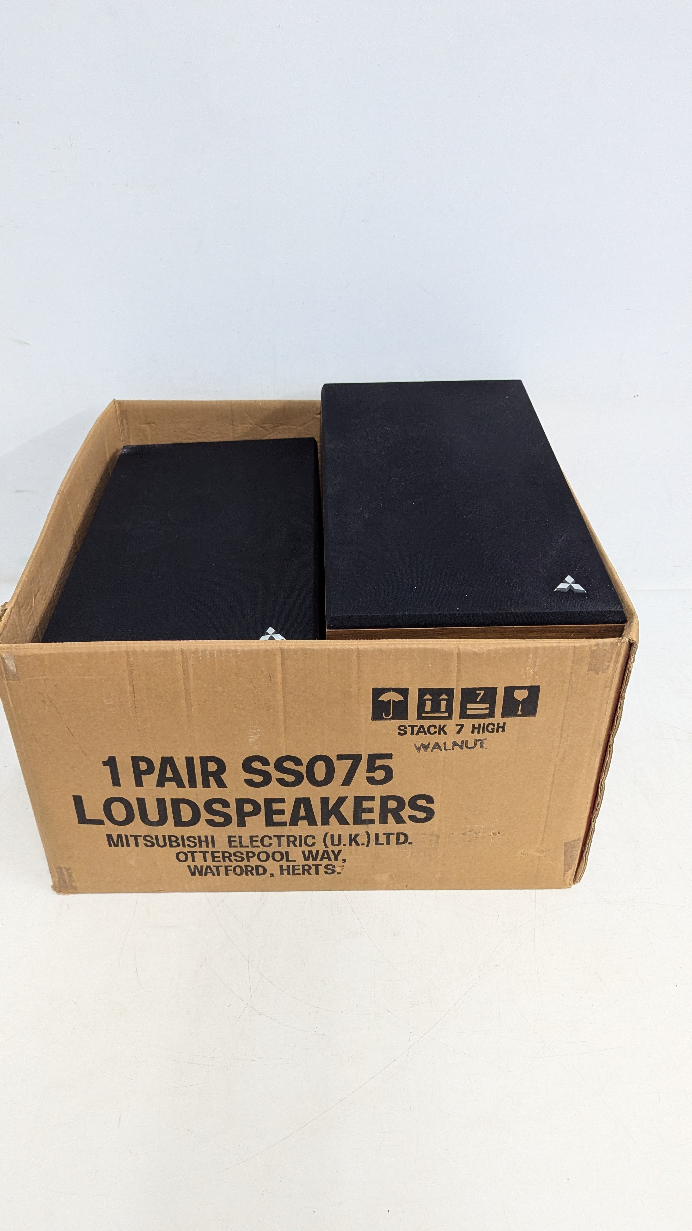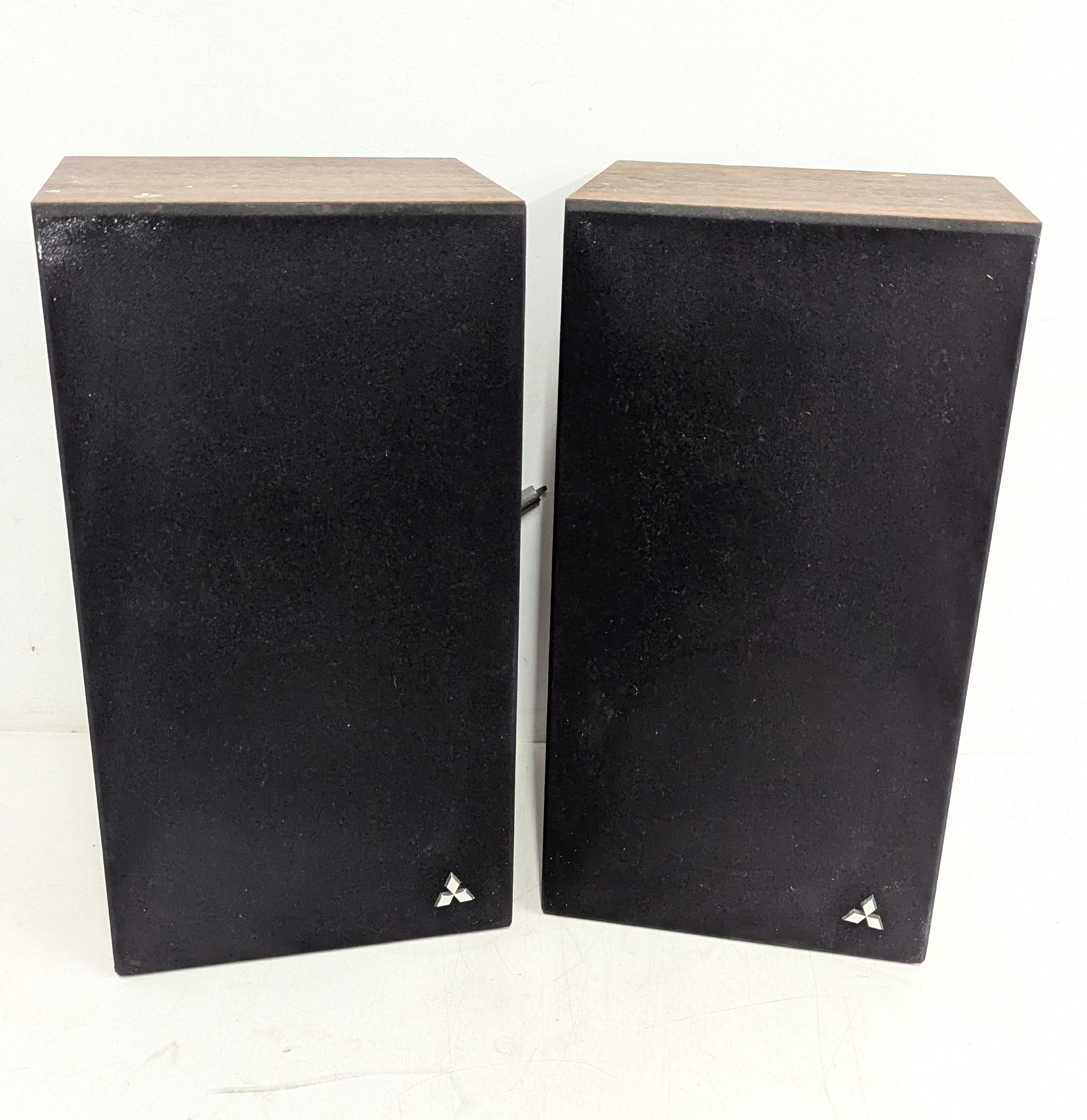 A 1970s Japanese-made stereo music system incorporating record deck, cassette deck and AM/FM tuner, with matching Mitsubishi SS 075 three-way loudspeakers, frequency response 50–18,000 Hz, 40W music power, complete with connecting cables and original box.