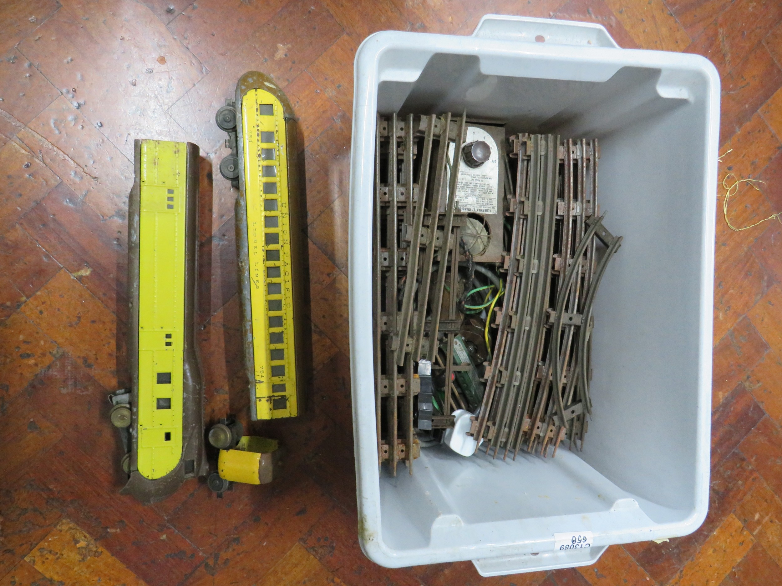Lionel Lines O gauge train set: yellow Union Pacific articulated coaches and locomotive with quantity of three-rail track and transformer