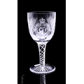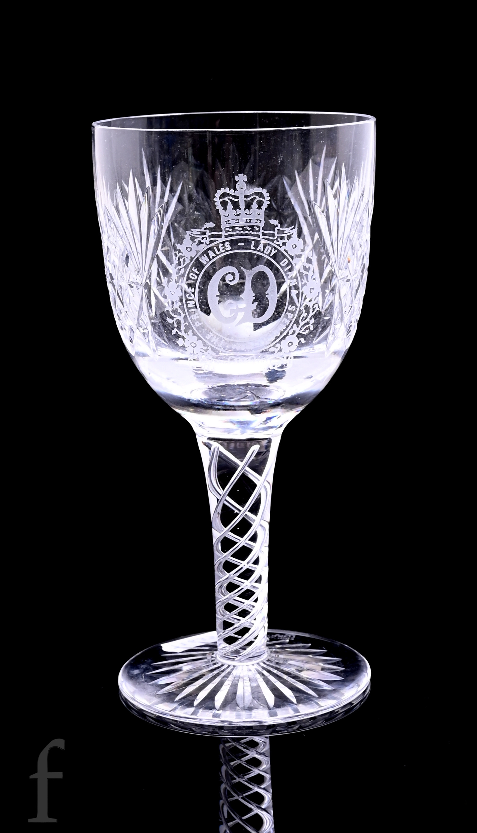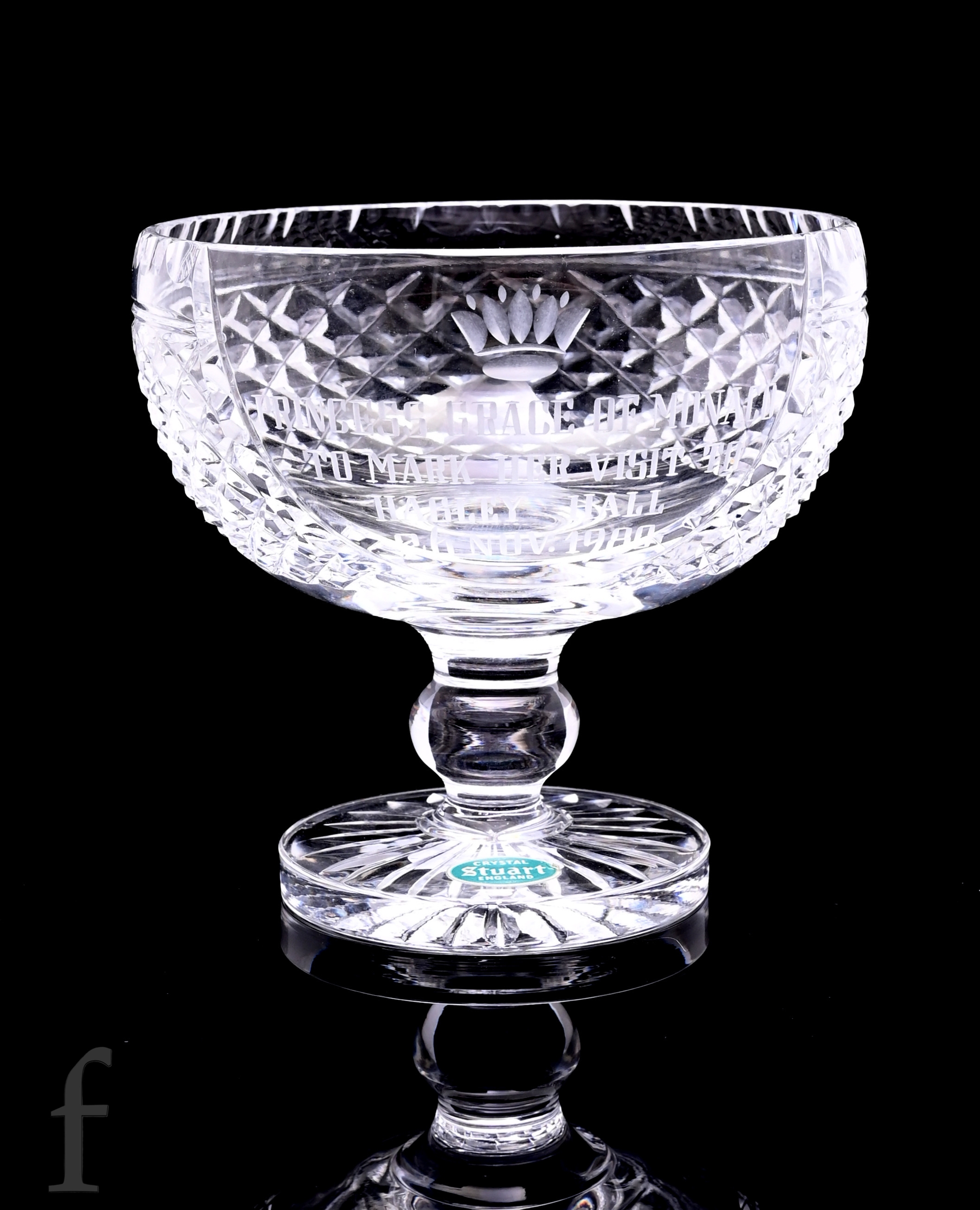 A Stuart Crystal commemorative cut crystal glass chalice to mark the visit of Princess Grace of Monaco to Hagley Hall on 26th November 1980, with dedicated panel over a strawberry diamond ground, raised to a knopped stem and radial star cut foot, together with the presentation menu from the event and programme, also a presentation goblet to commemorate the wedding of The Prince of Wales and Lady Diana Spencer.