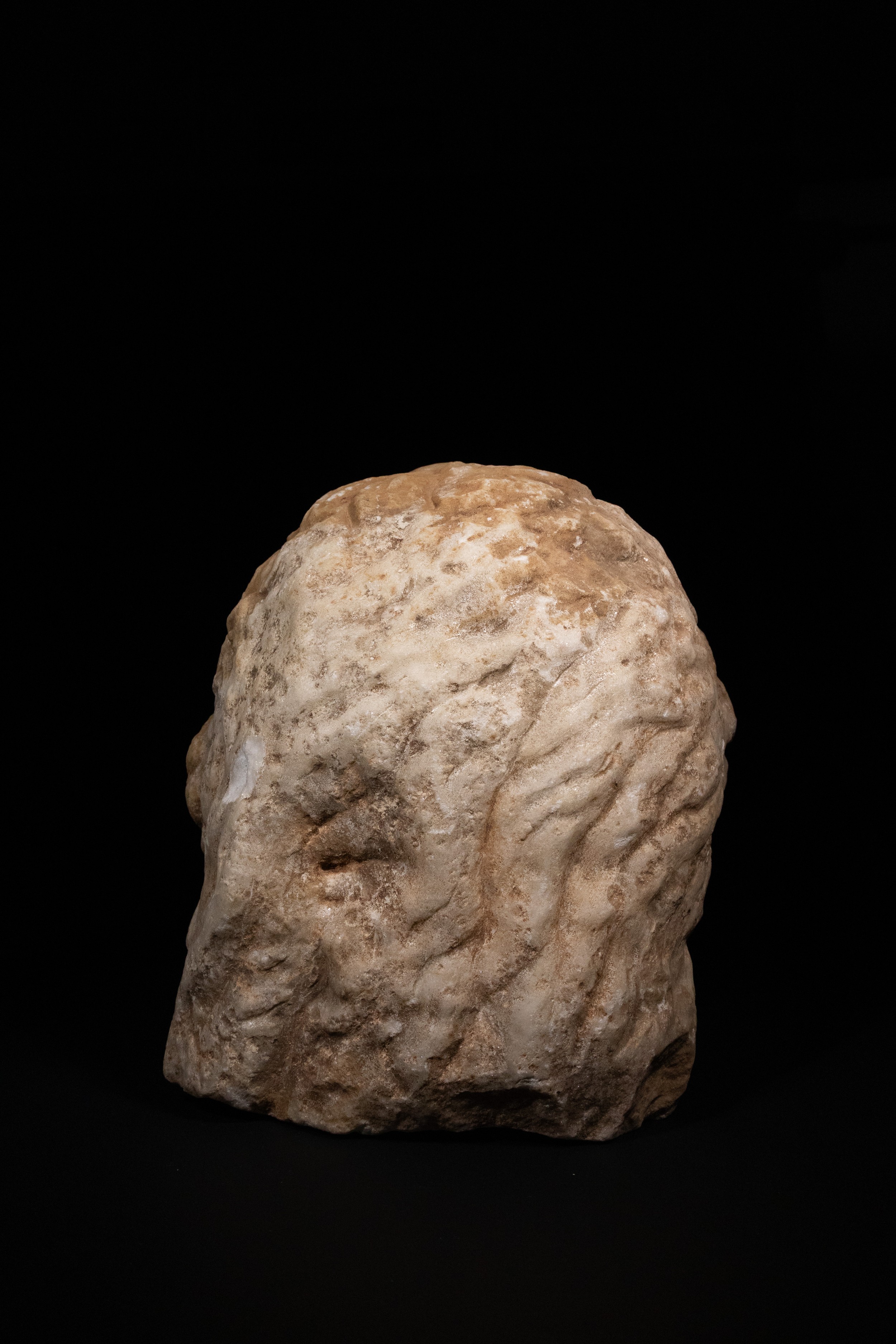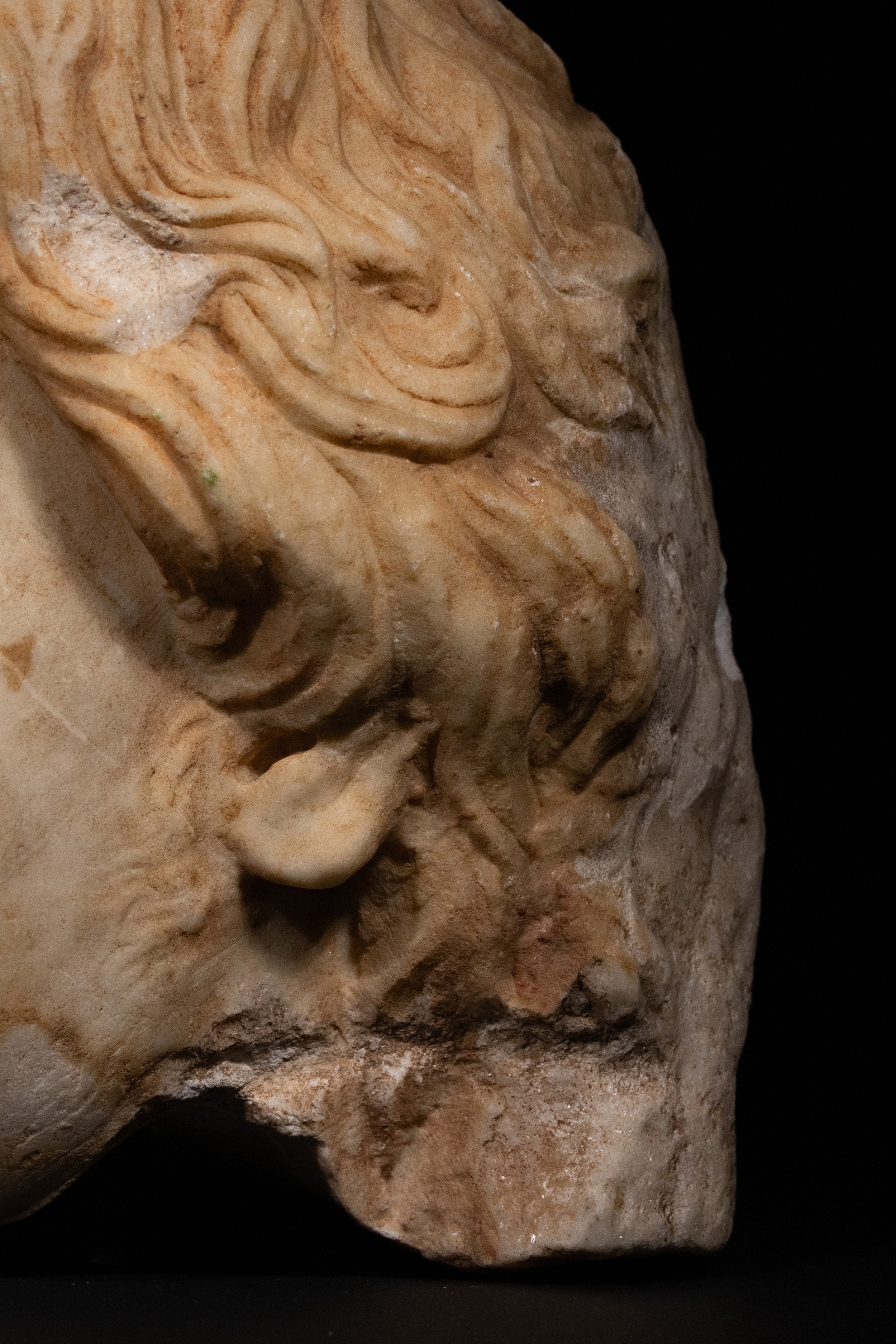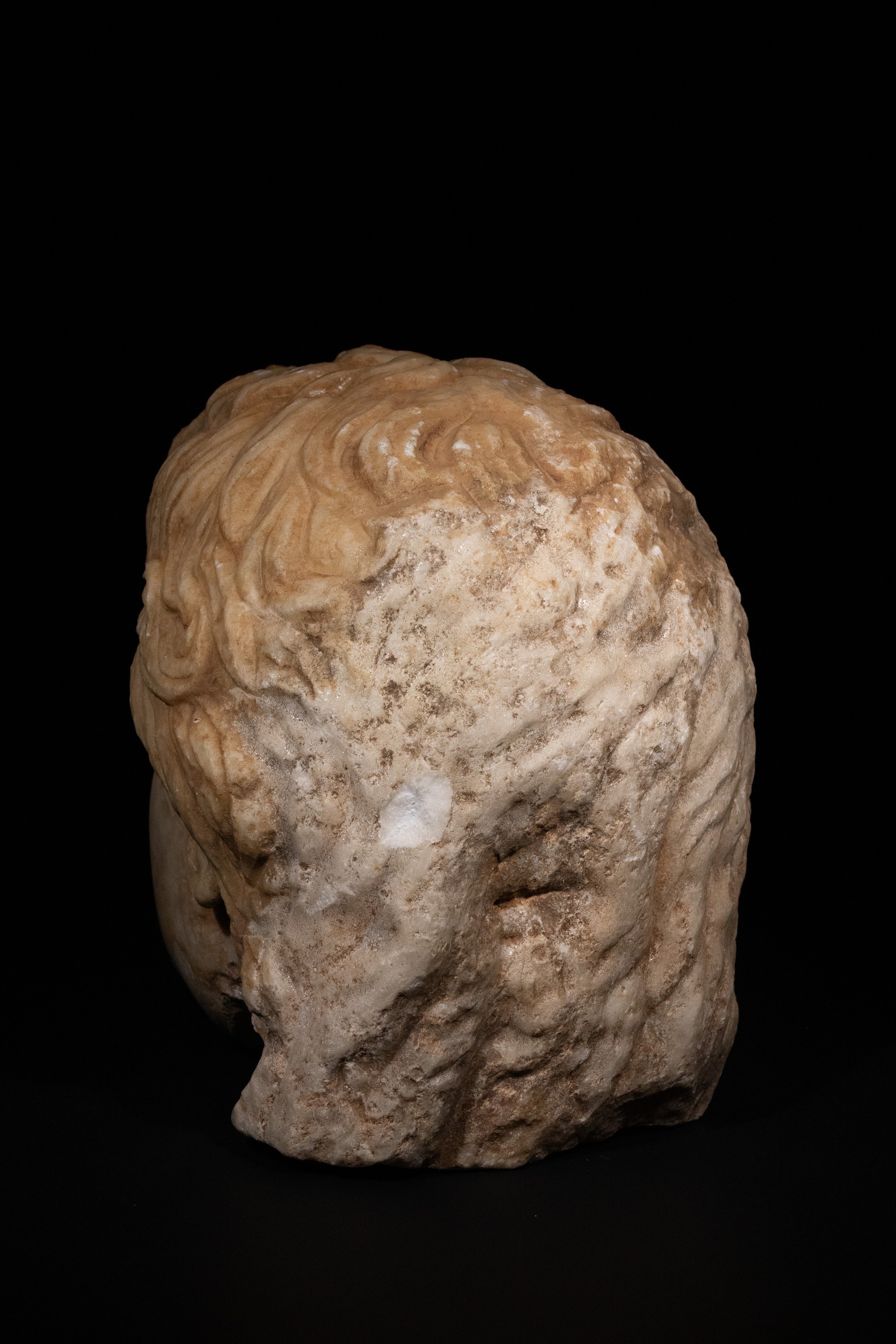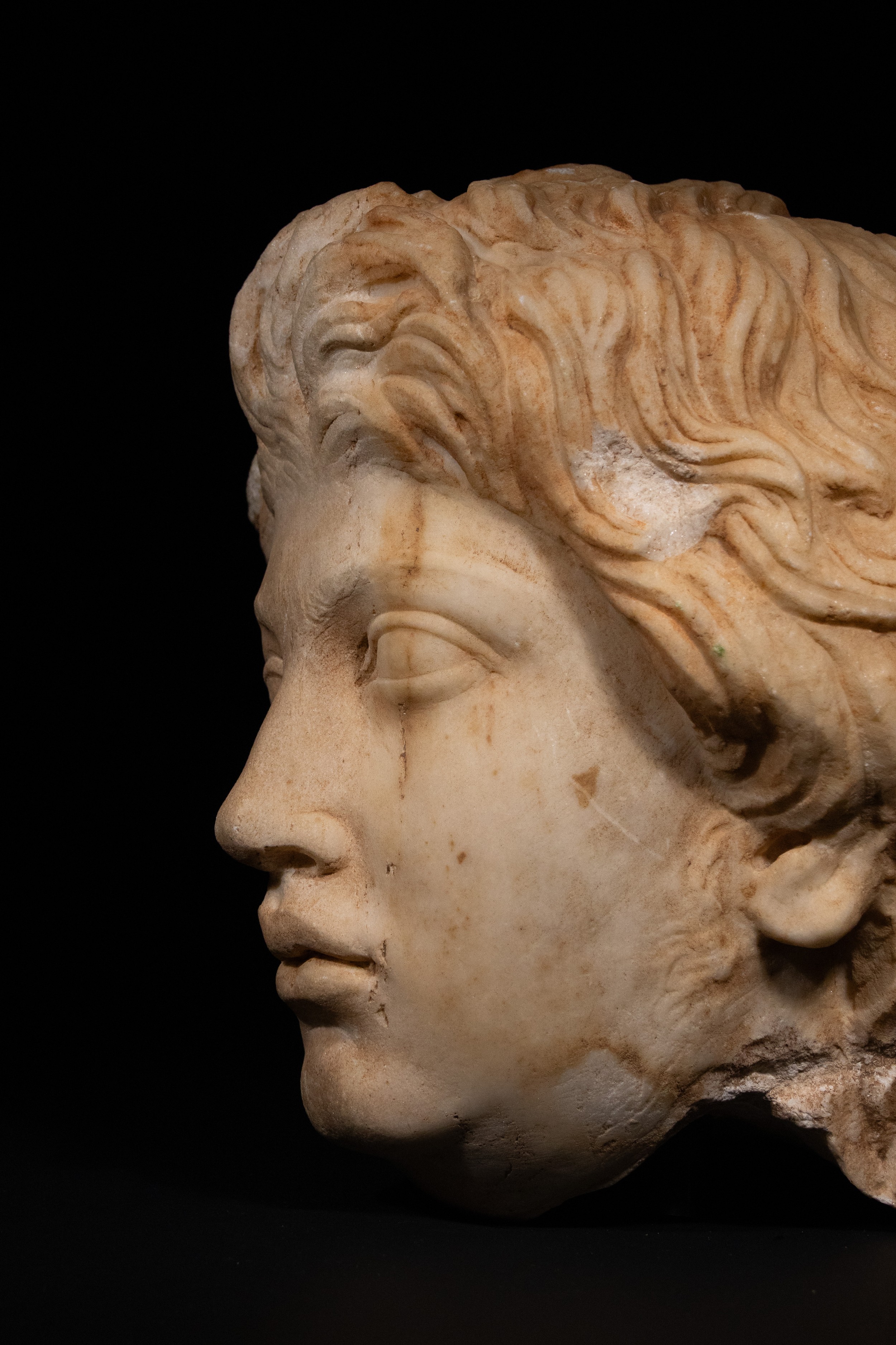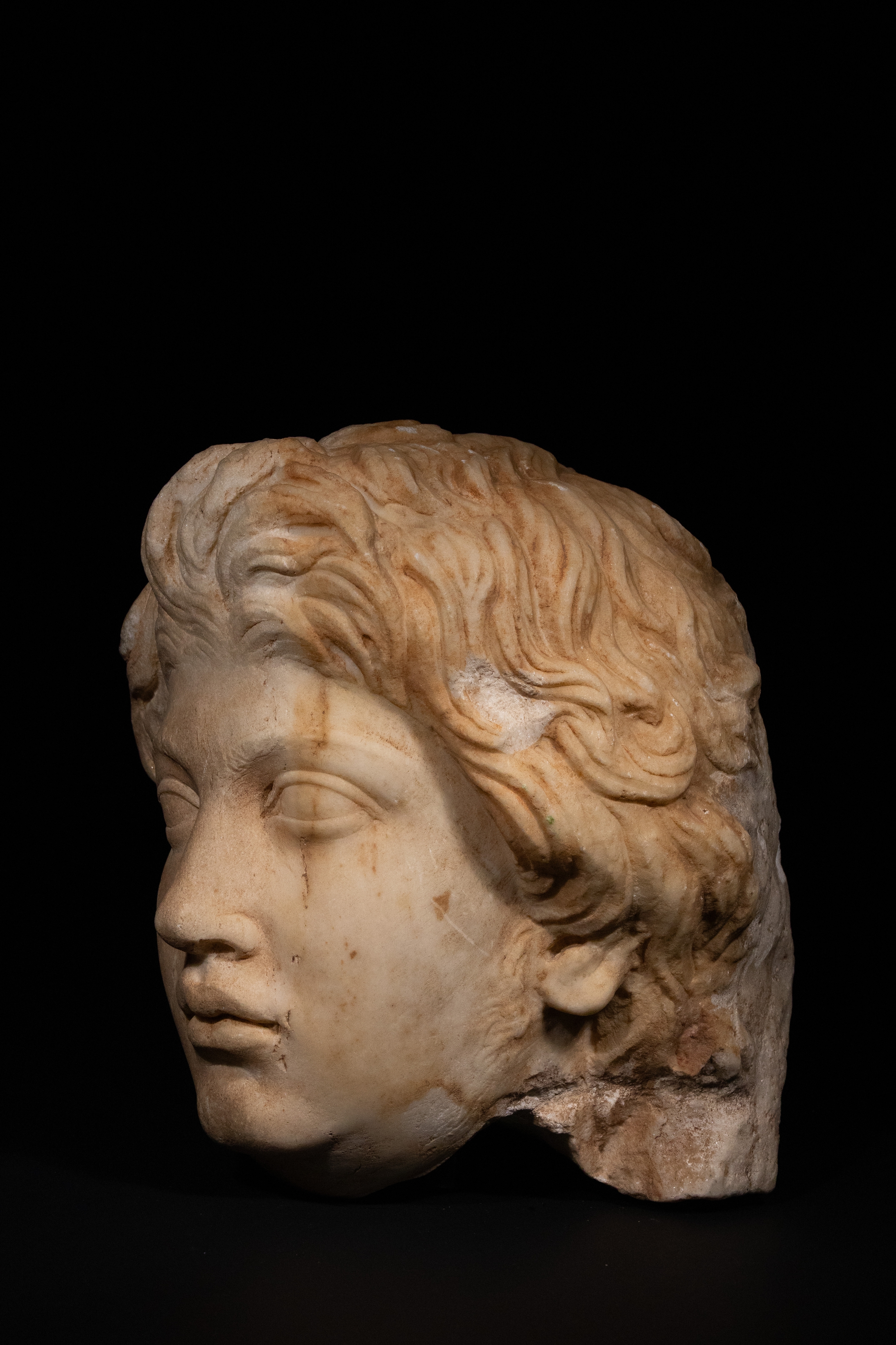 A finely carved Roman marble head representing Antinous, dating to circa 130–140 AD. Shown with his characteristic softly modelled features, full lips, and thick, deeply drilled curling hair, the head displays the idealised beauty associated with imperial portraiture of the Hadrianic period. The marble surface shows attractive age toning throughout, with a serene expression and subtle anatomical detailing. Presented as a fragmentary head, the reverse retains the original break consistent with ancient statuary remains. A powerful and elegant example of Roman sculptural art from the High Empire.