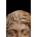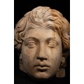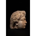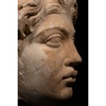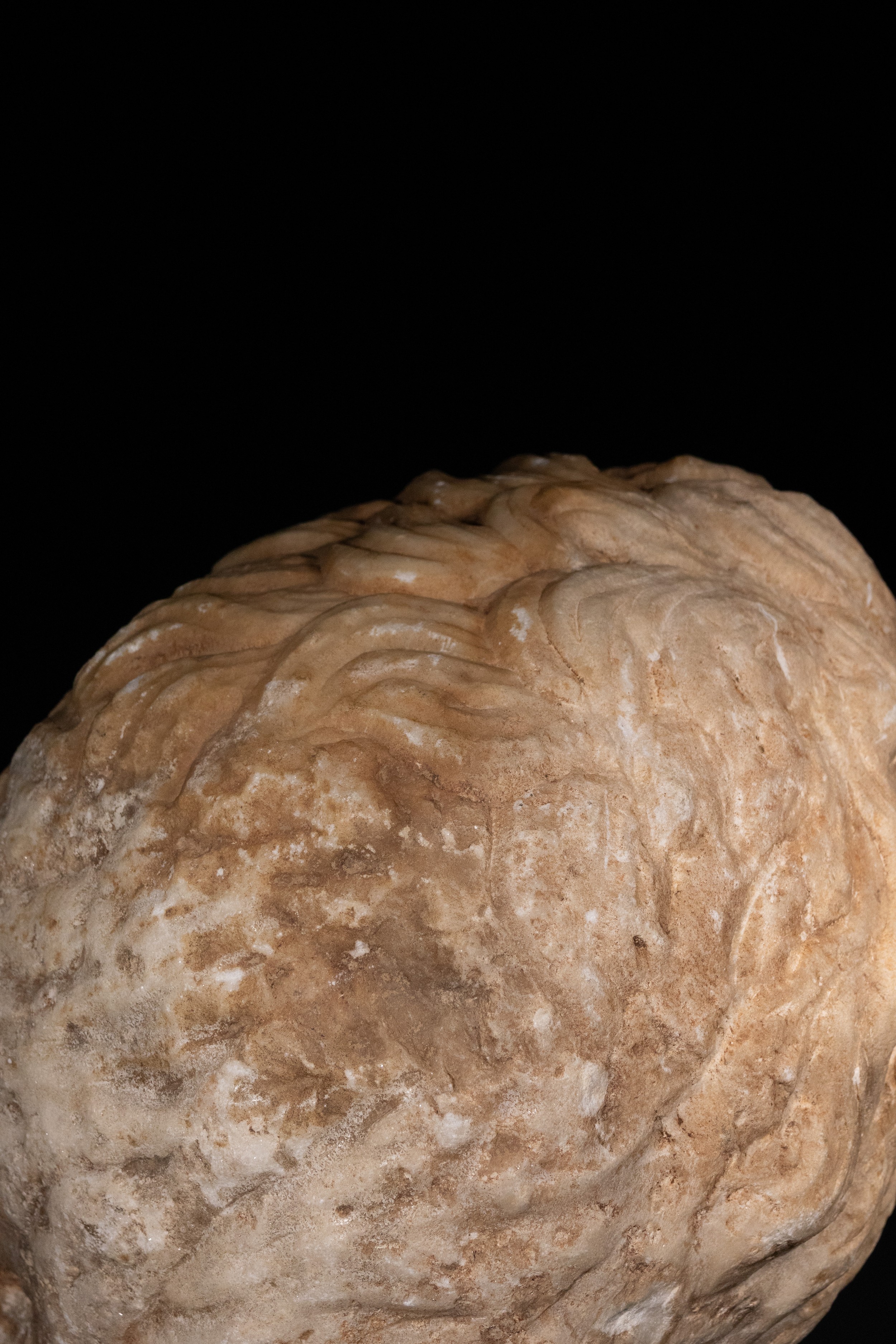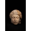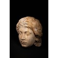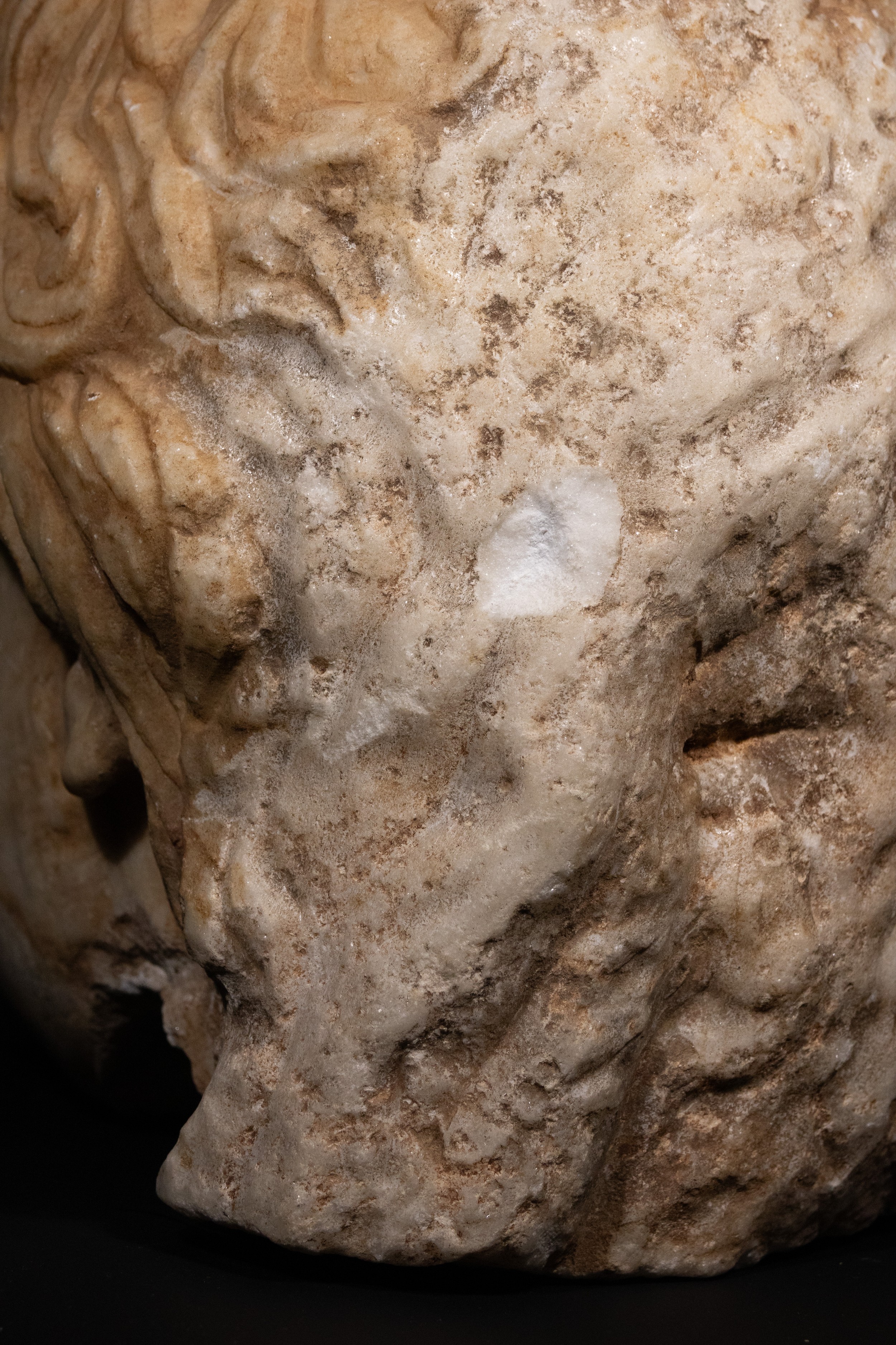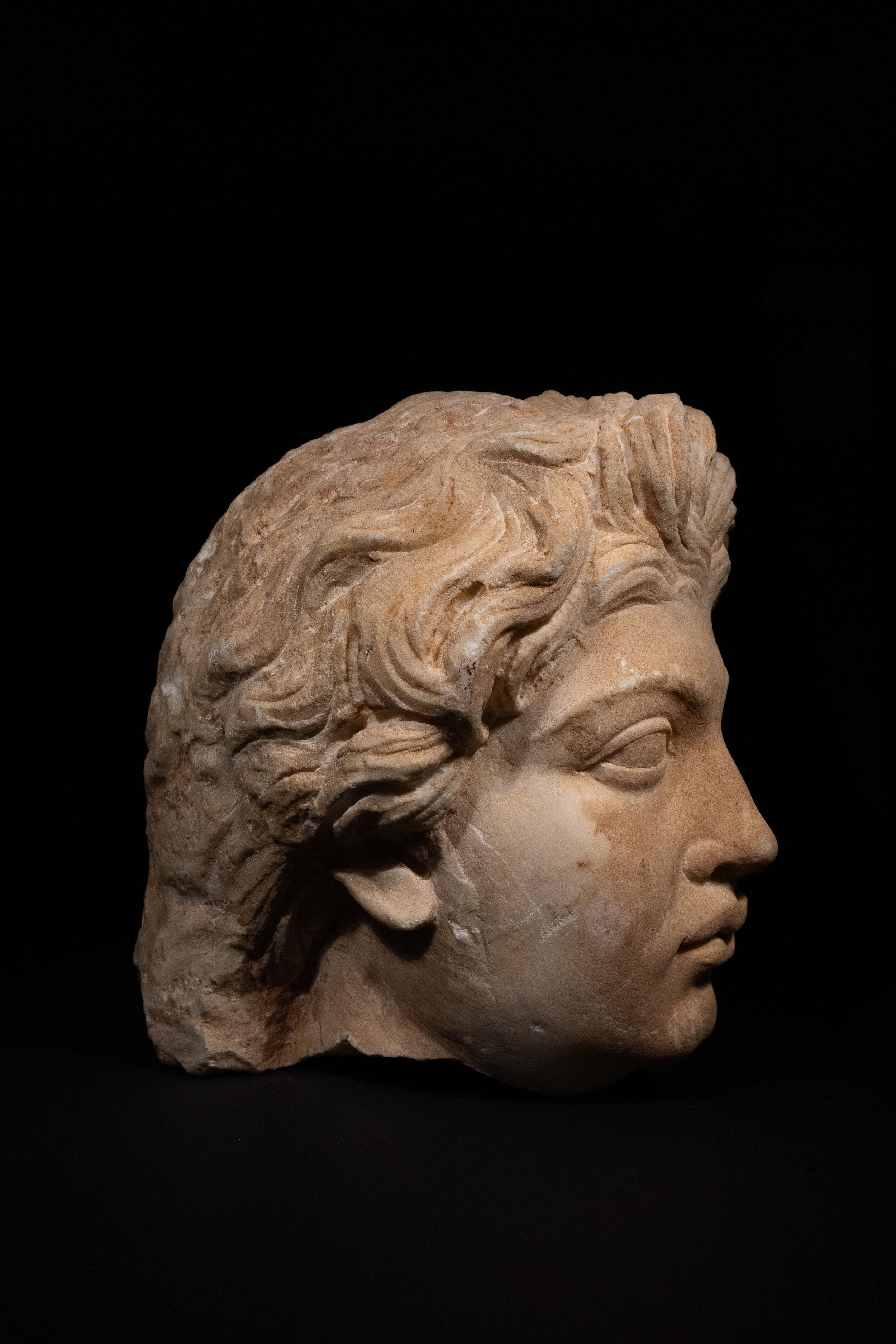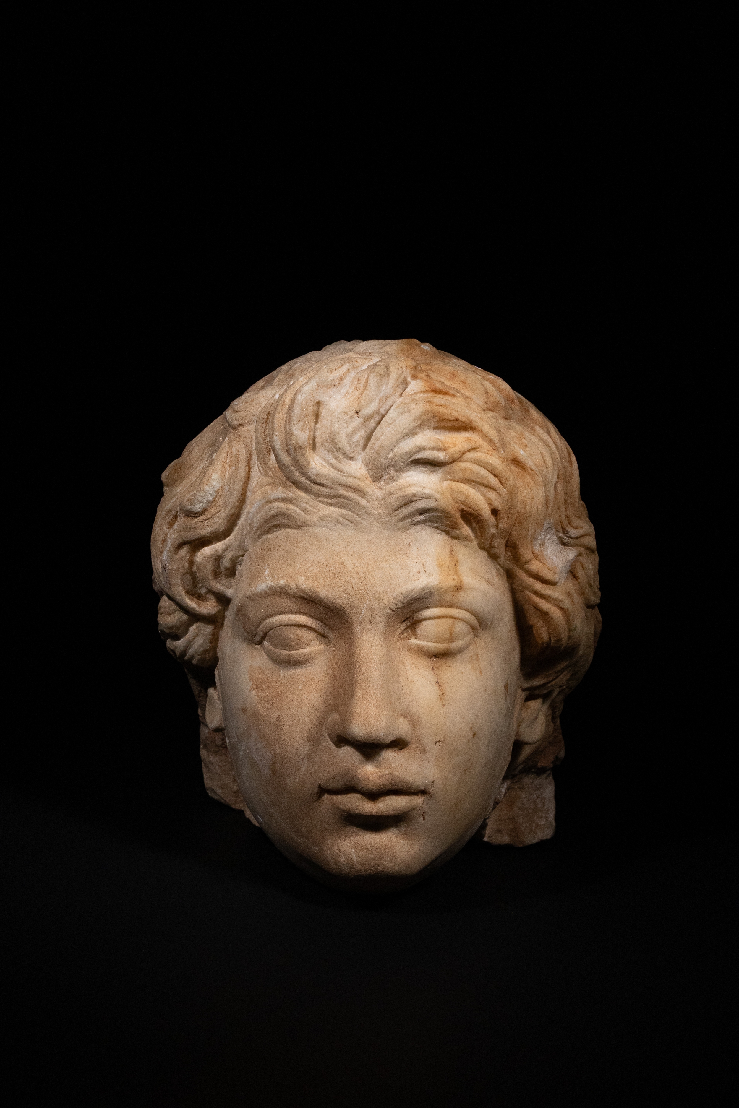 A finely carved Roman marble head representing Antinous, dating to circa 130–140 AD. Shown with his characteristic softly modelled features, full lips, and thick, deeply drilled curling hair, the head displays the idealised beauty associated with imperial portraiture of the Hadrianic period. The marble surface shows attractive age toning throughout, with a serene expression and subtle anatomical detailing. Presented as a fragmentary head, the reverse retains the original break consistent with ancient statuary remains. A powerful and elegant example of Roman sculptural art from the High Empire.