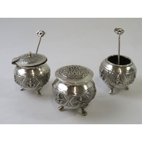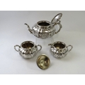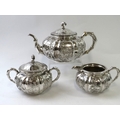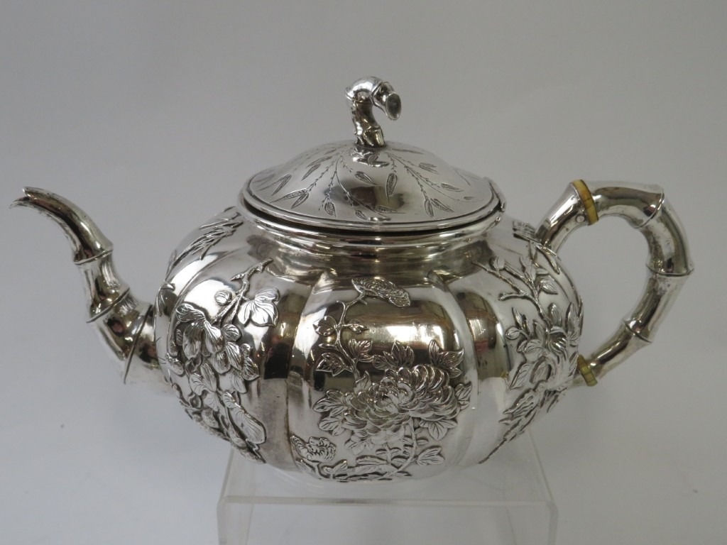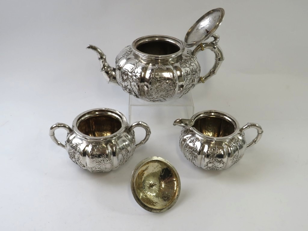 A Chinese export silver three piece tea seat of pumpkin form with floral decoration and bamboo form handles and spout. Marked WH to the base, possibly Wang Hing & Co. Teapot height 12cm, length 23cm. Approx gross weight 1,264 grams.