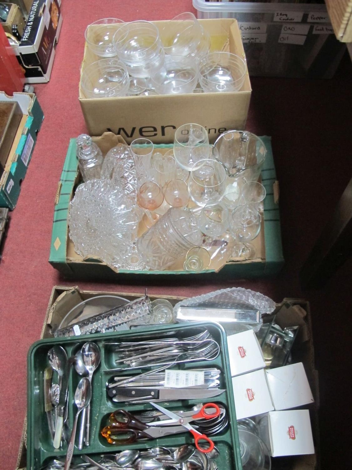 Glassware, napkin rings, cutlery:- Three Boxes