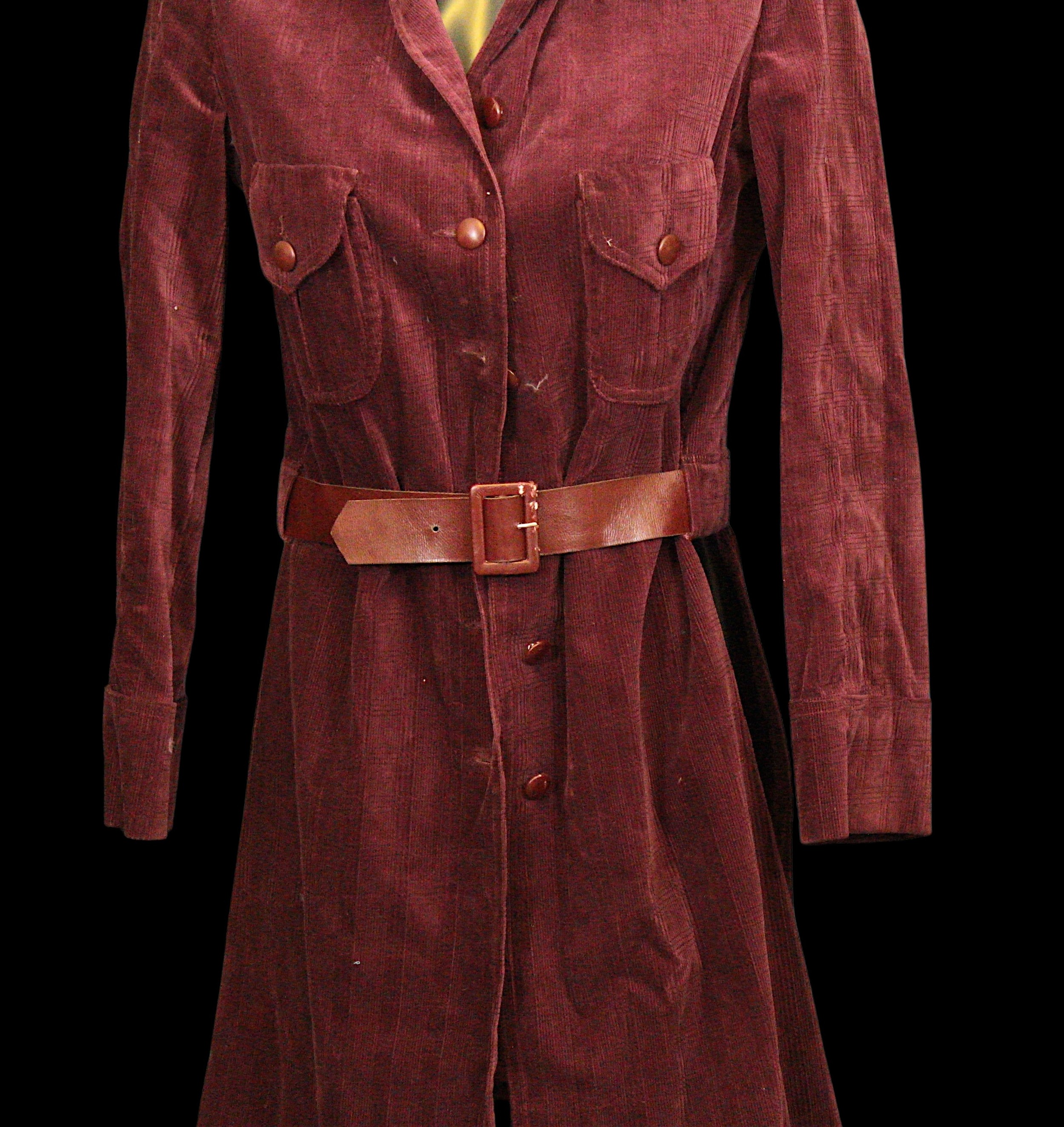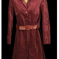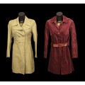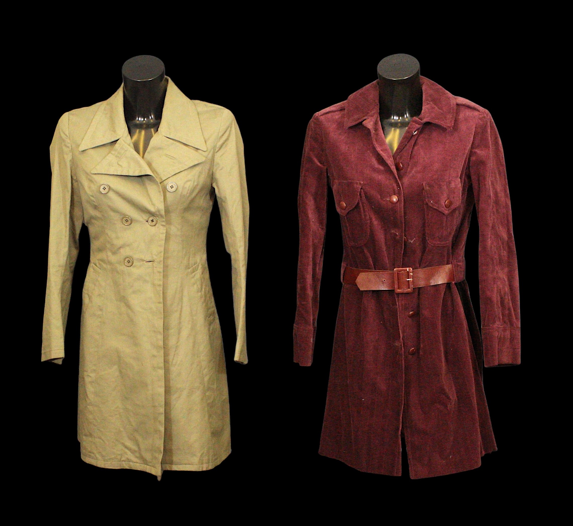 including: a Pierre d'Alby, Paris burgundy corduroy coat, with matching belt, labelled and additionally with costume designer 'Maxine Leighton and a Marion Foale and Sally Tiffin khaki trench coat, labelled and size 10 (2)