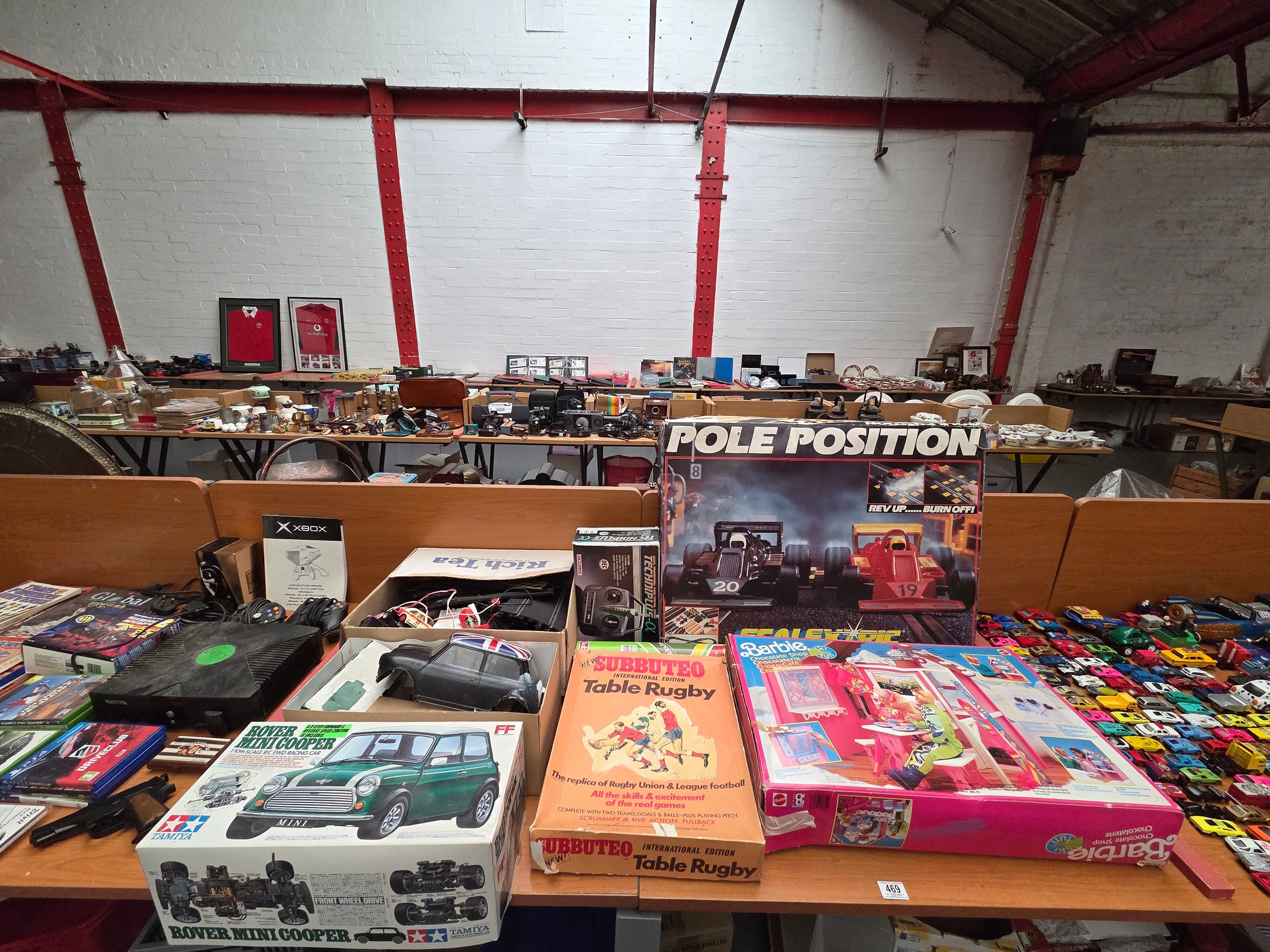 Scalextric car set, Subbuteo table rugby, Barbie set etc.