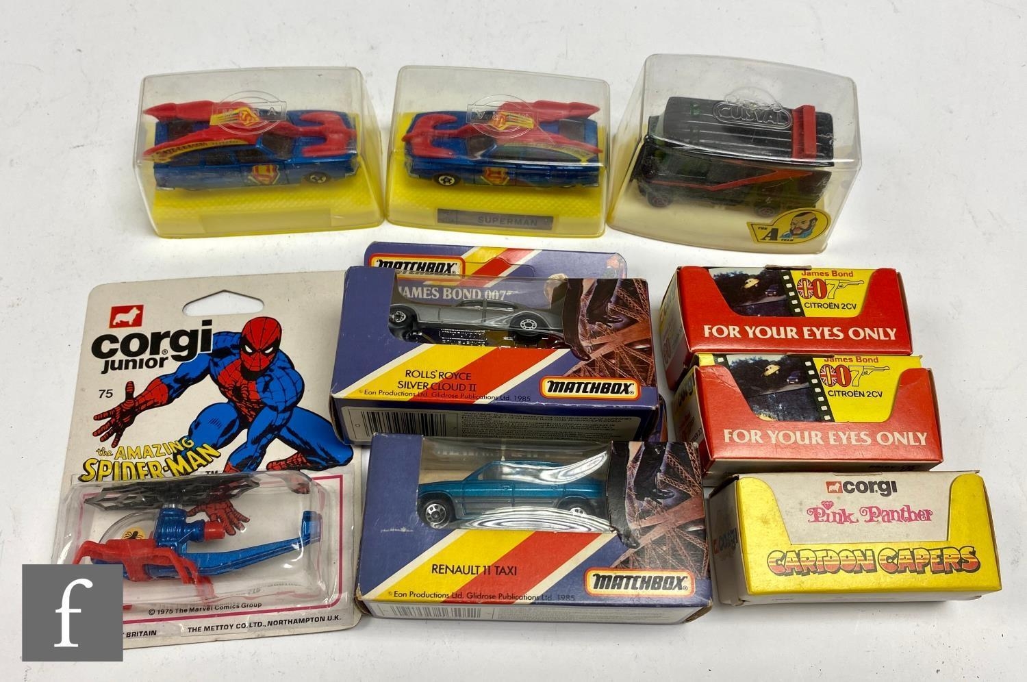 A collection of small scale television and film related diecast to include Corgi Juniors The Amazing Spider-Man Helicopter, Guisval A-Team van, two Mira Superman cars, Matchbox James Bond A View to a Kill Renault 11 Taxi, Matchbox A View to a Kill Rolls Royce Silver Cloud II, two Corgi For Your Eyes Only Citroen 2CV and Corgi Pink Panther bike, all boxed or bubble packed. (9)
