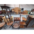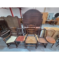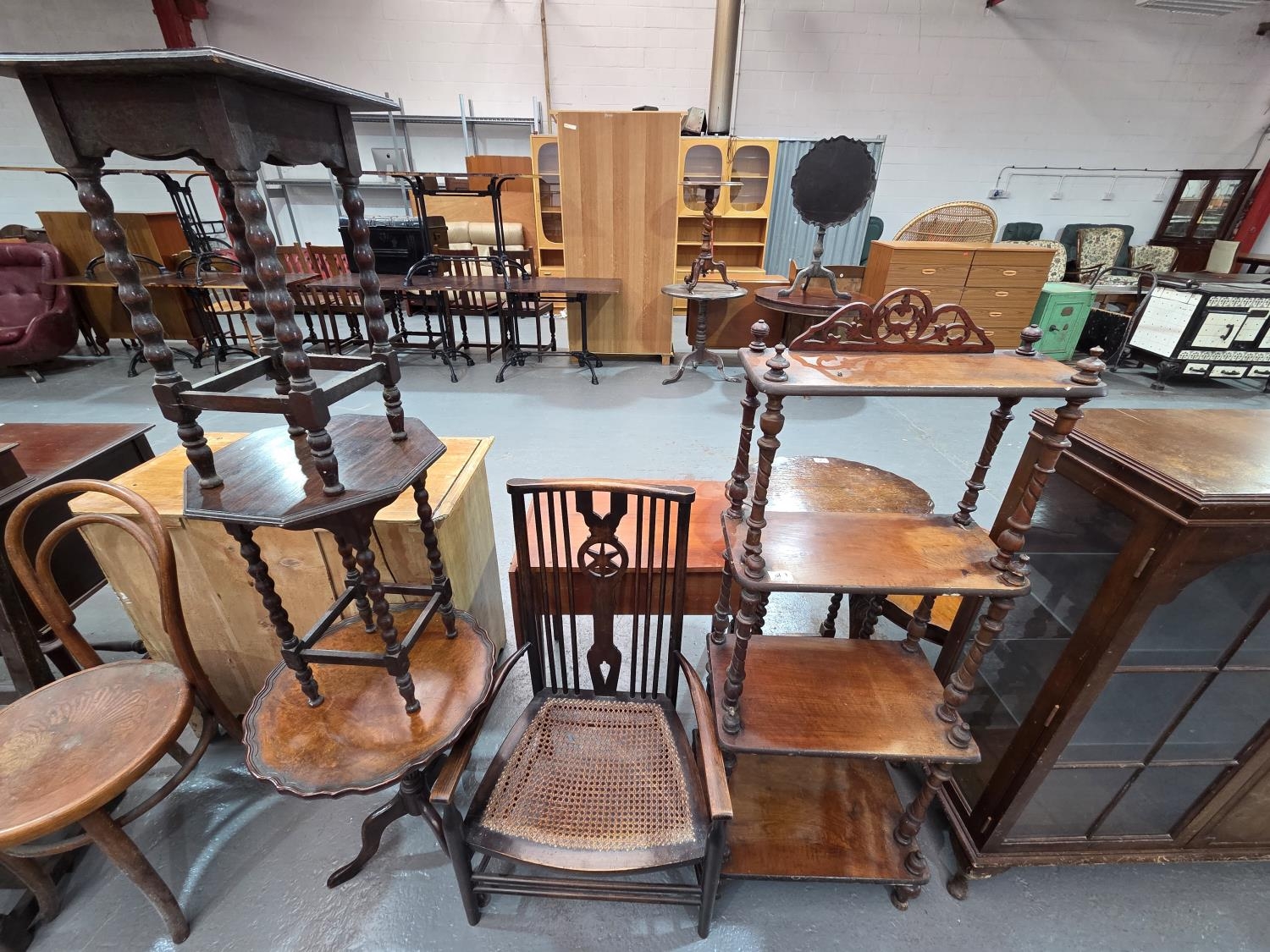 A four tier whatnot, two oak side tables, occasional table and a rush seated armchair