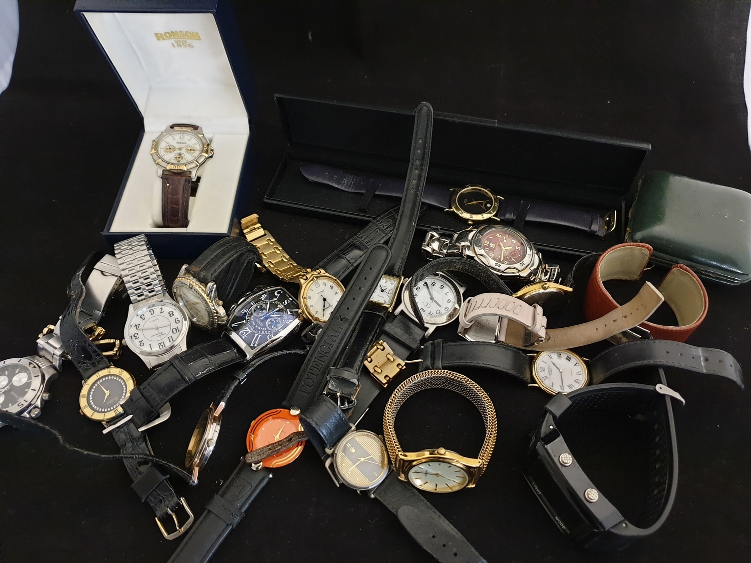 A box of assorted gents watches to include a boxed Ronson, approximately 18 in total -