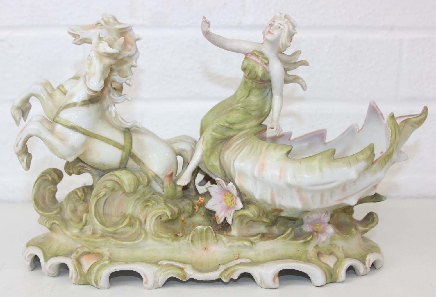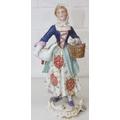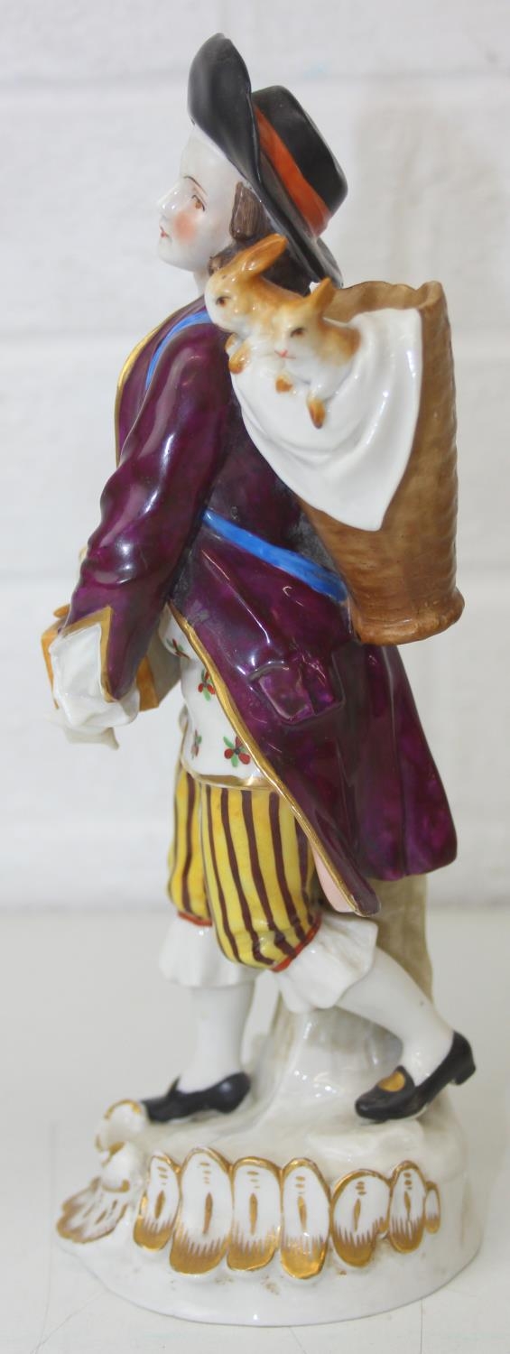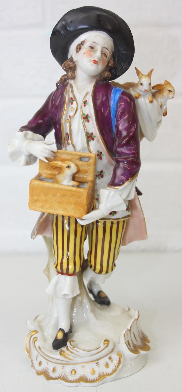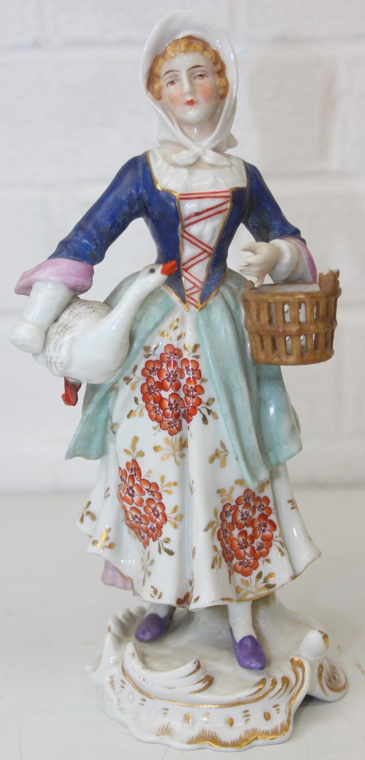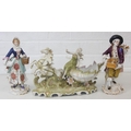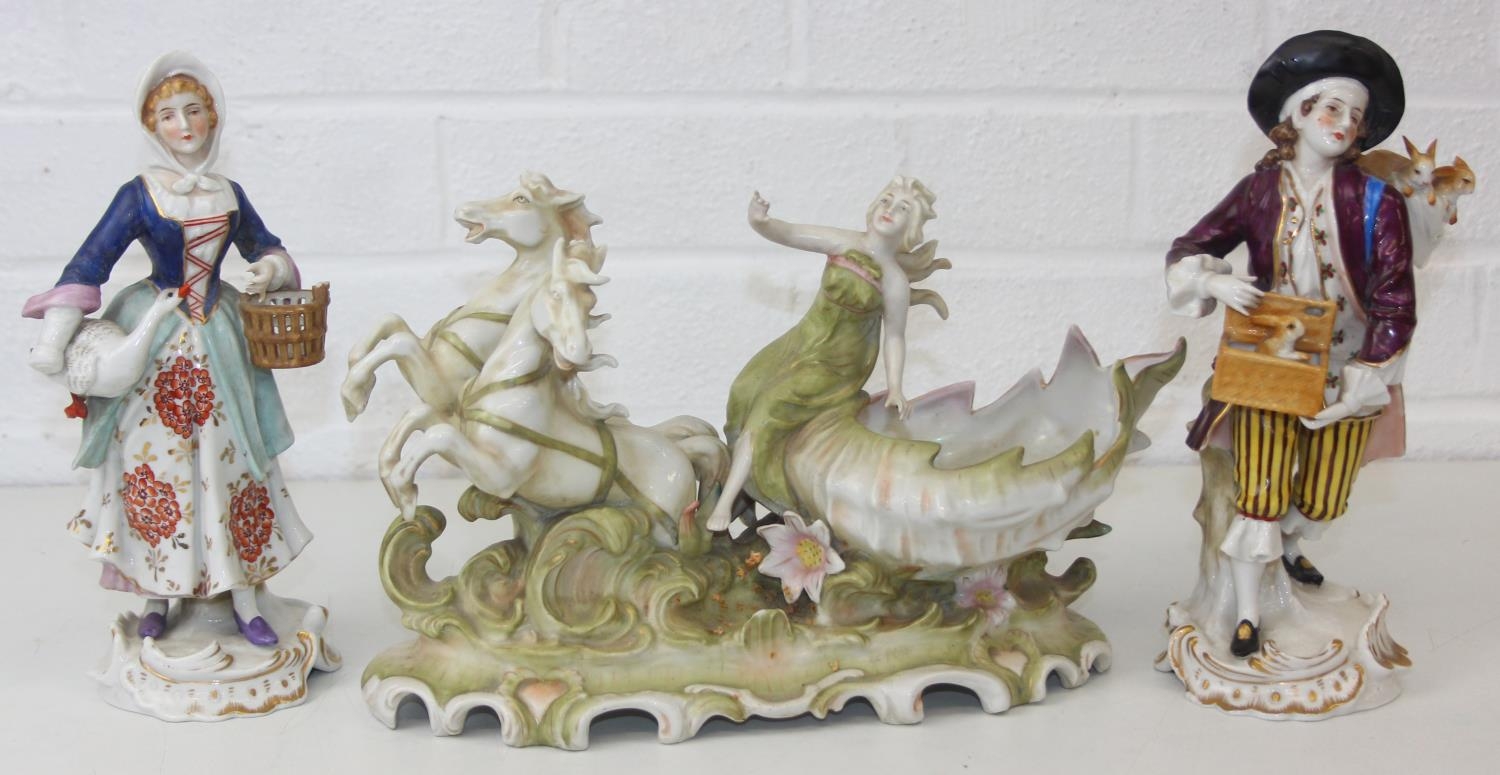 Three assorted antique porcelain figures, to inc a woman with horses and two figurines, all likely Continental, the two figures possibly Sitzendorf but bearing a Chelsea style gold anchor mark, the largest 25cm tall [3]