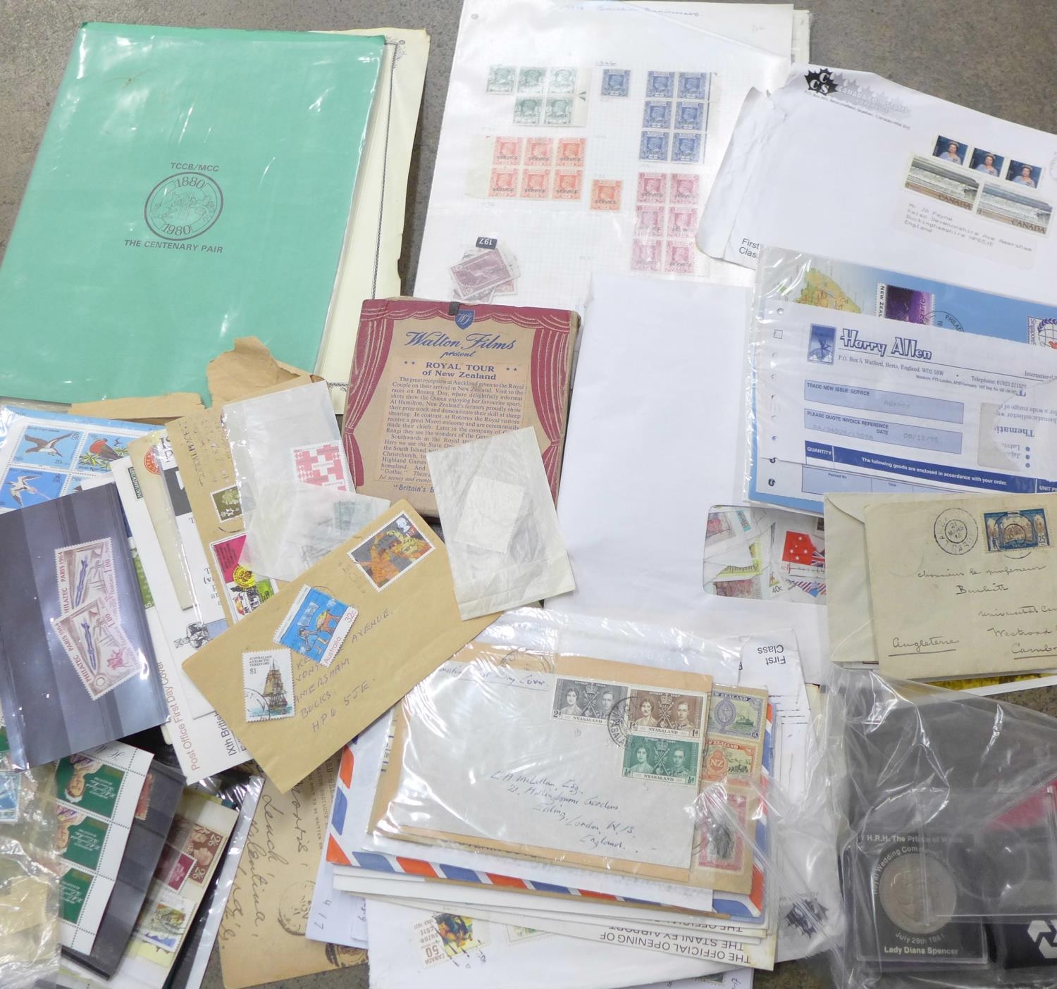 A collection of stamps including New Zealand, commemorative coins and a Watton Films Royal Tour of New Zealand