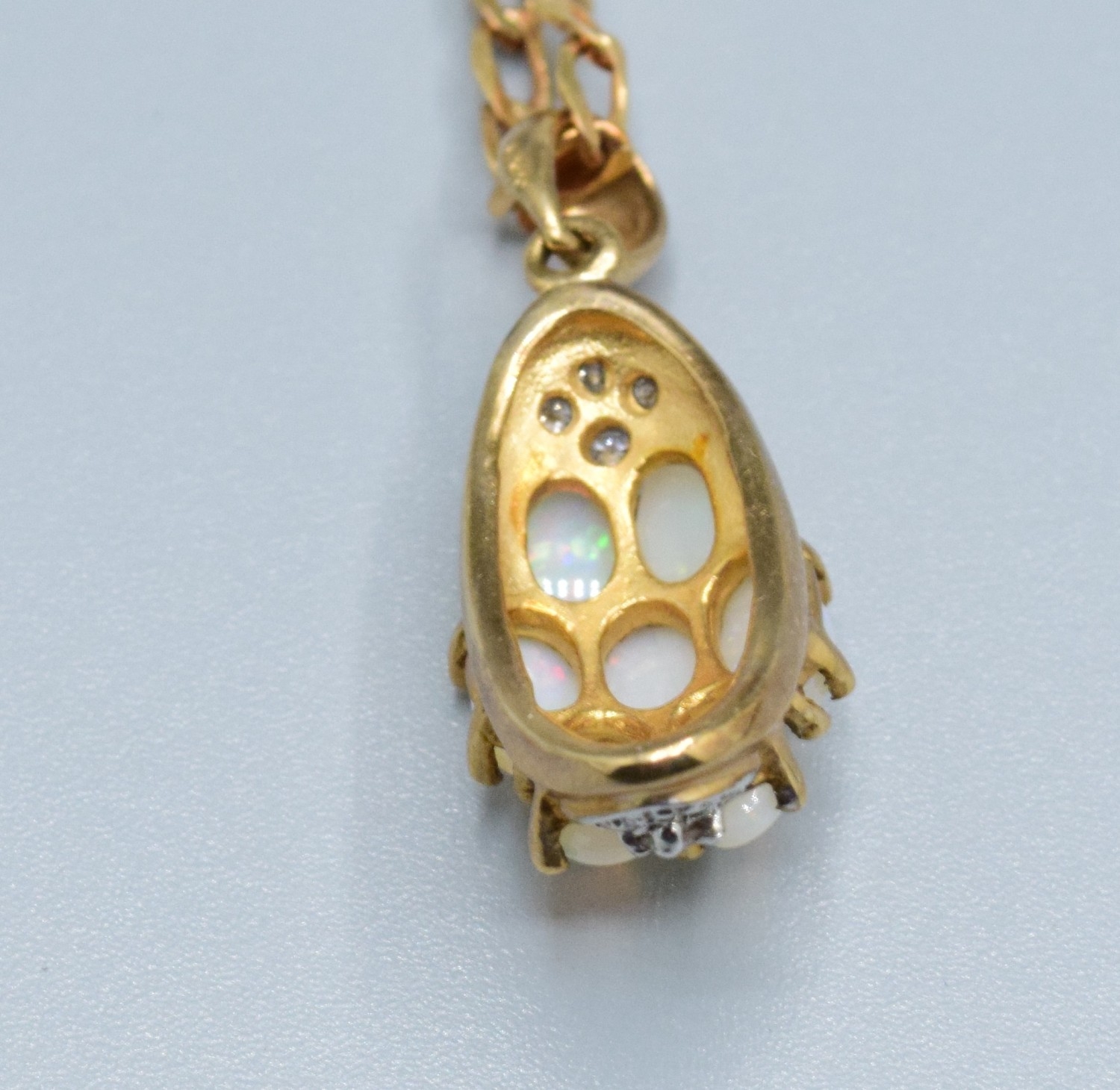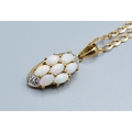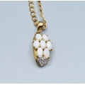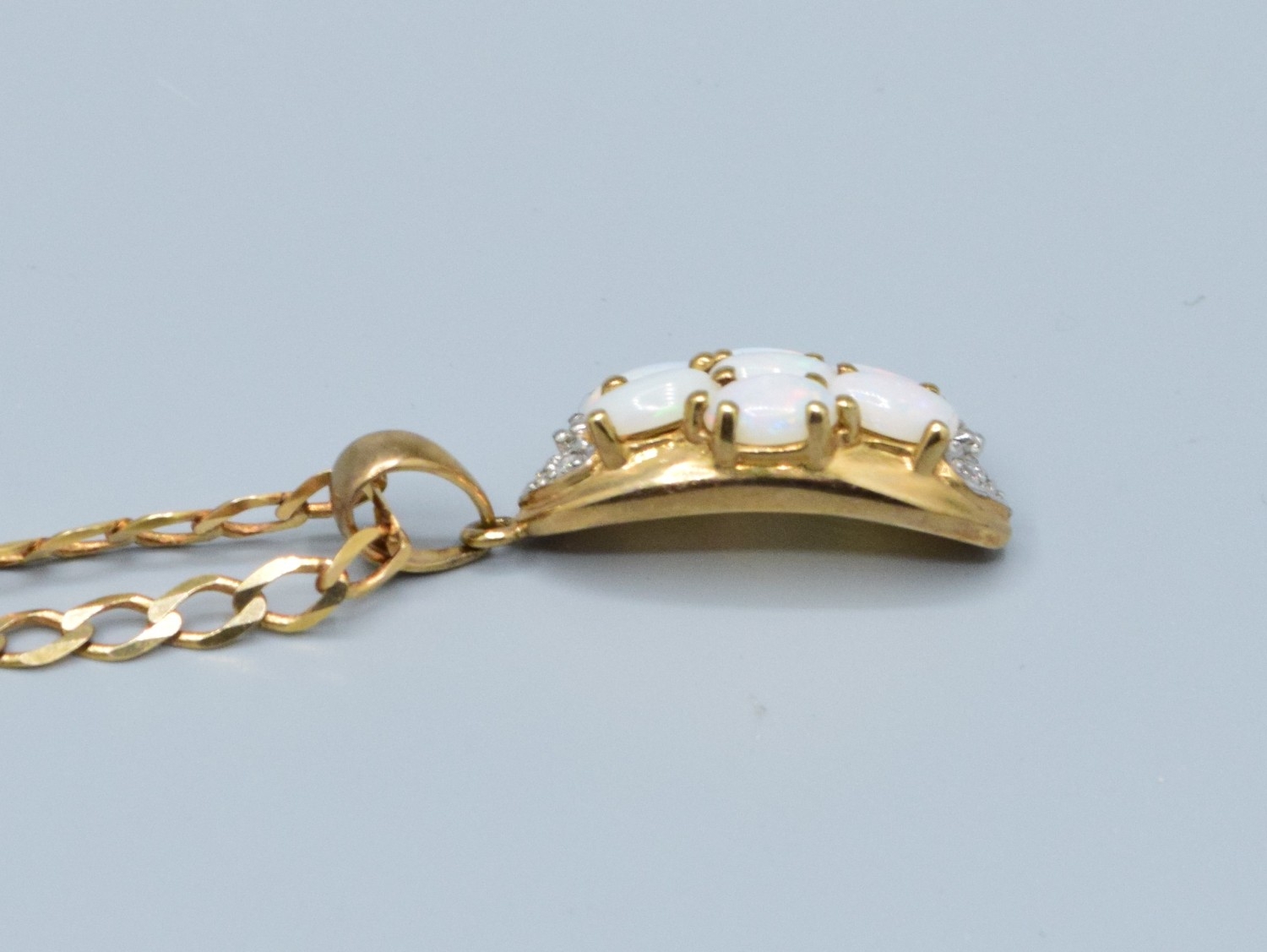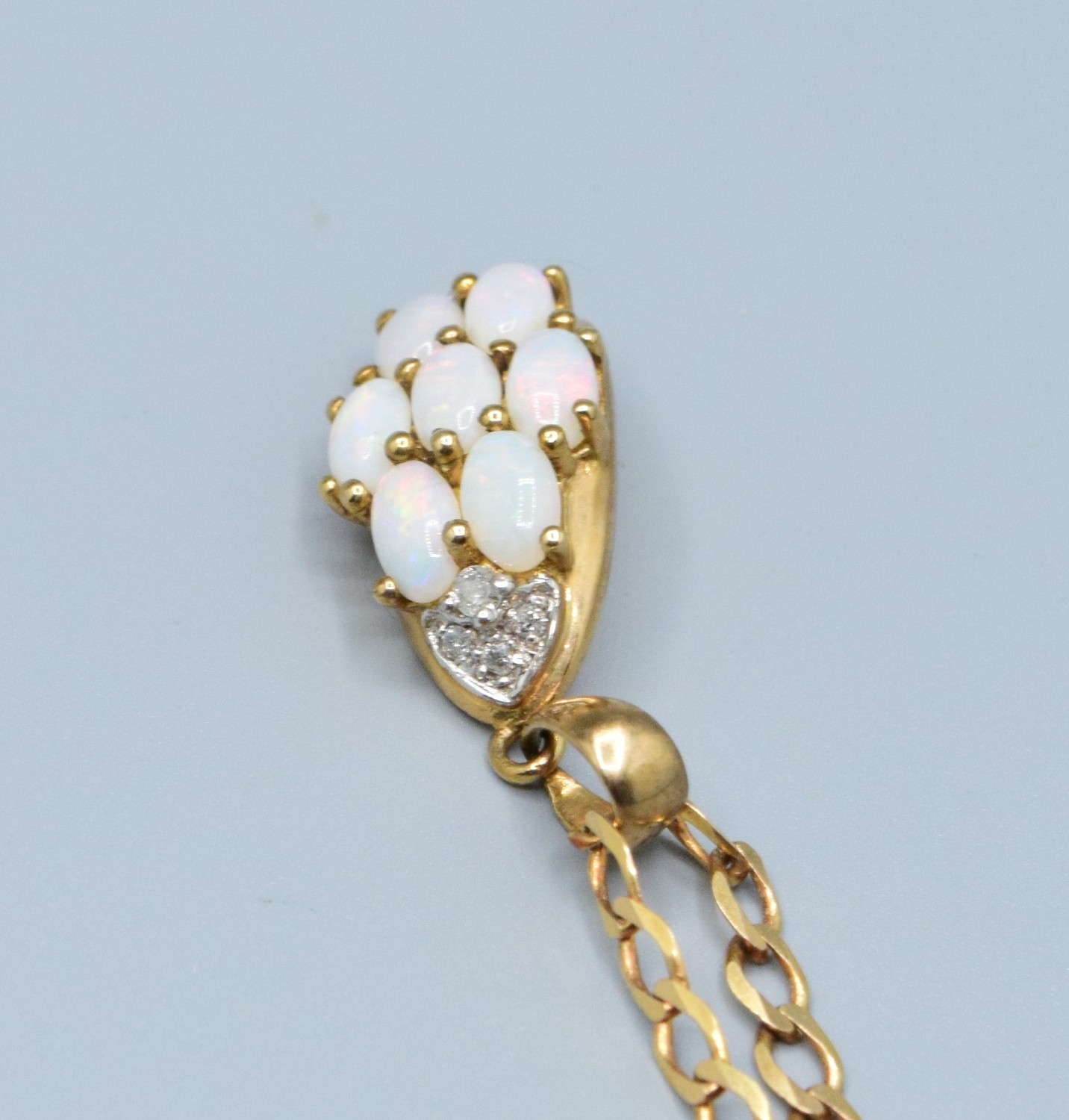 Excellent example of a fire Opal and Diamond drop pendant necklace on a gold chain all in 9ct gold, the pendant in a bow enclosed design is 19x10x6mm excluding the bale, the good flat link chain is 44cm long