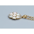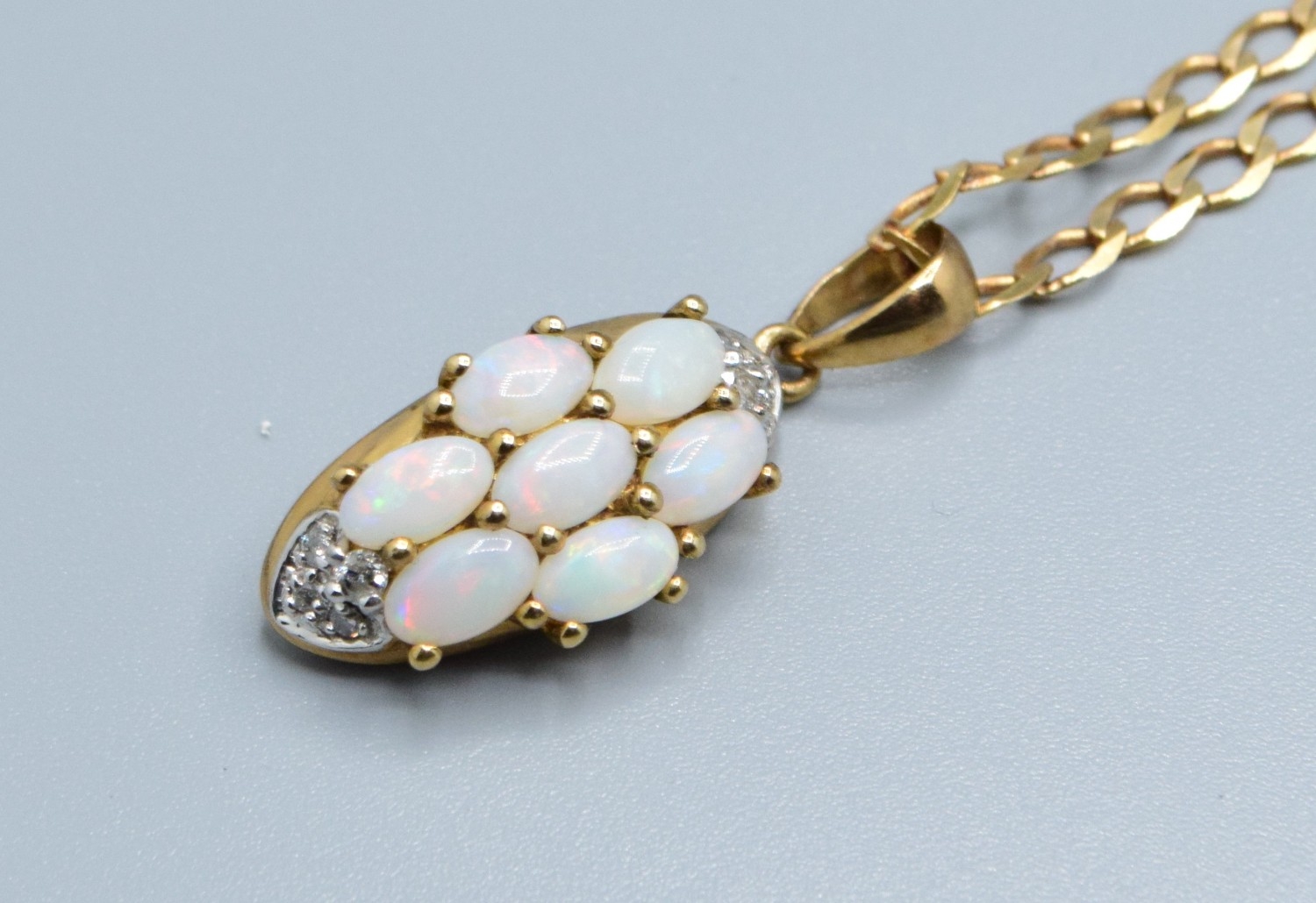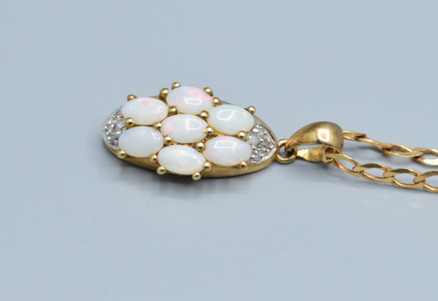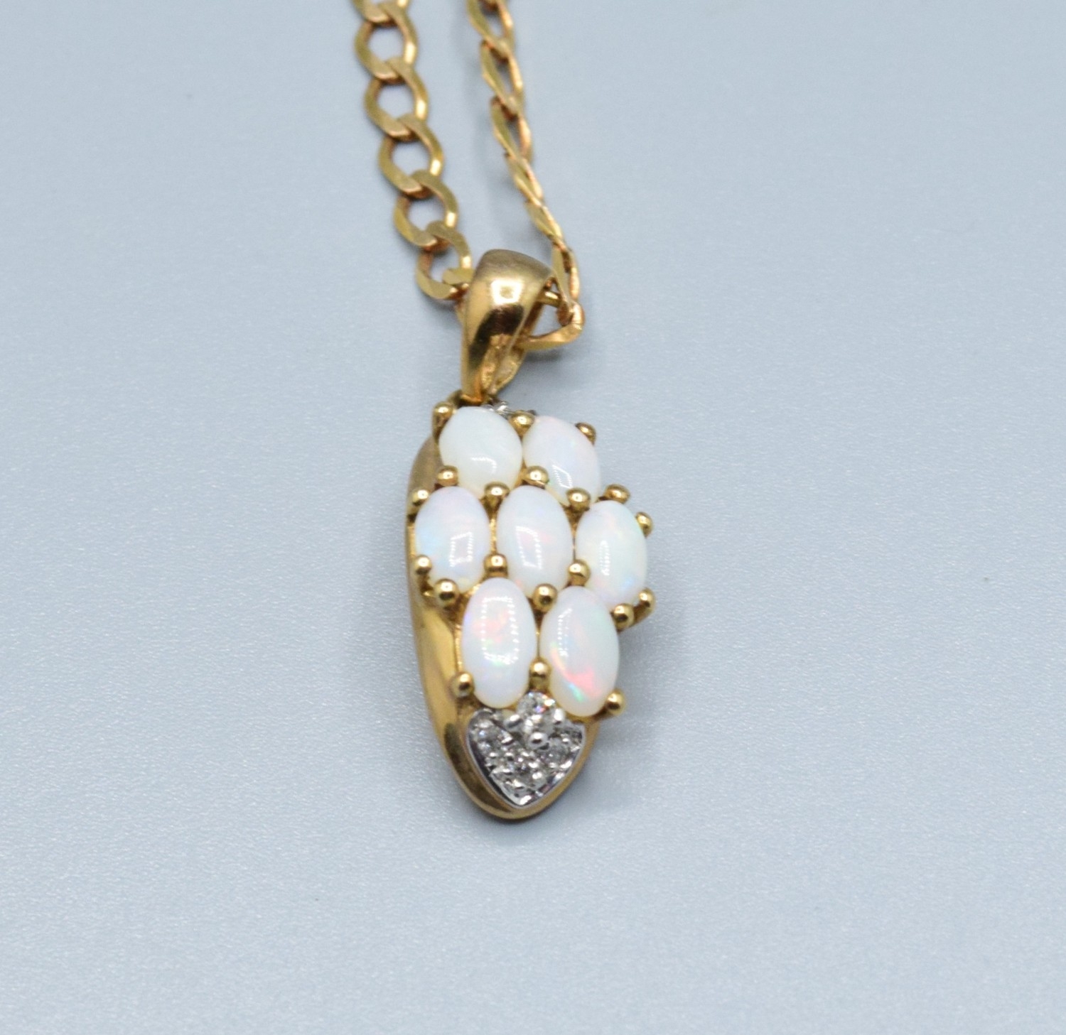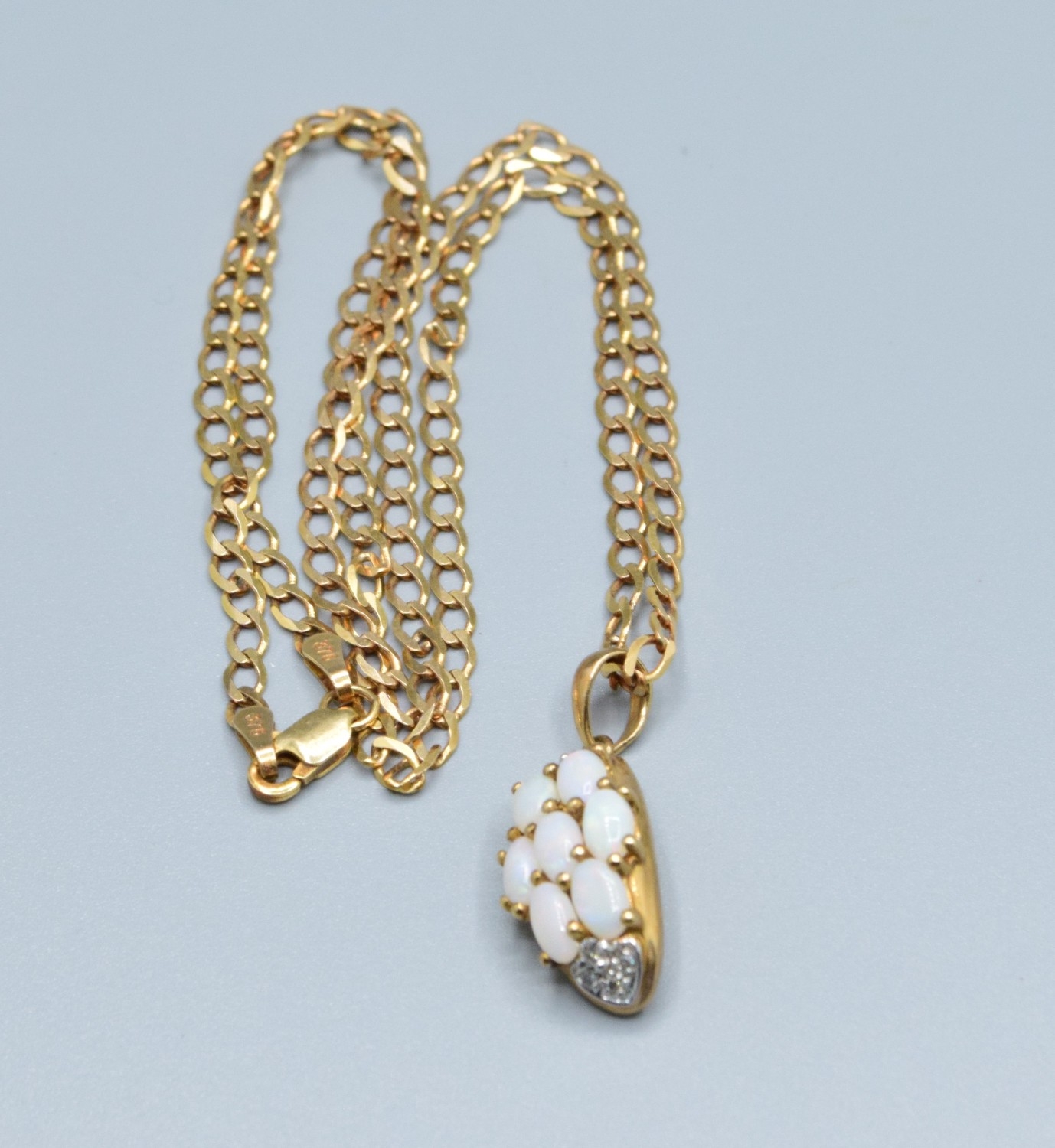 Excellent example of a fire Opal and Diamond drop pendant necklace on a gold chain all in 9ct gold, the pendant in a bow enclosed design is 19x10x6mm excluding the bale, the good flat link chain is 44cm long