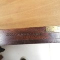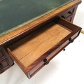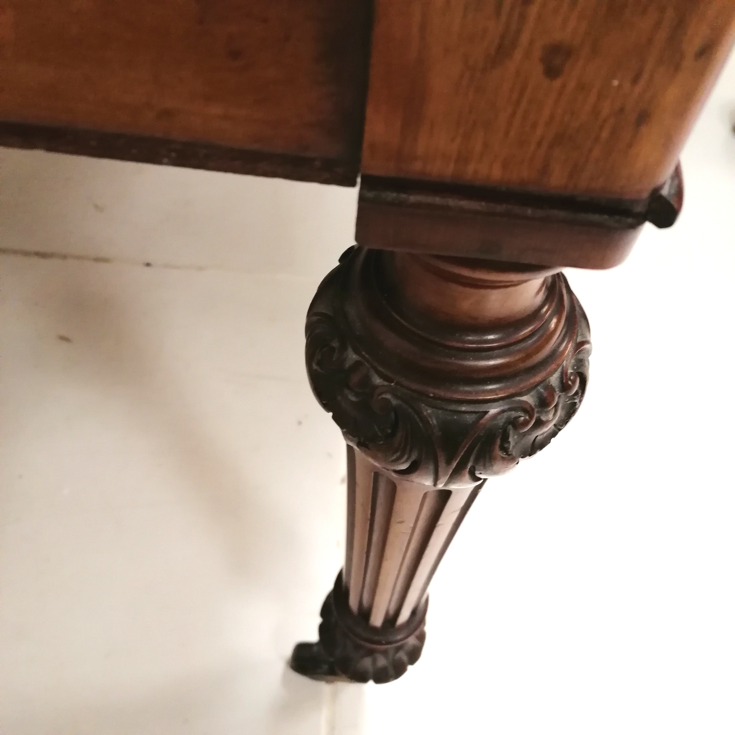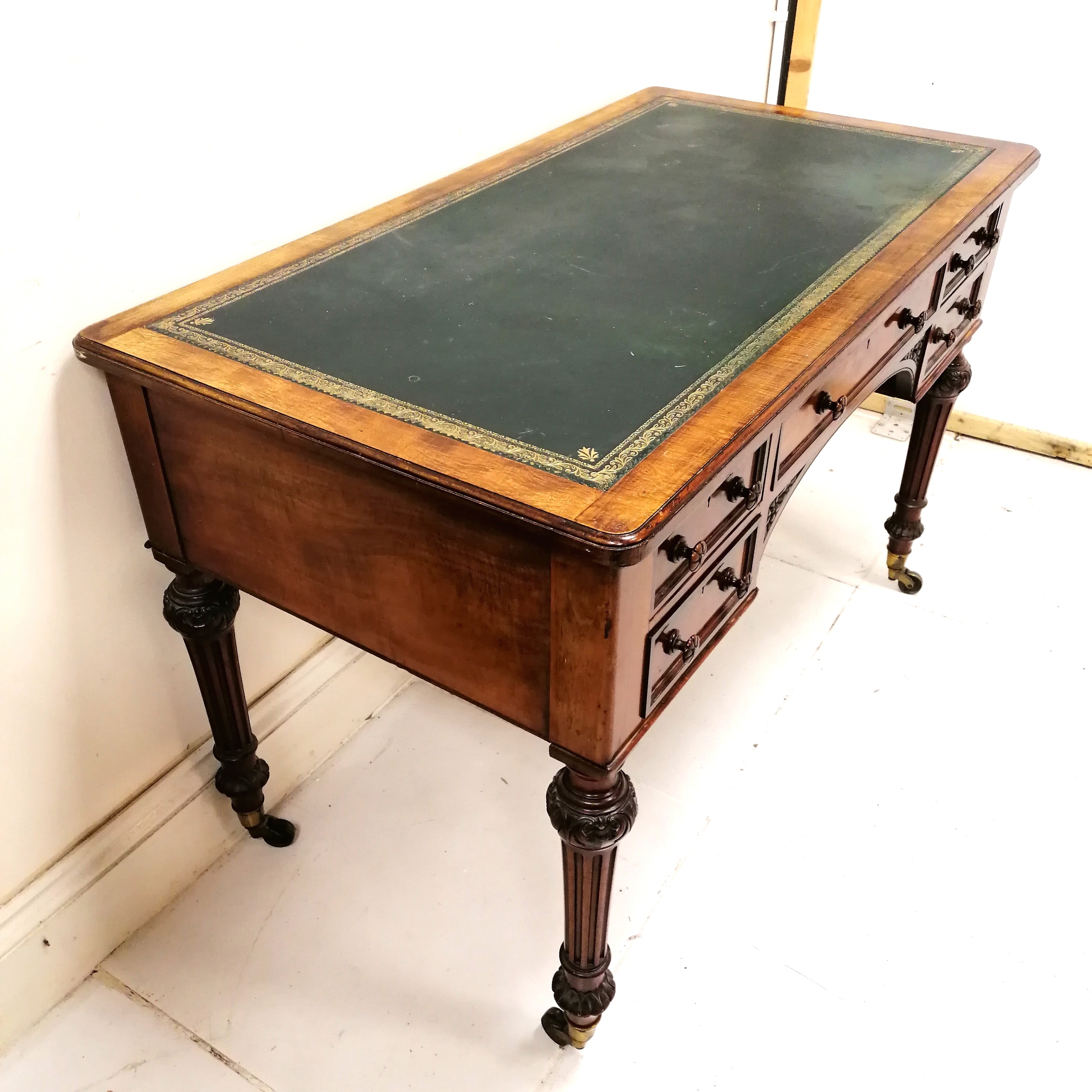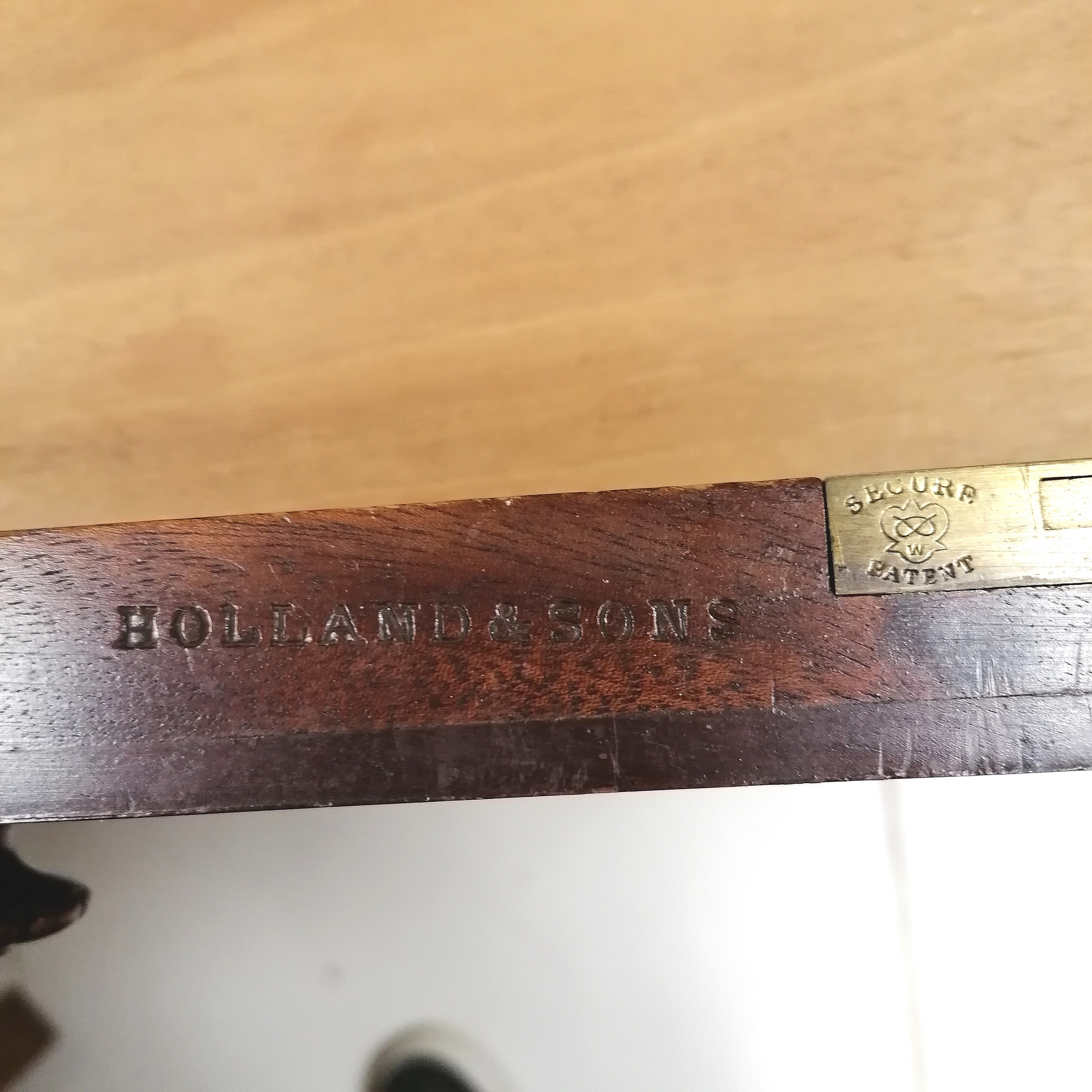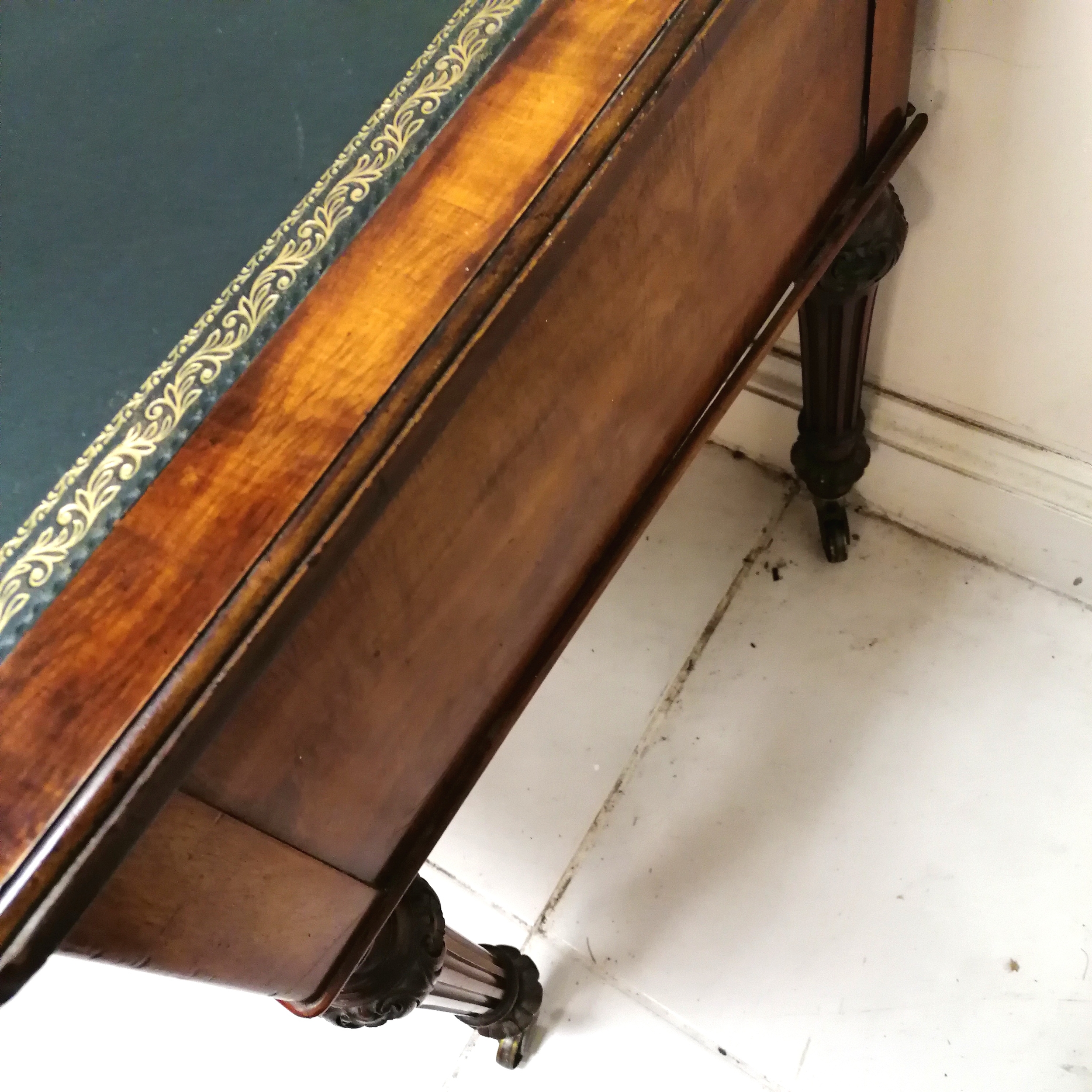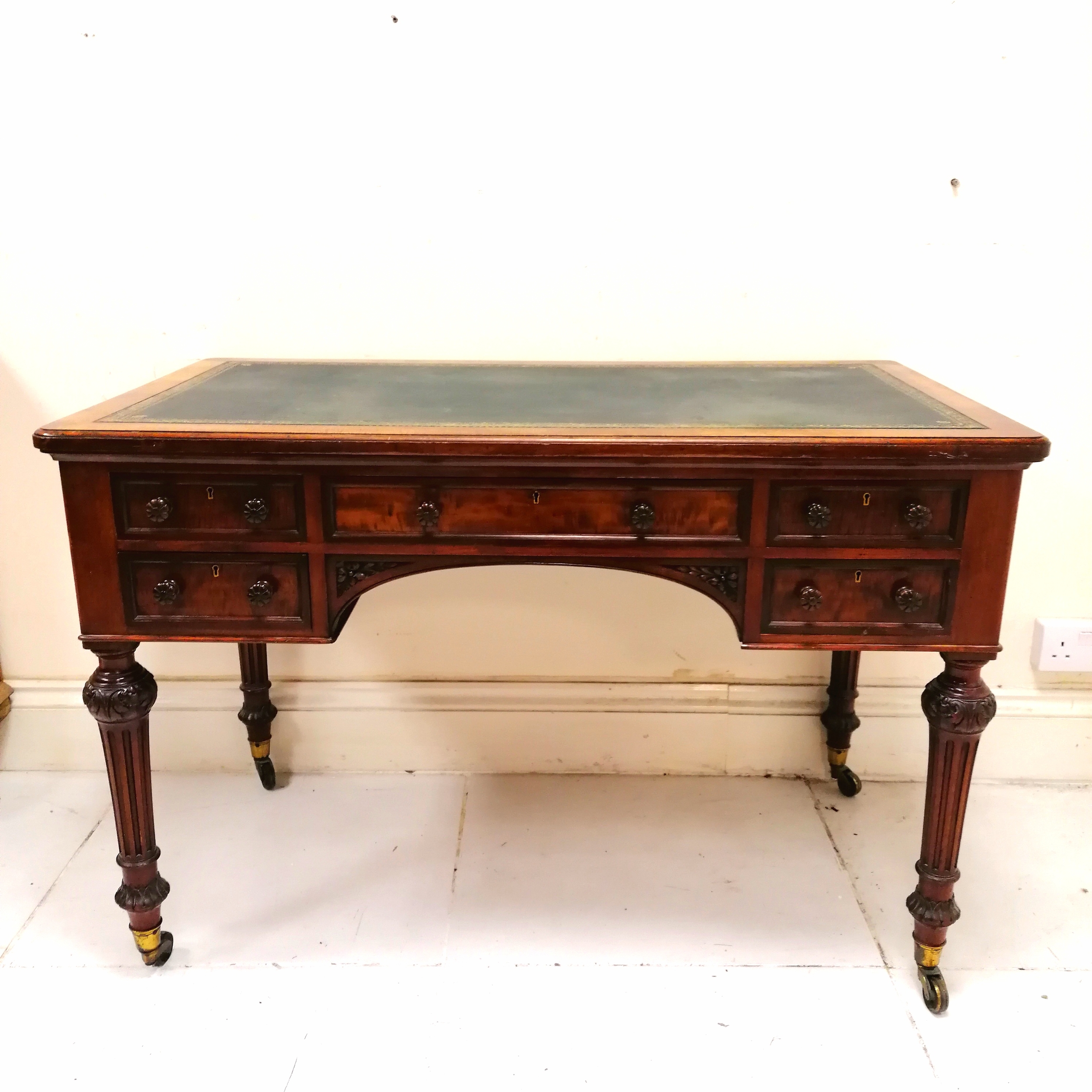 Holland and Sons antique mahogany desk with original green tooled leather top on reeded legs terminating 0n brass castors - has some losses to the beading but is present - 114cm x 63cm x 77cm