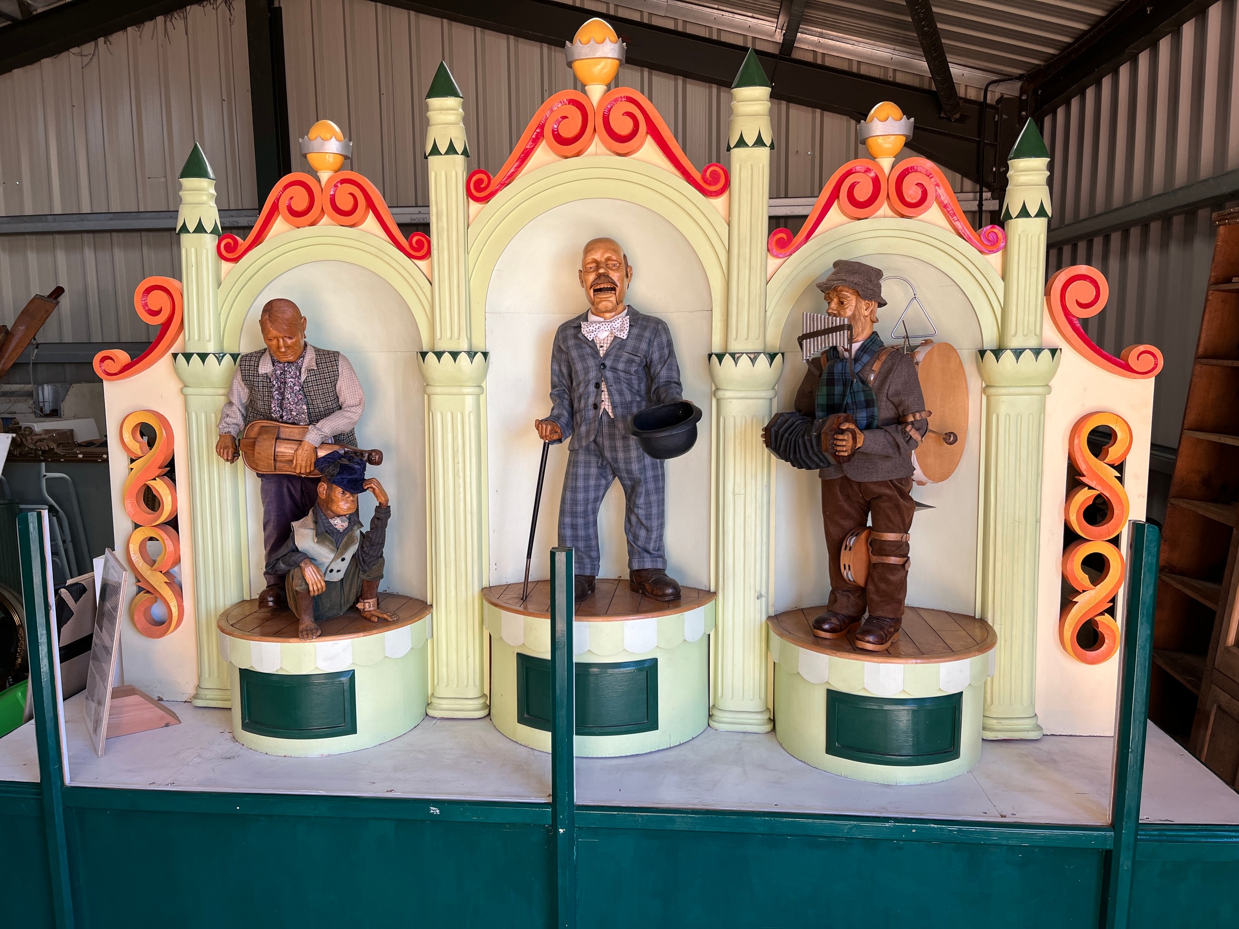 Eric Williamson - 'The Three Musicians' a large automaton group of three figures and monkey, carved wood with fabric detail, on base with arched backdrop, electrically operated, W280cm D120cm H240cm. Commissioned by Pat Osborne