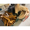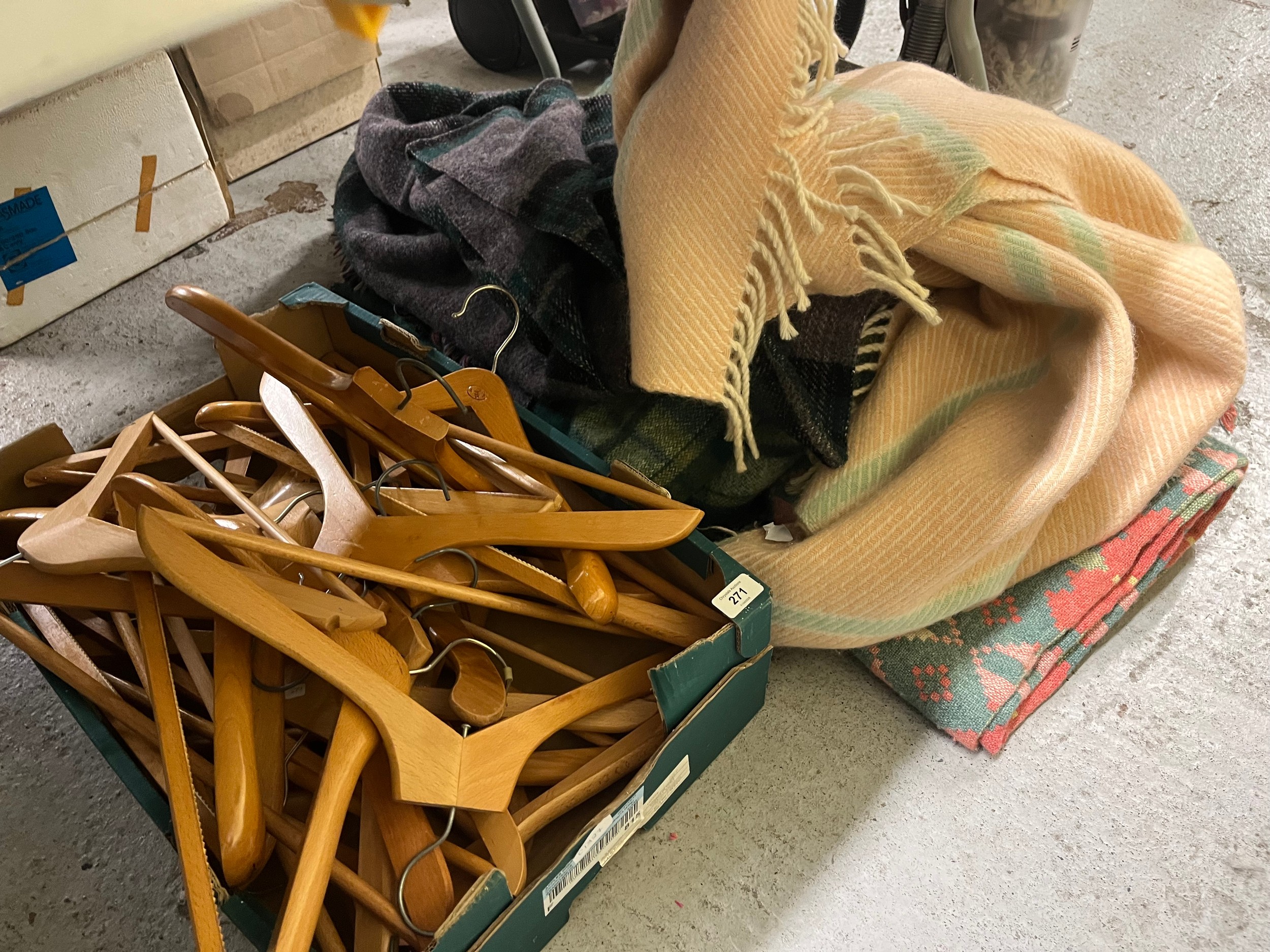 Pile of blankets, plus a box of wooden clothes hangers