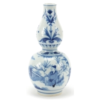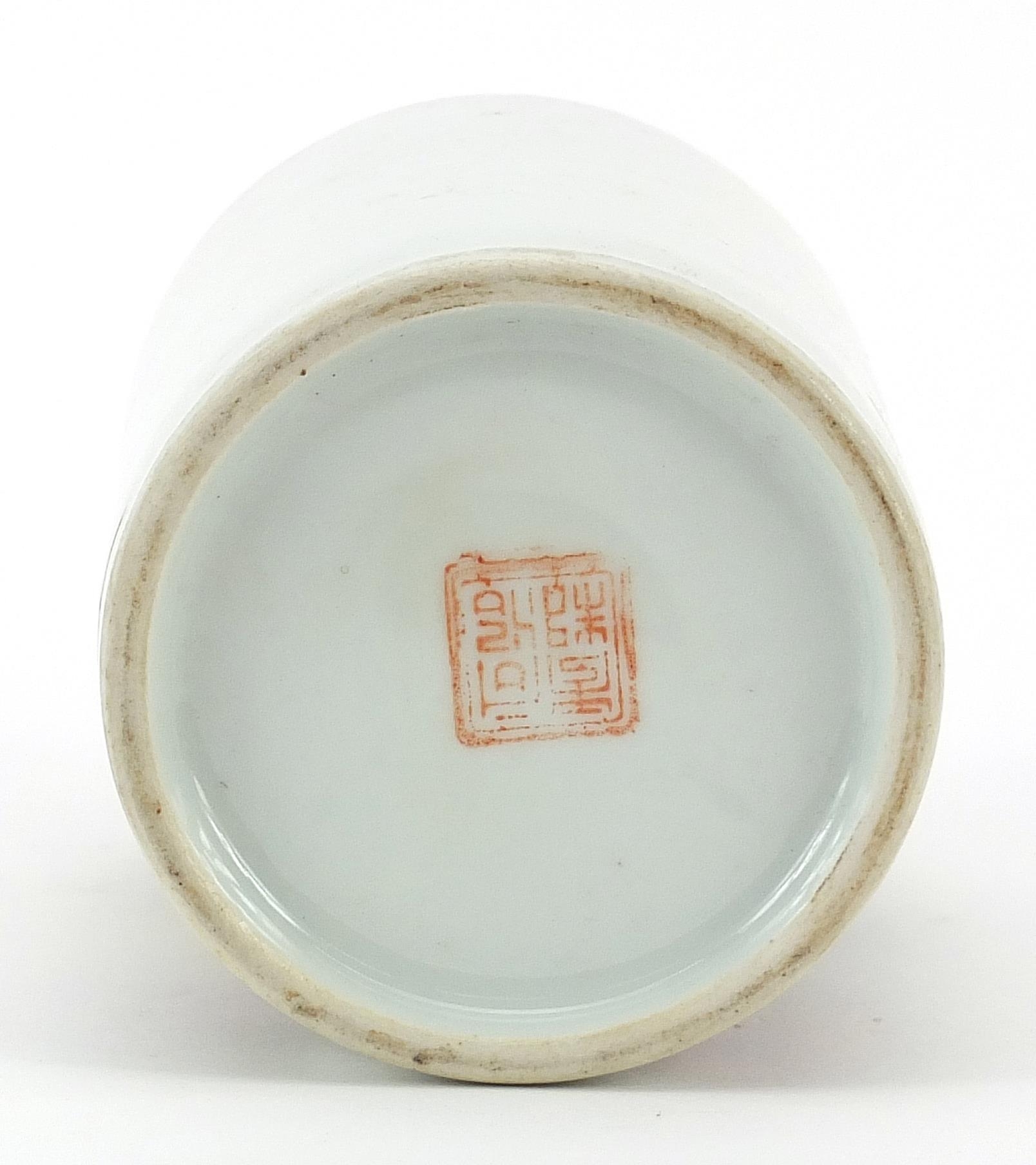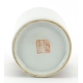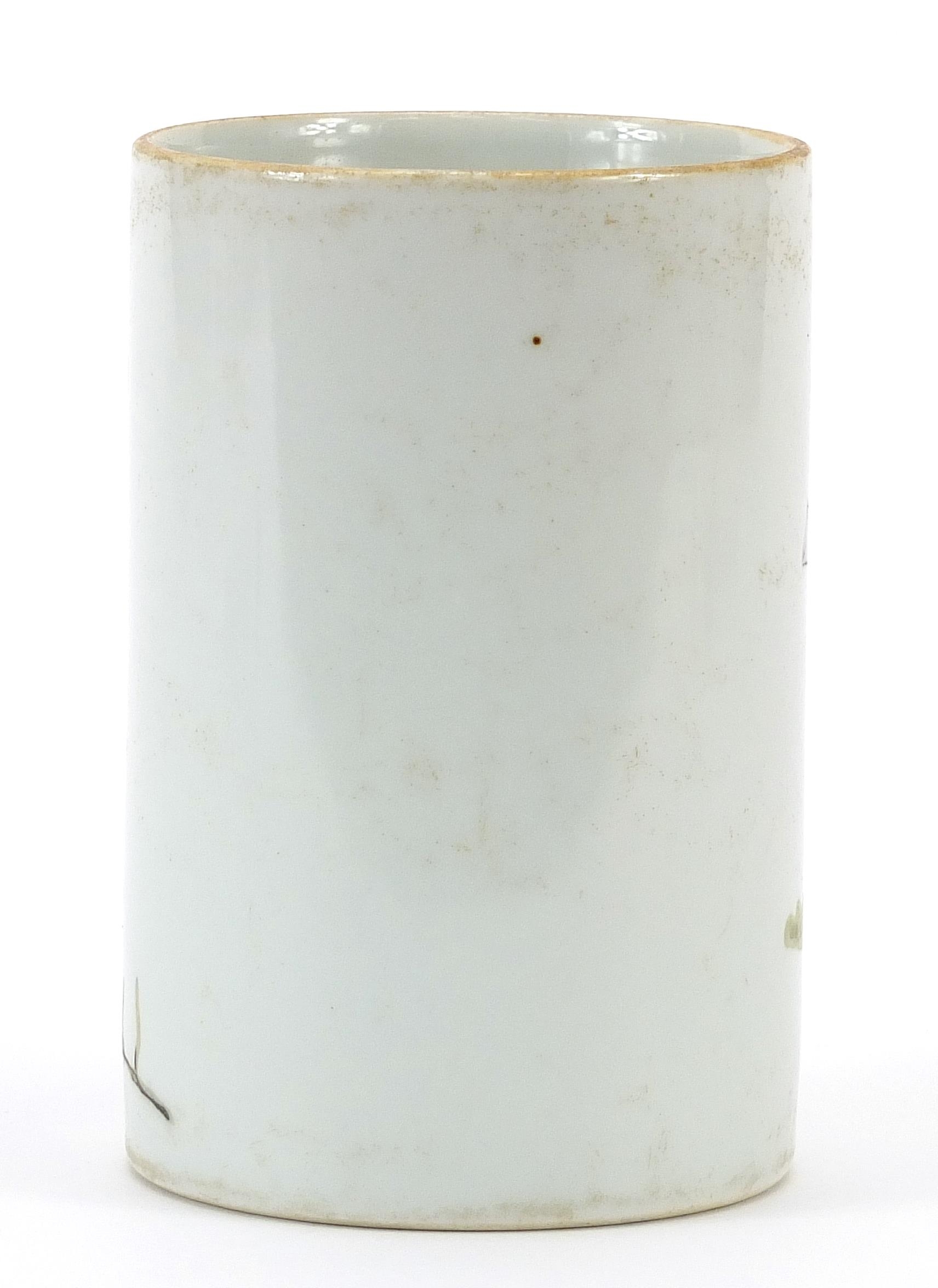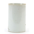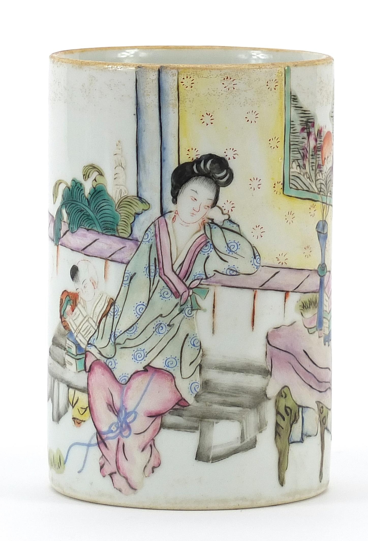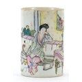 Chinese porcelain brush pot hand painted in the famille rose palette with two figures in an interior, character marks to the base, 11.5cm high