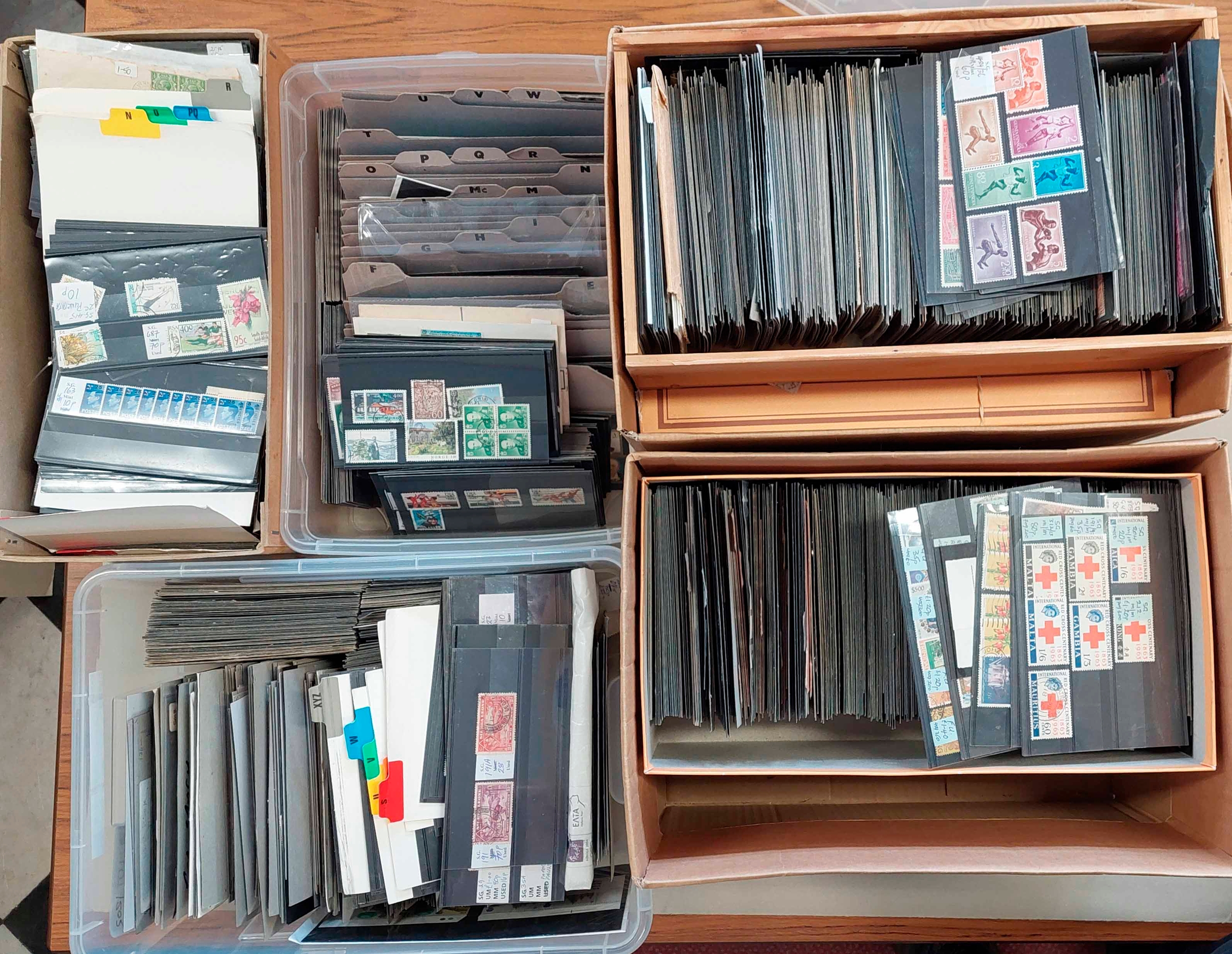 EXTENSIVE WORLDWIDE ACCUMULATION: Five boxes containing mainly common used ranges of stamps (some mint), on display cards. Great diversity with good potential as stock or for expanding global collections. (Many 1000s)
