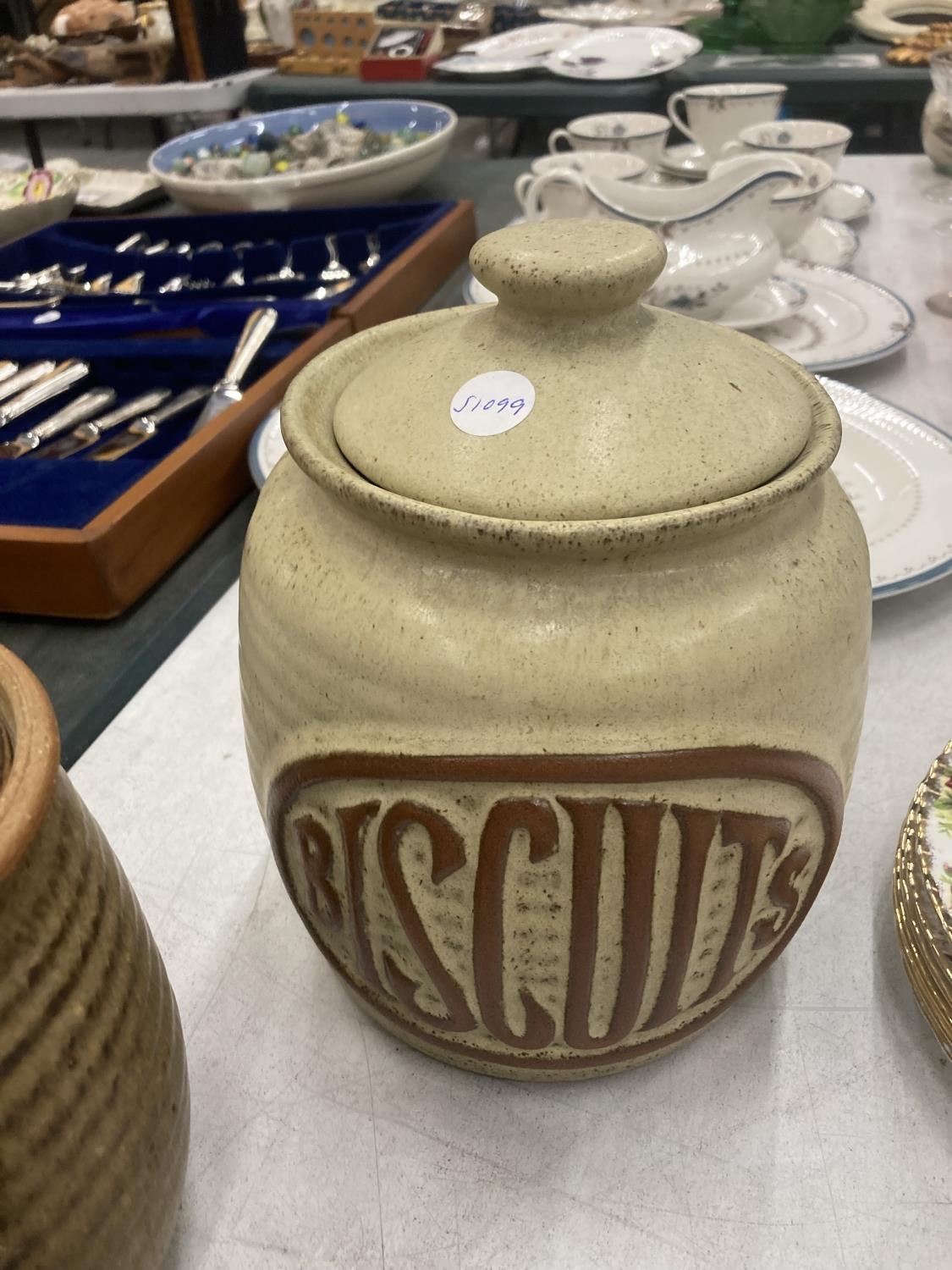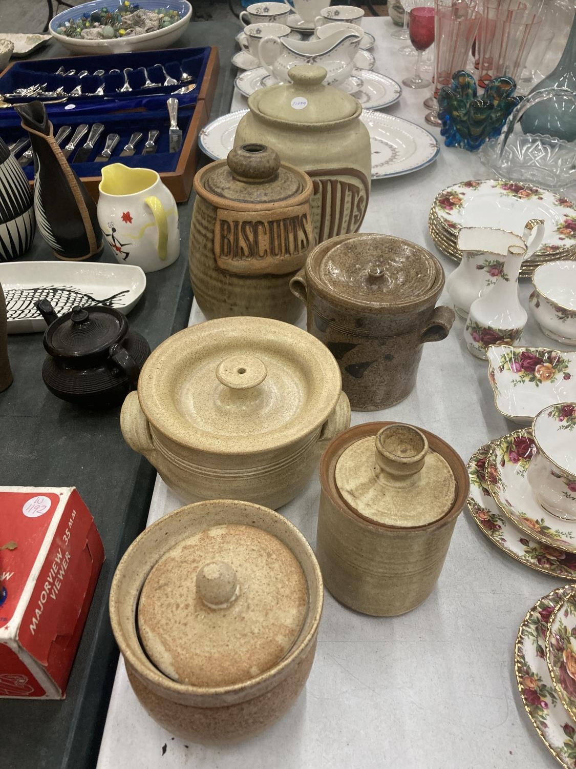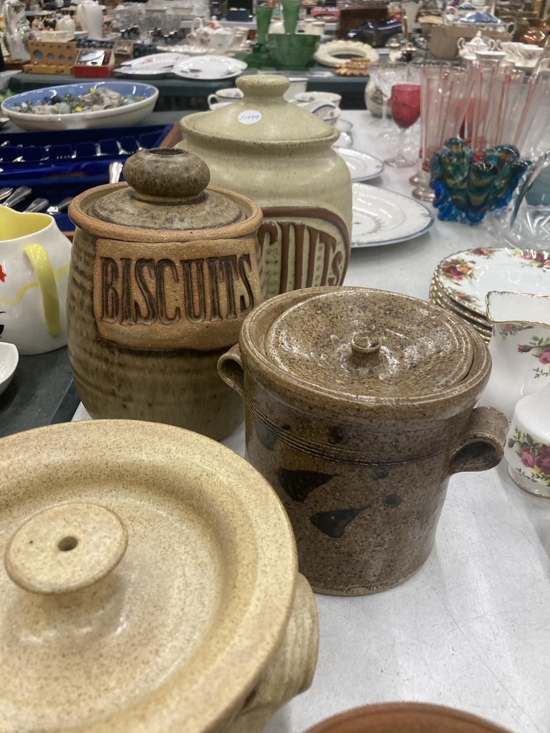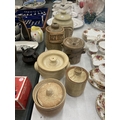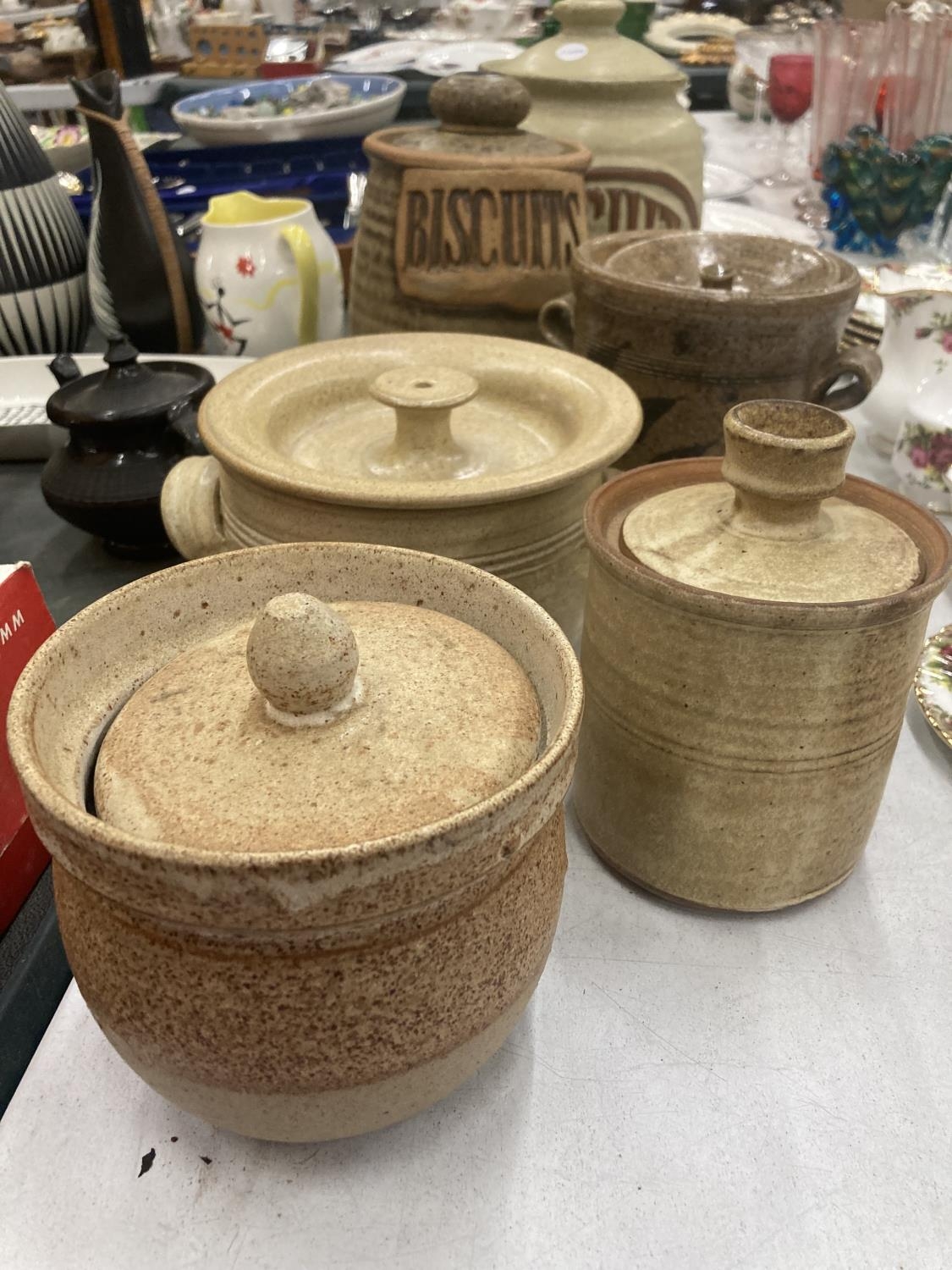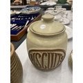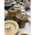 A QUANTITY OF EARTHENWARE STORAGE JARS TO INCLUDE BISCUITS, ETC
