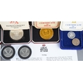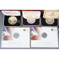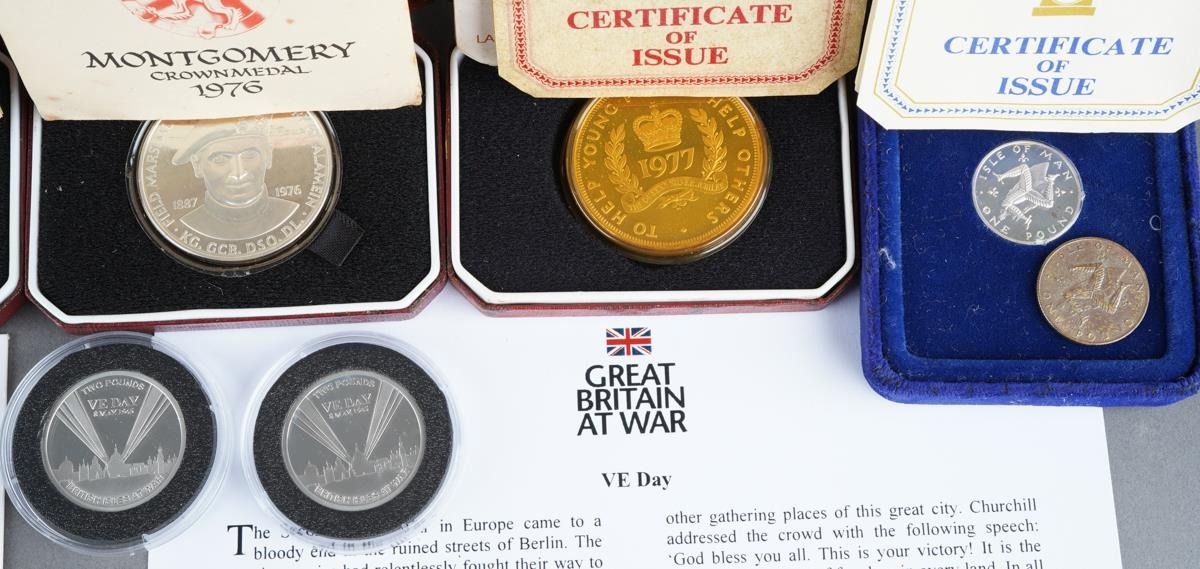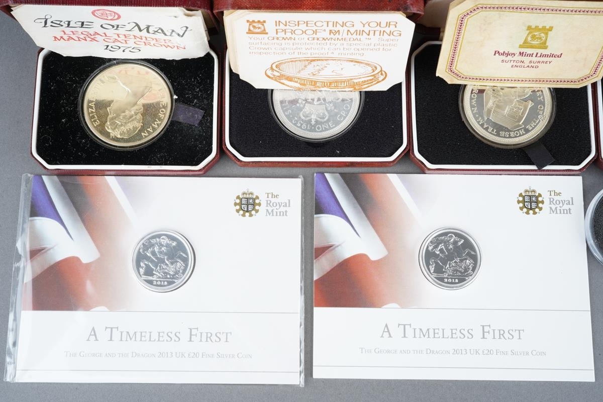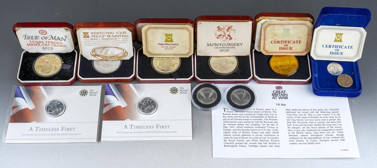 A collection of silver, silver plated and other commemorative coins, including two Royal Mint 2013 The George & Dragon £20 fine silver coins, 15.71 grams approx, five cased Pobjoy Mint sterling silver crowns, one gold plated, commemorating QEII Silver Jubilee, Mongomery 1976, Isle of Man Manx Cat 1975, Isle of Man horse tram 1976, all with certificates, a cased Pobjoy Mint silver £1 coin and another example plated, two QEII 2010 proof VE Day silver coins in perspex capsules