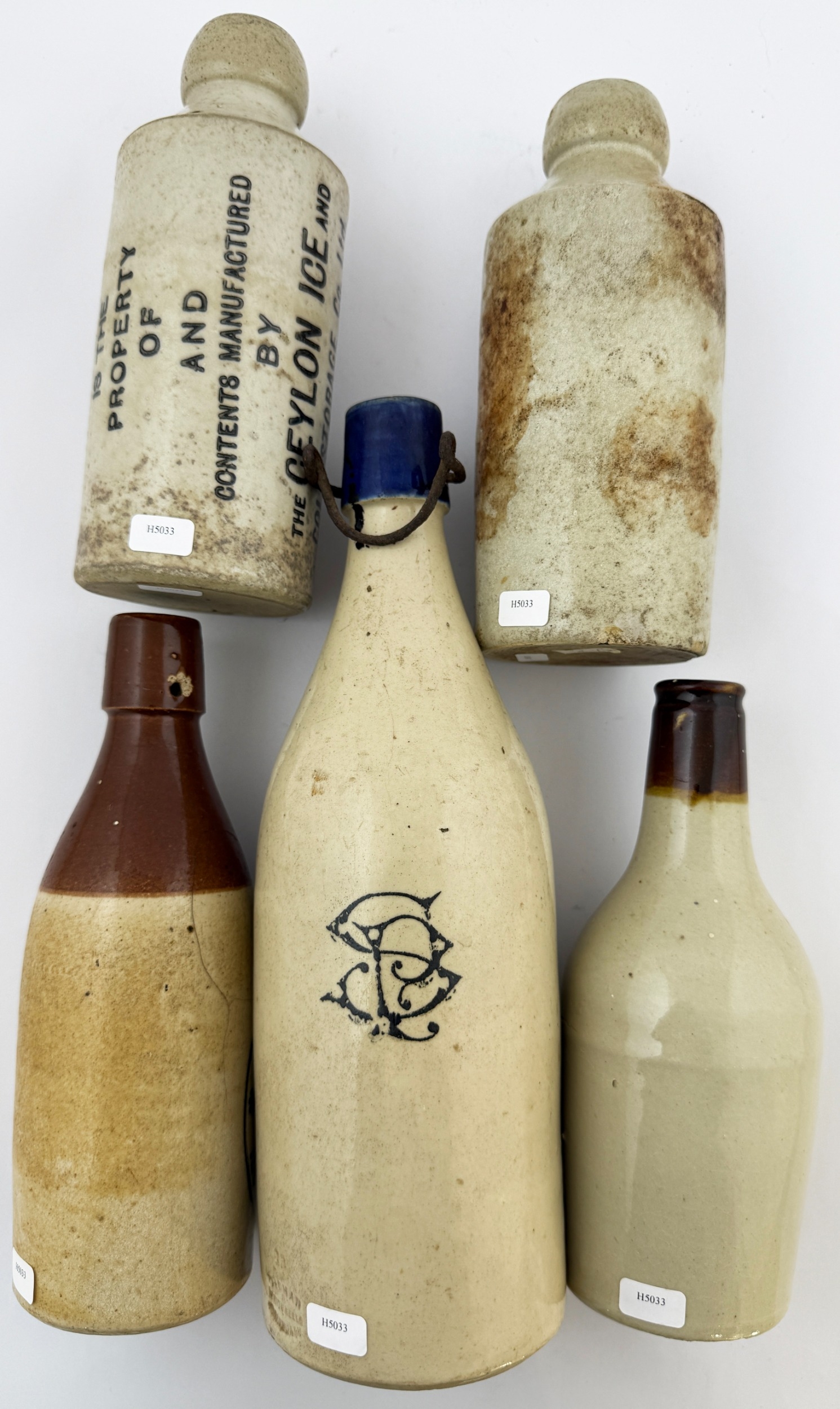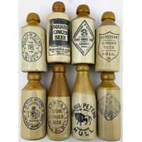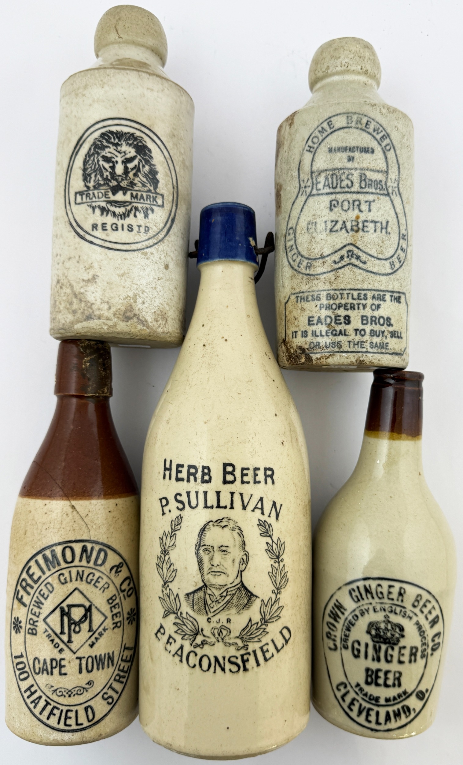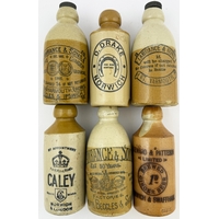 GINGER BEER GROUP. Tallest 10.5ins. Overseas, Cape Town & Cleveland. Some pict. Chips & hairlines. (5)