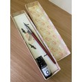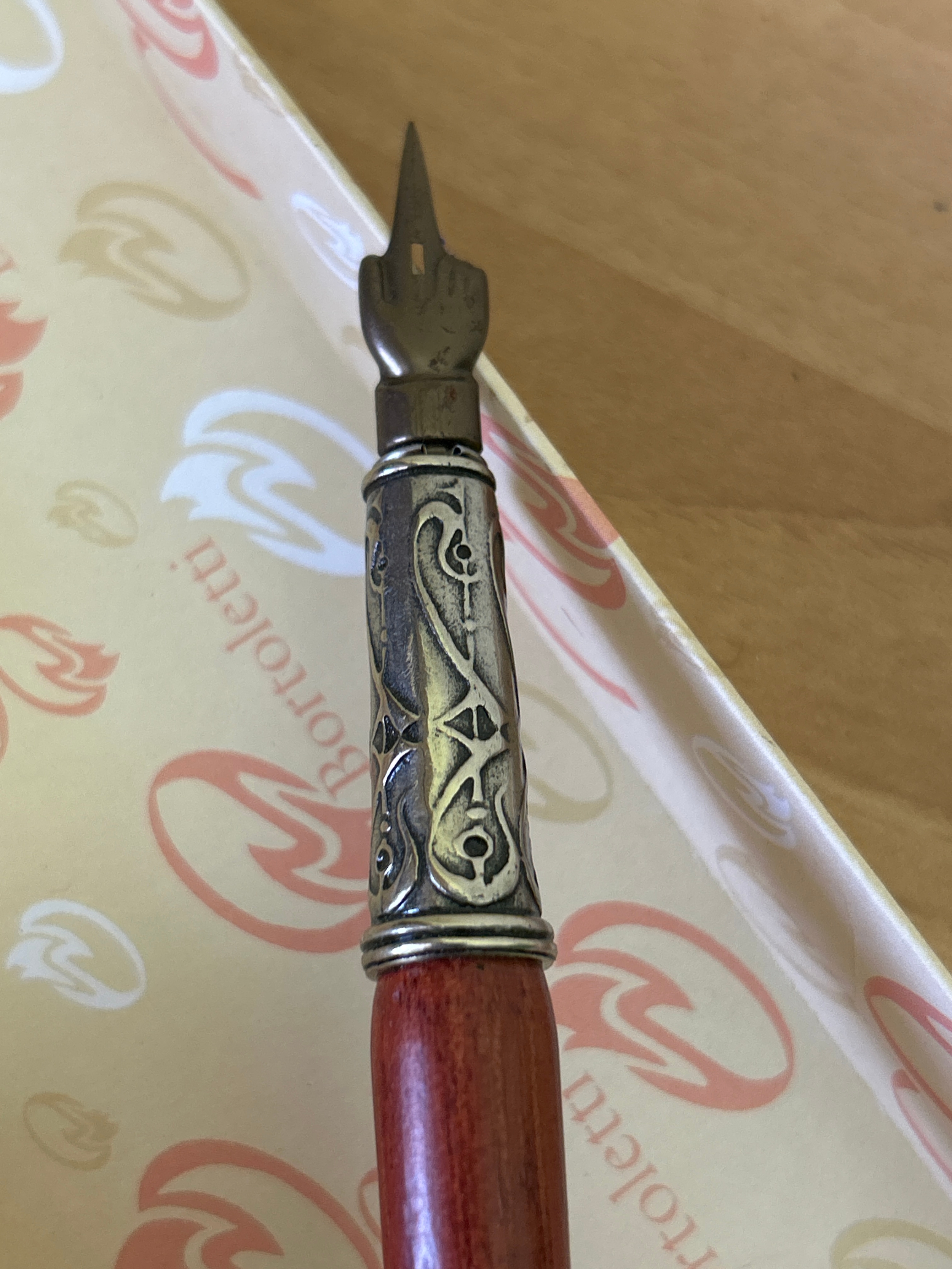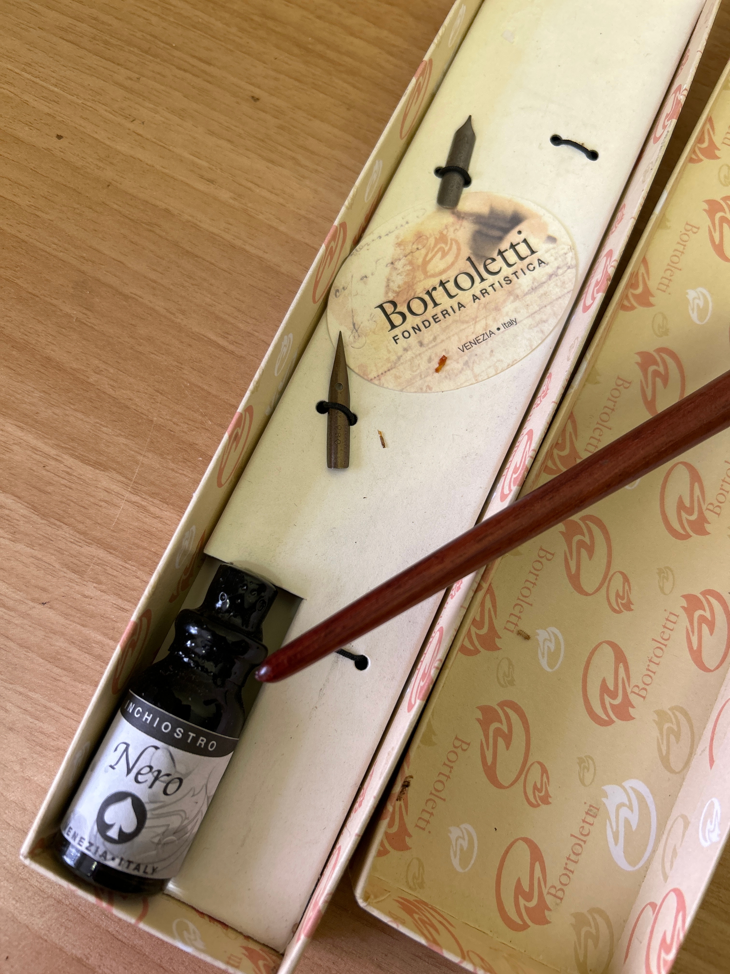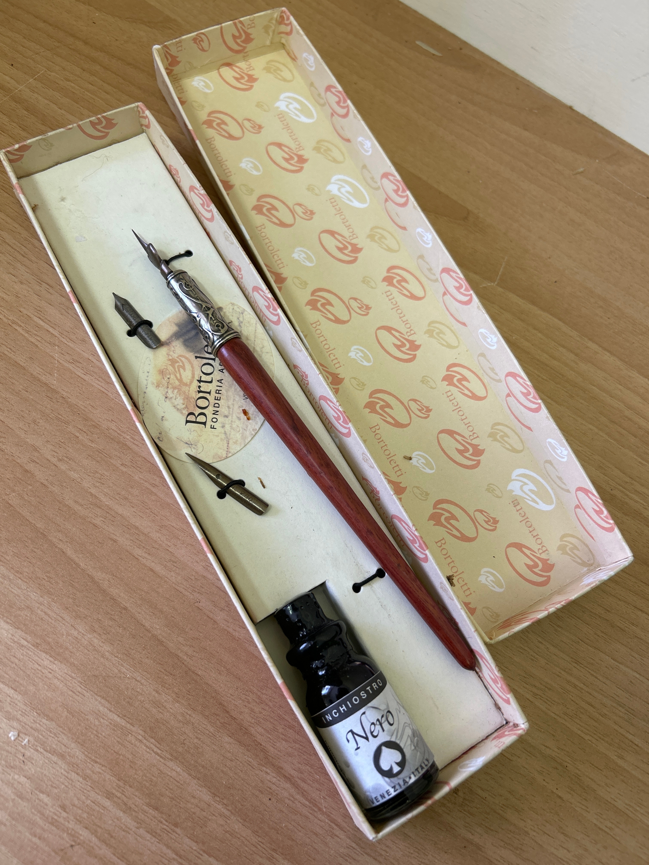 A Venetian dip pen with 2 spare nibs & ink in box, by Bortoletti, Venice
